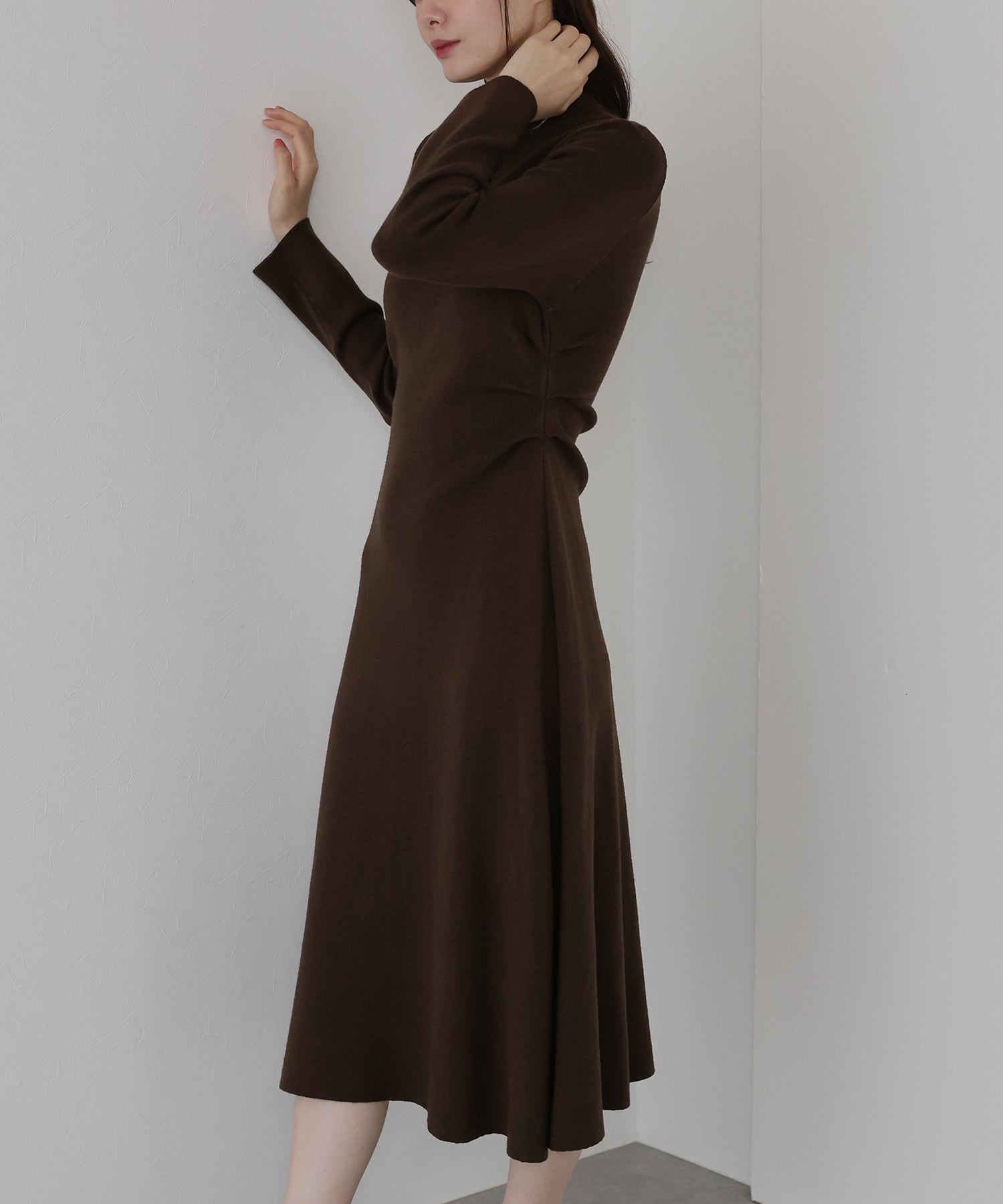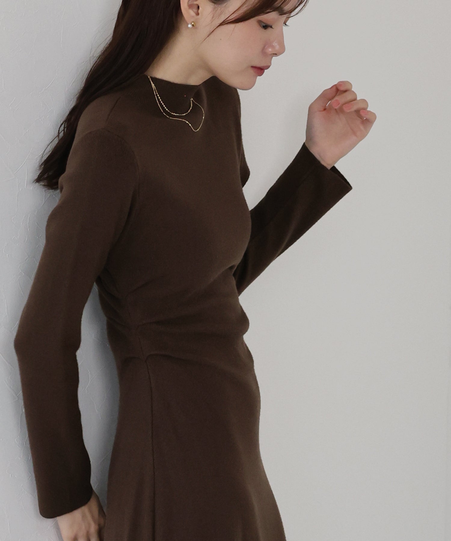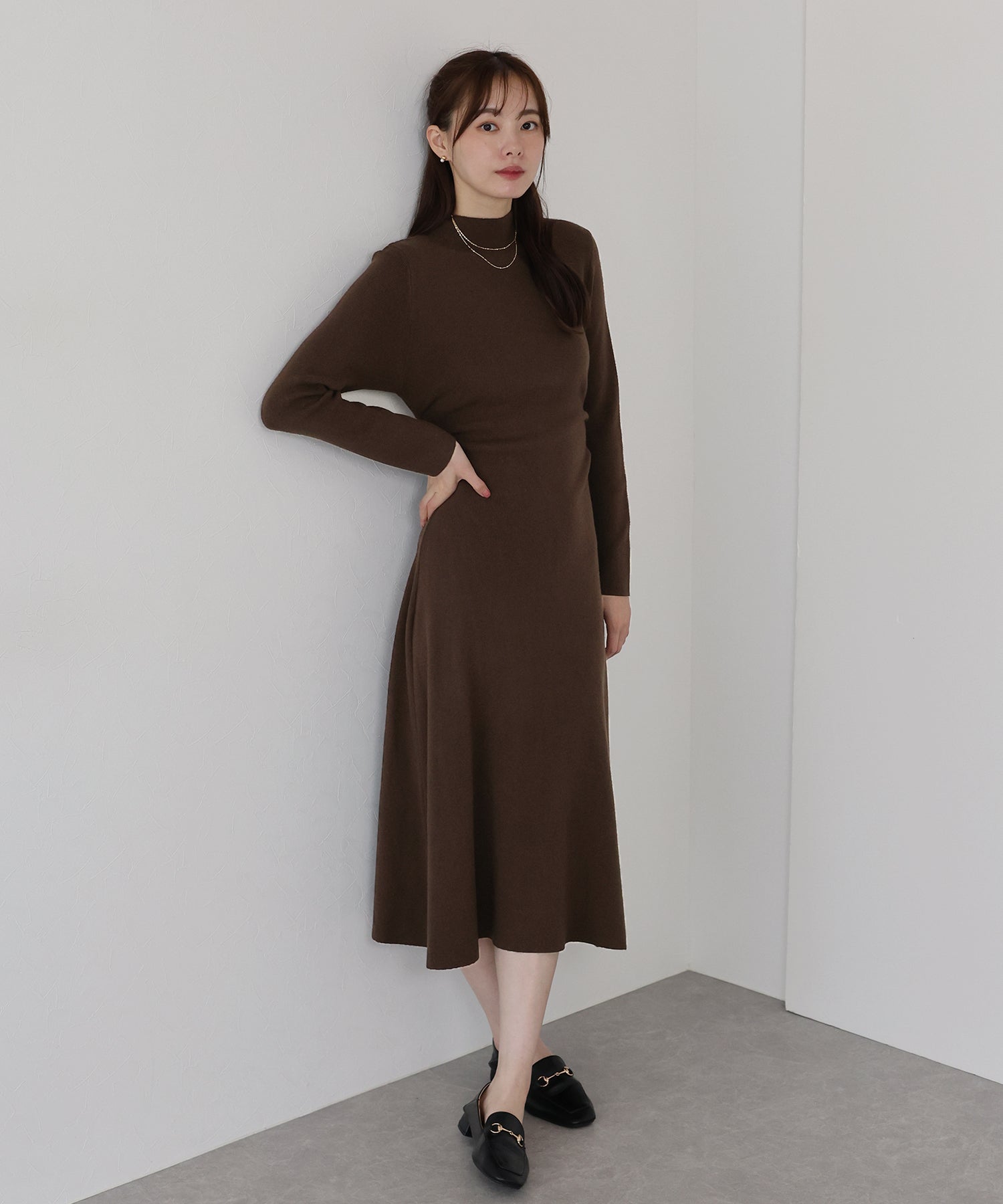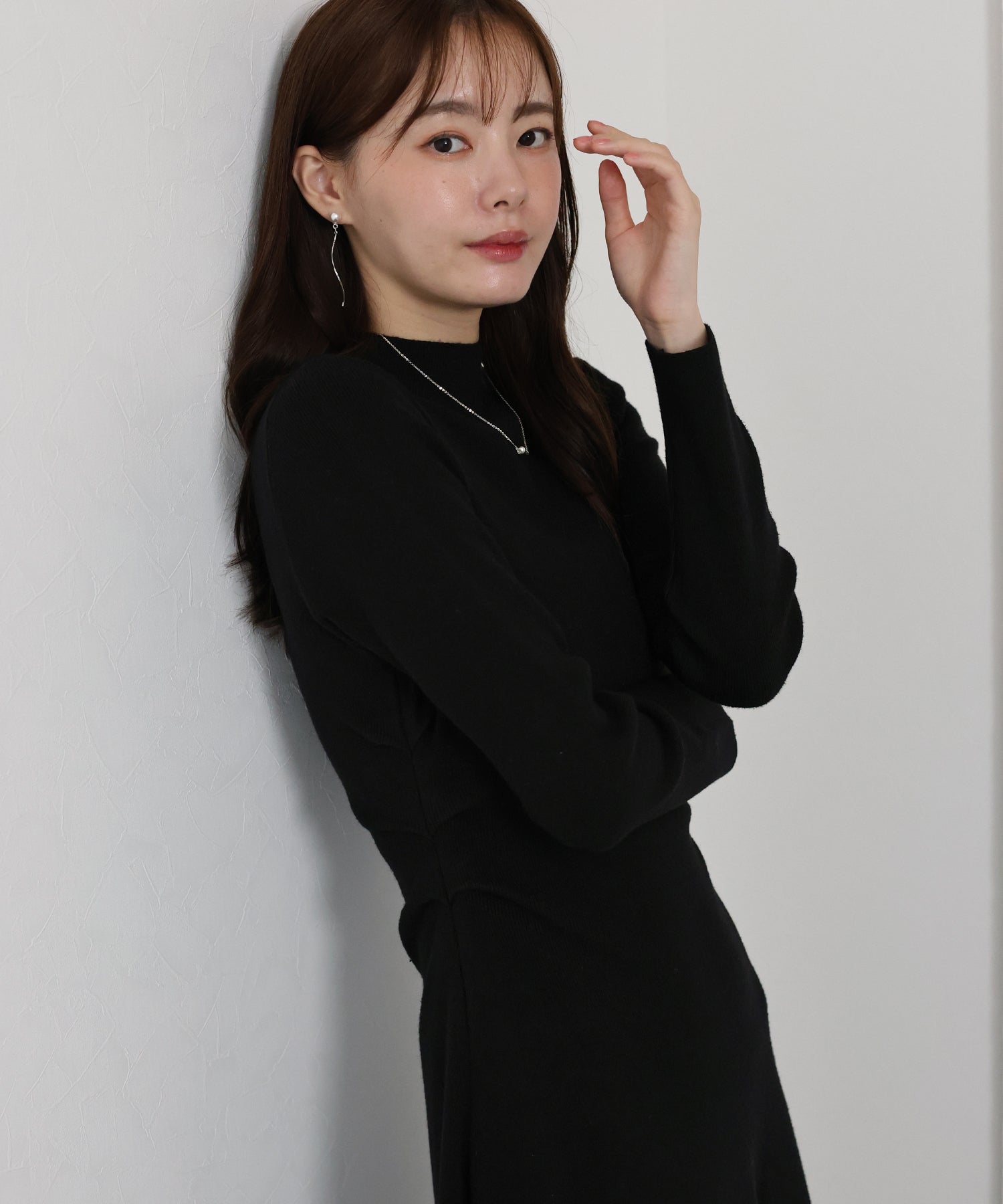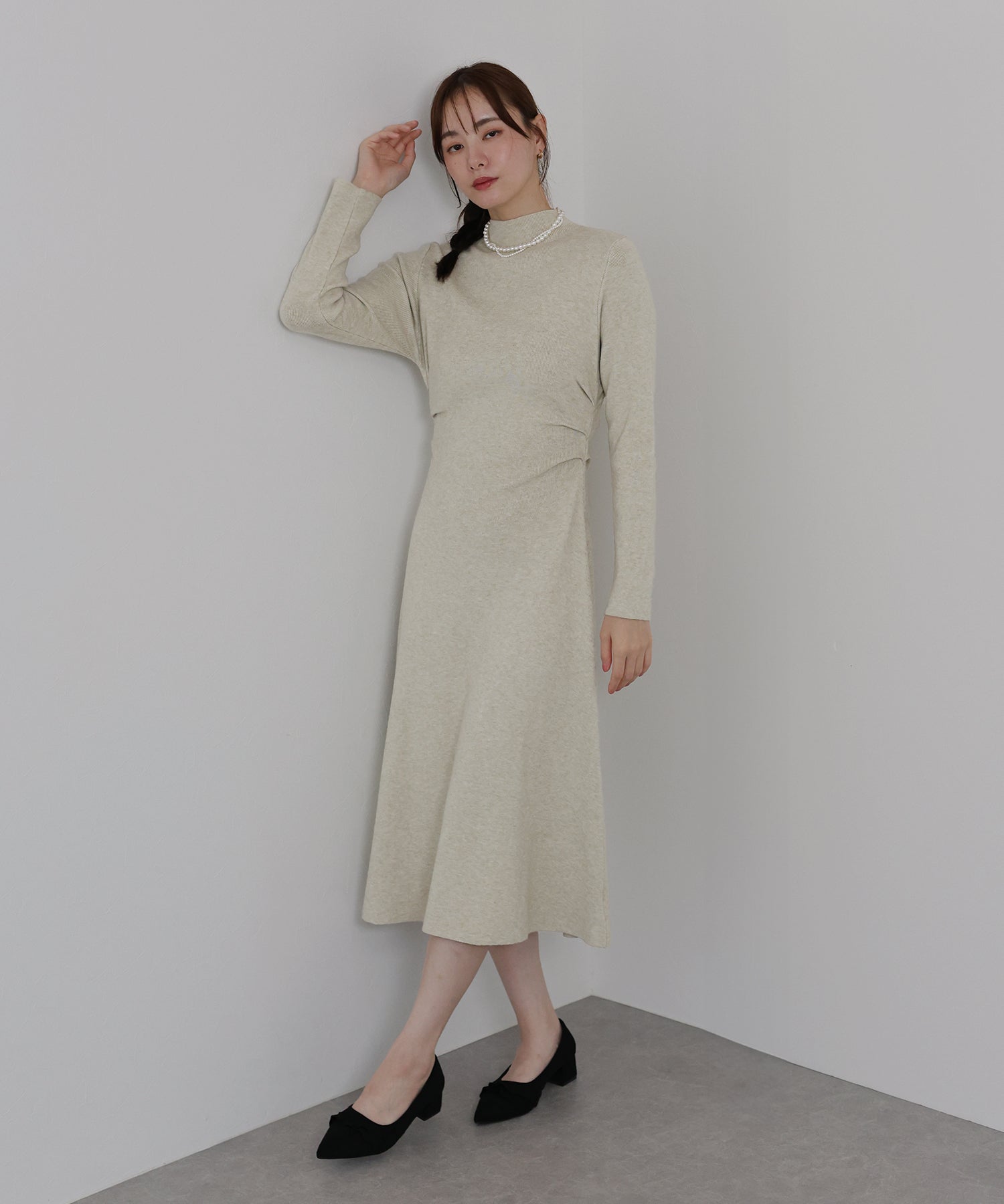 ハイネックとサイドタックが上品な印象のニットワンピース。