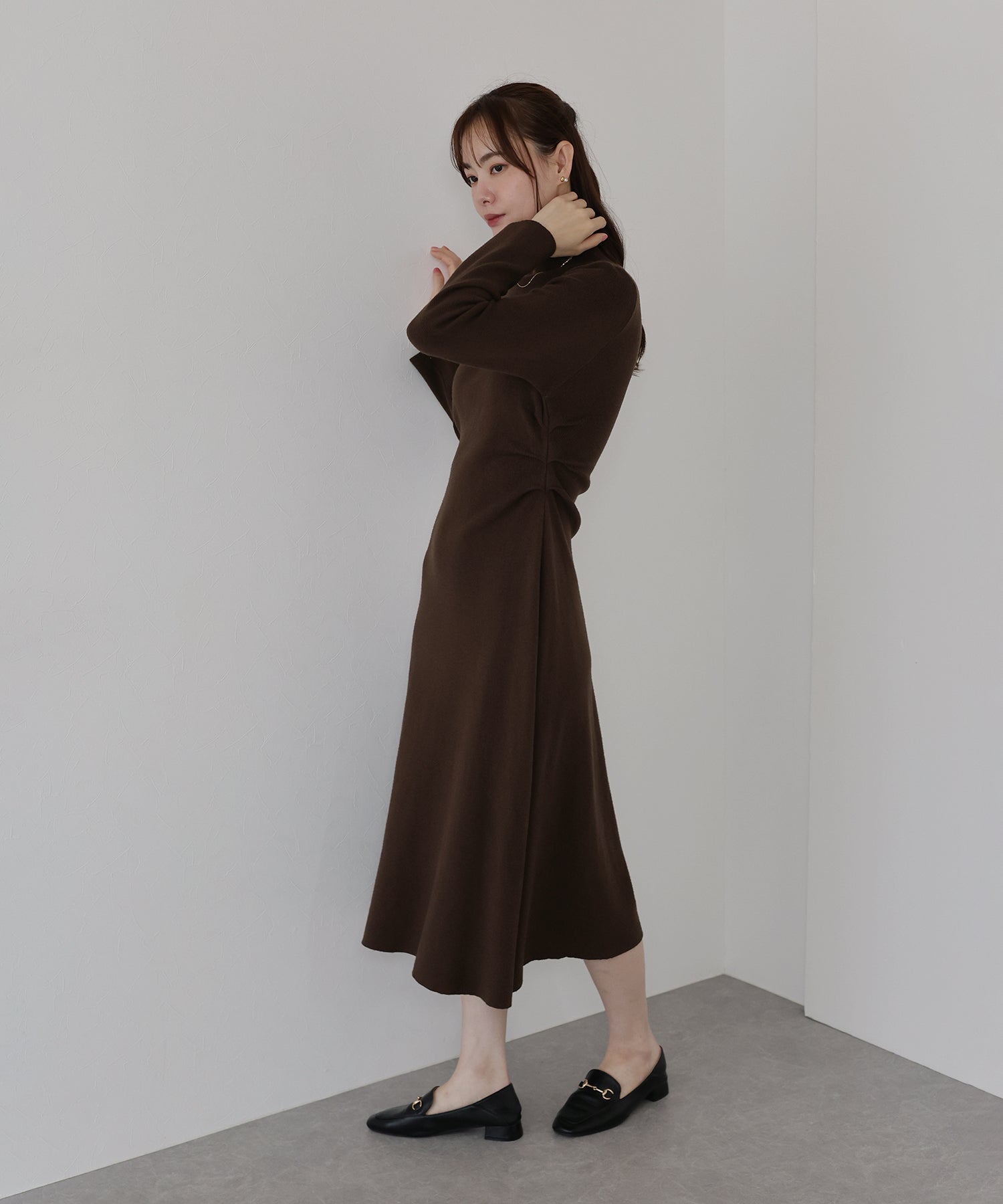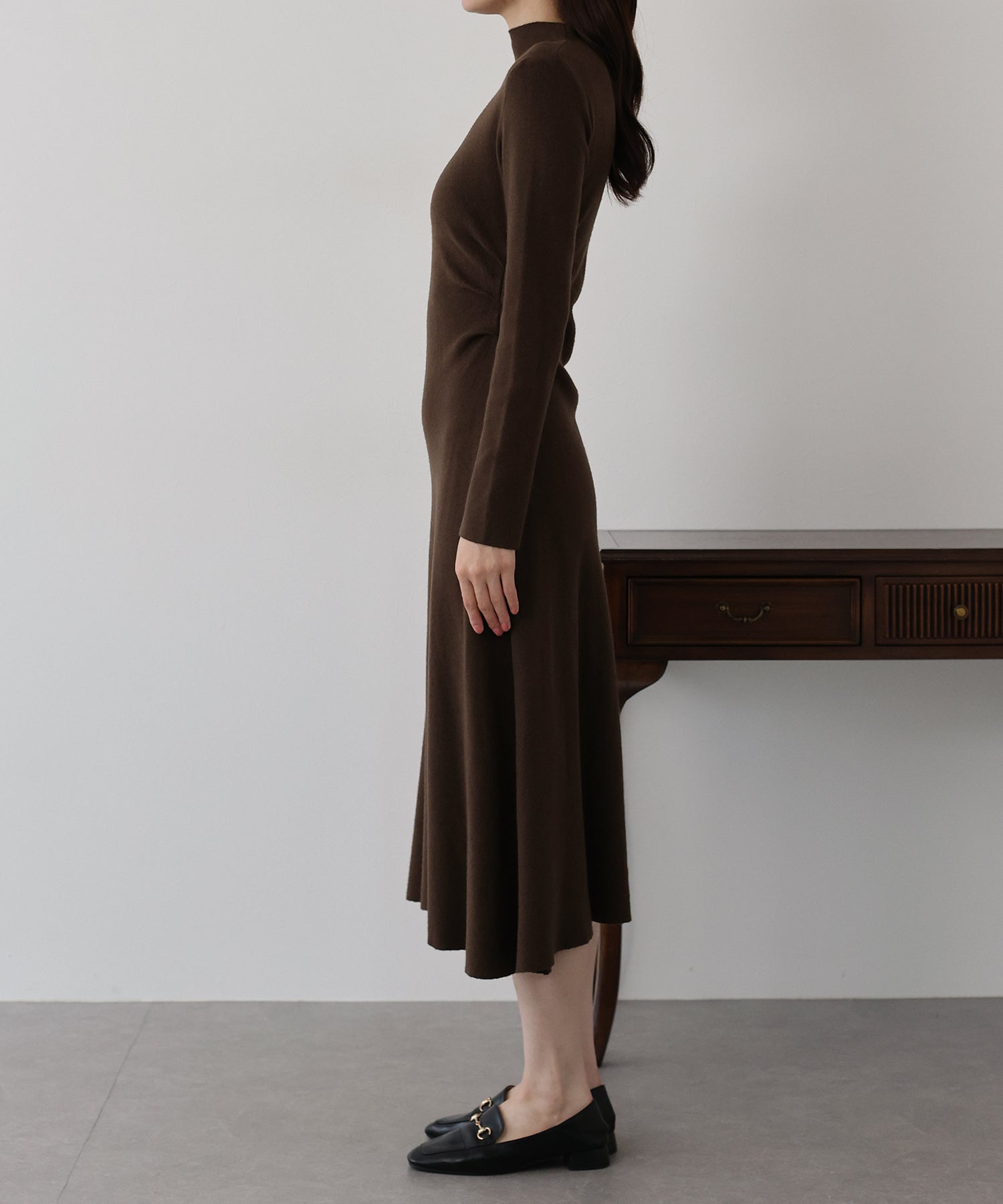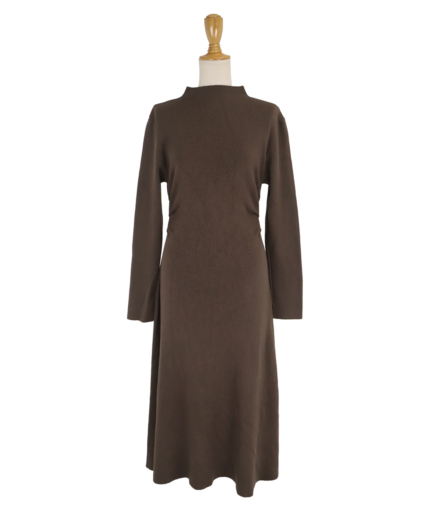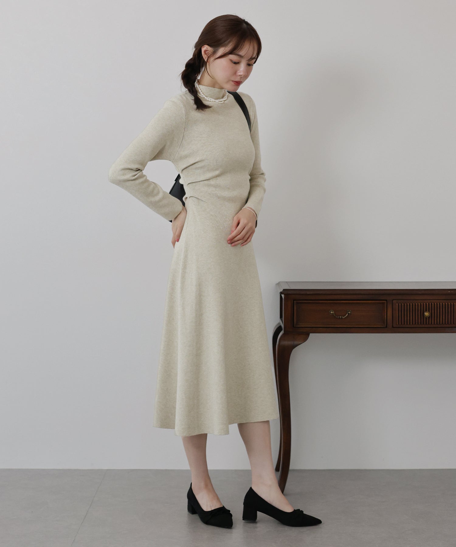 ハイネックとサイドタックが上品な印象のニットワンピース。