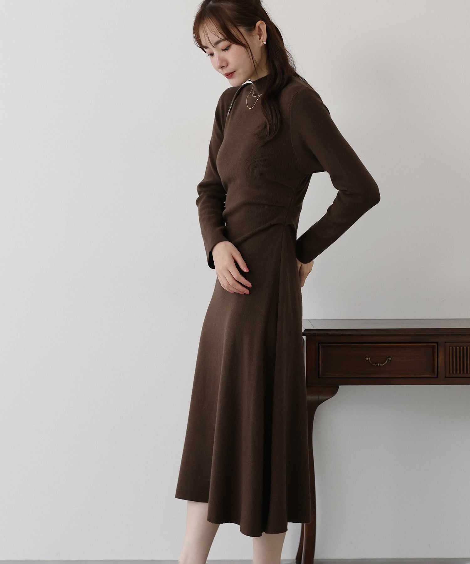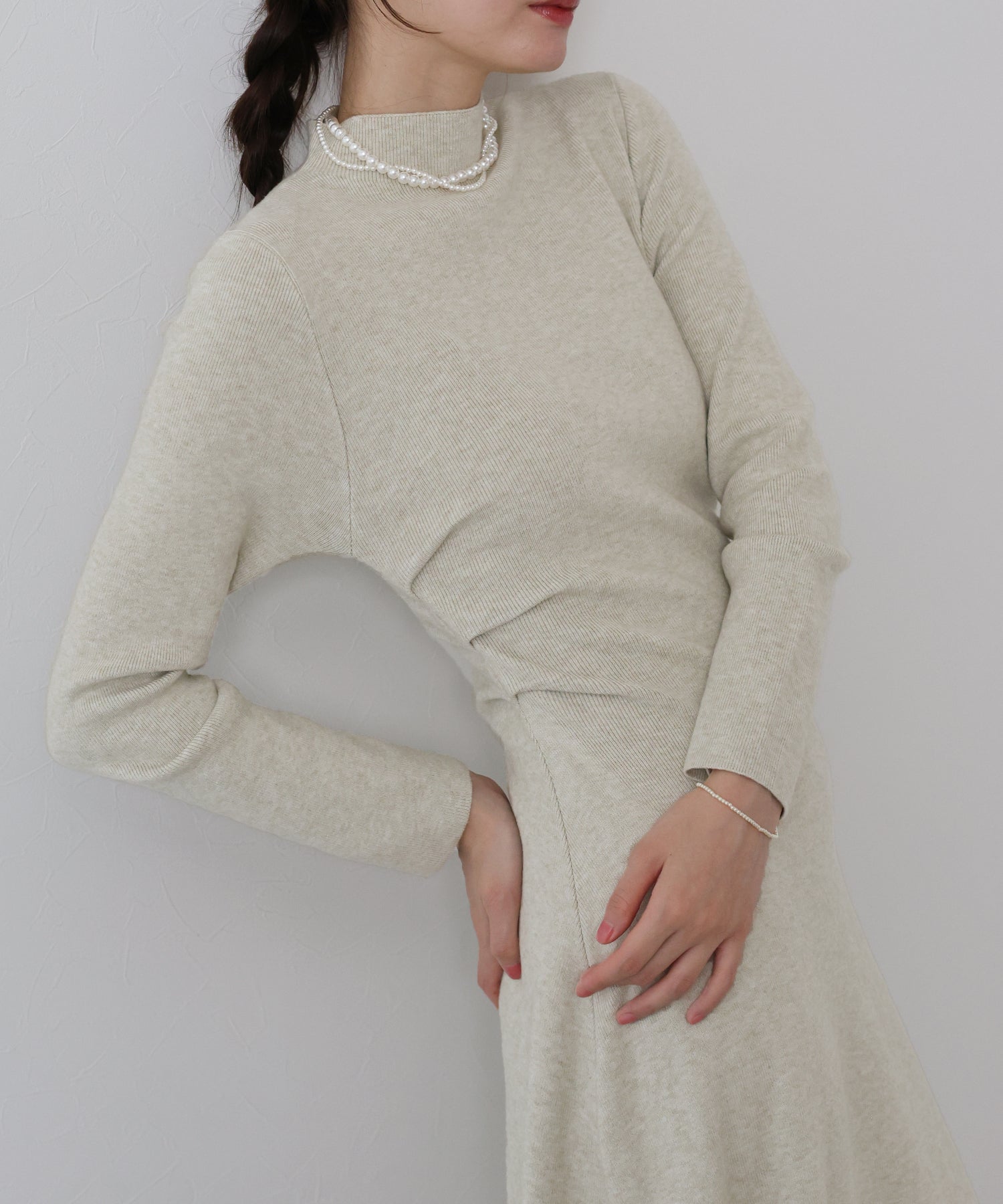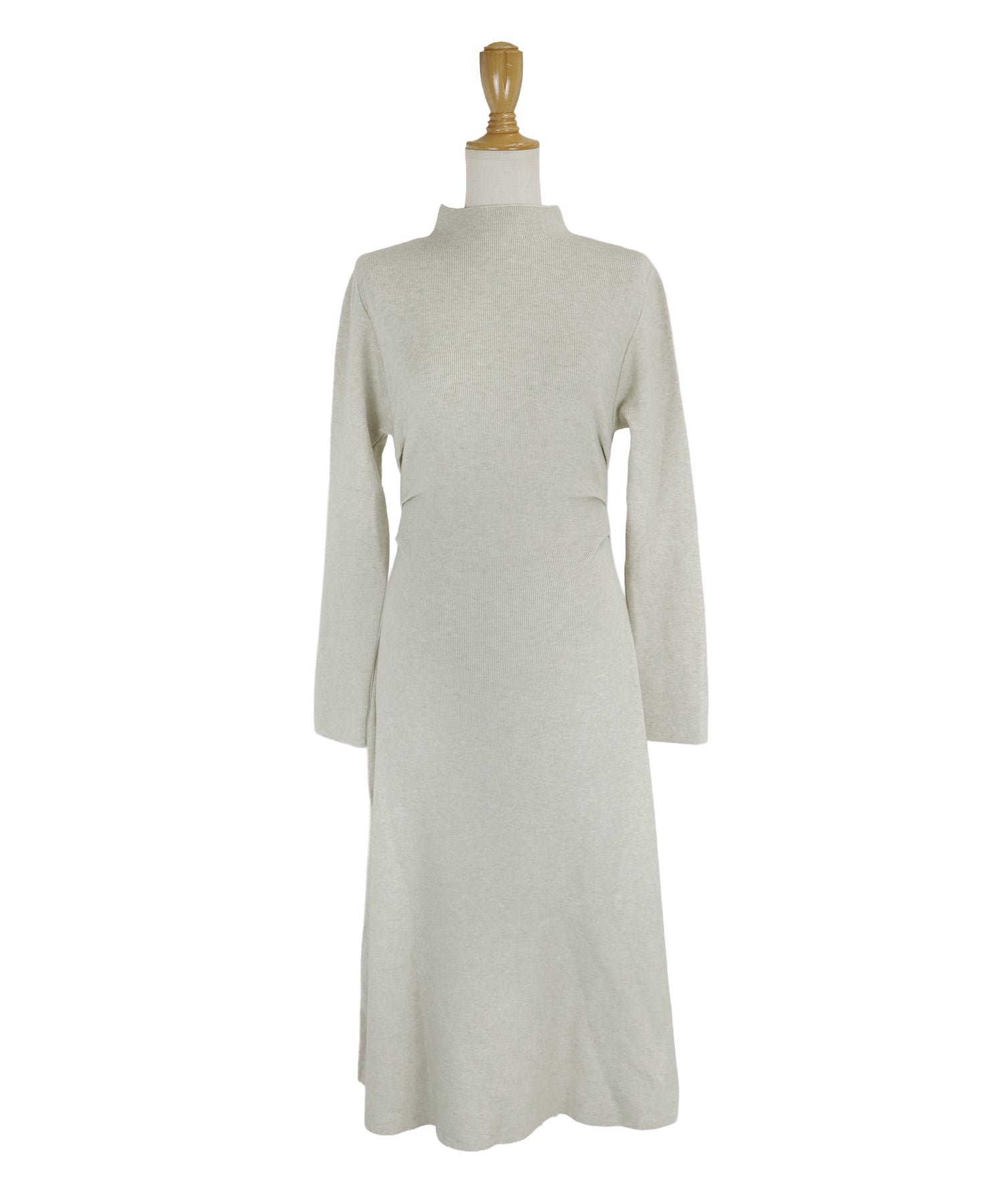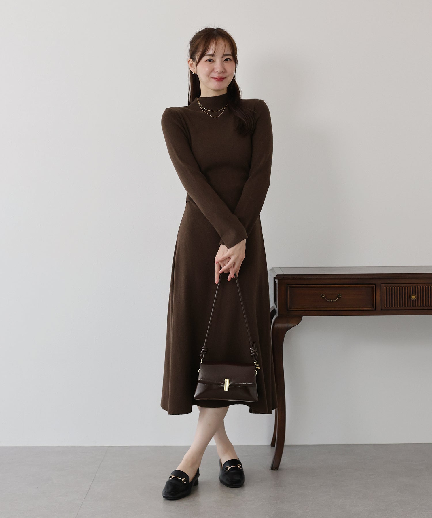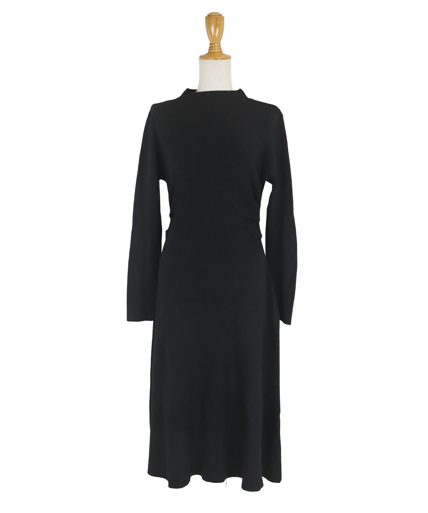 ハイネックとサイドタックが上品な印象のニットワンピース。