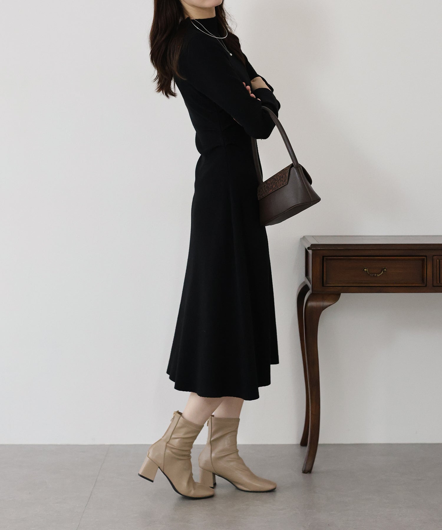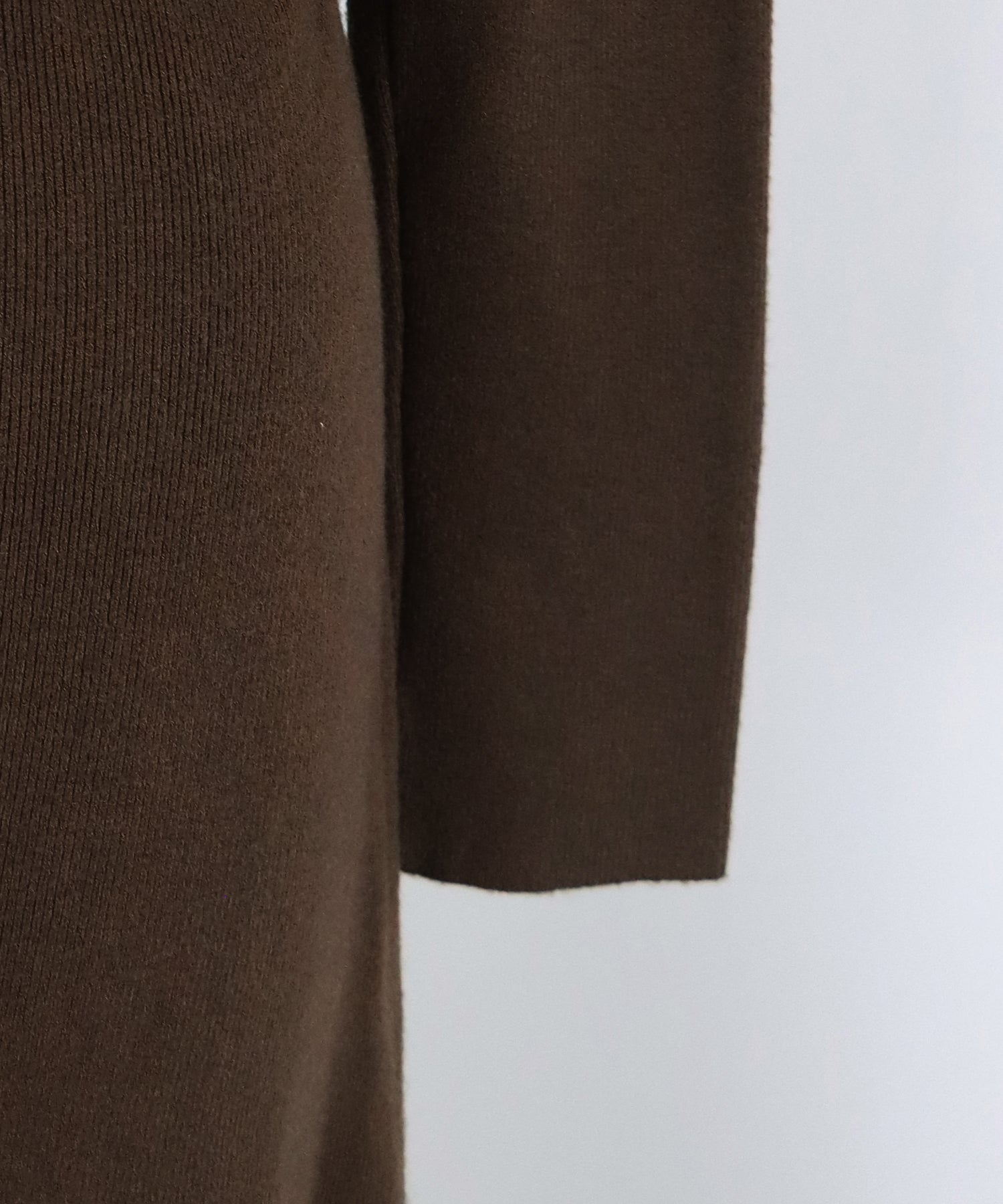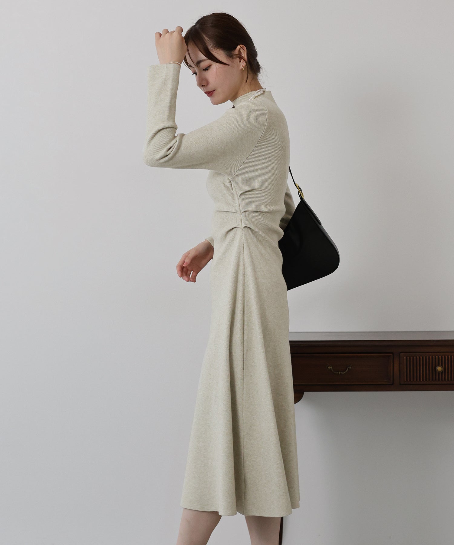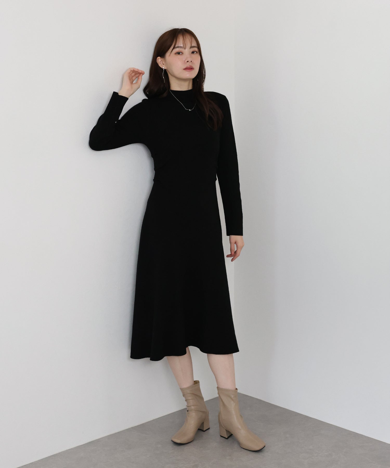 ハイネックとサイドタックが上品な印象のニットワンピース。
