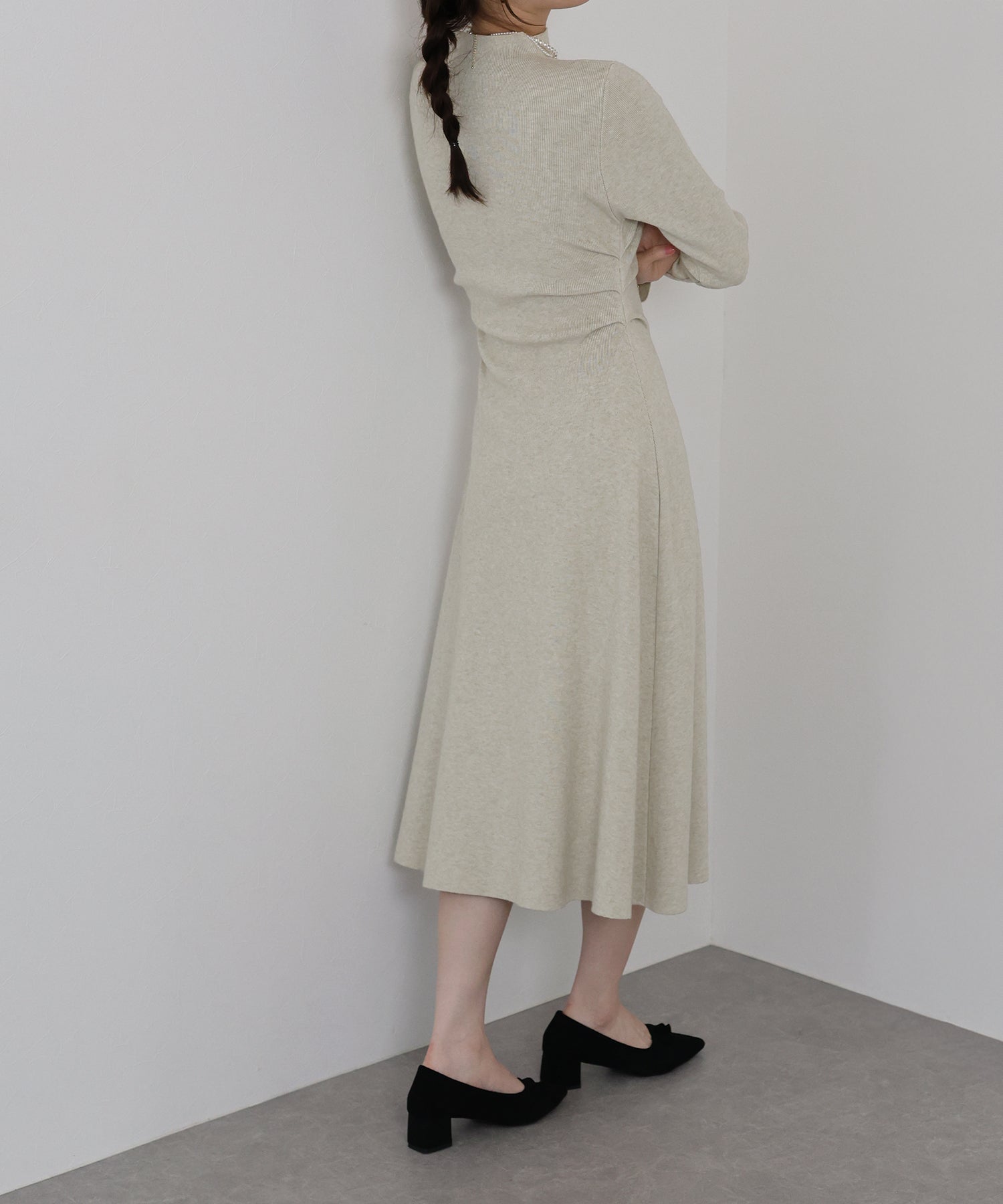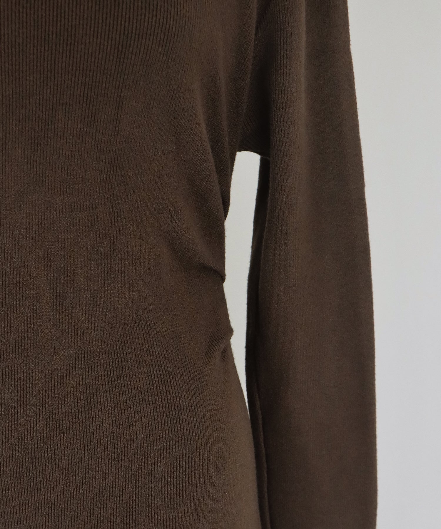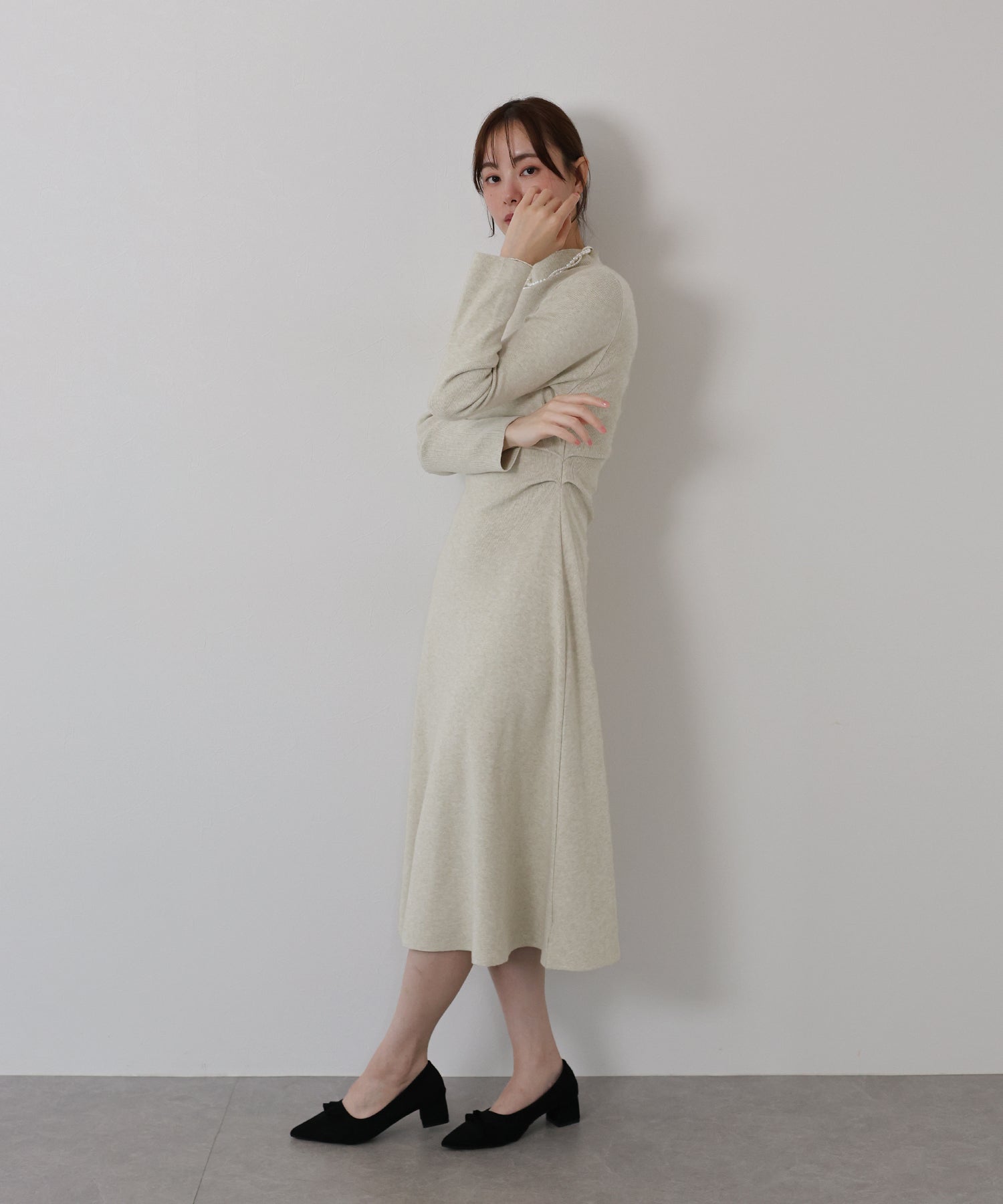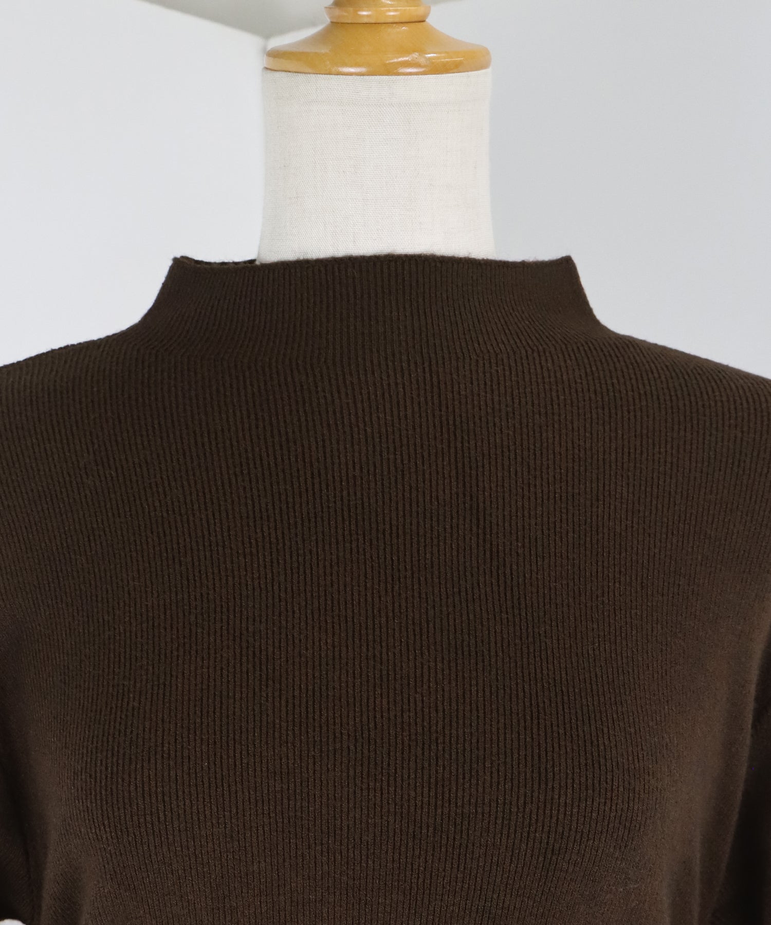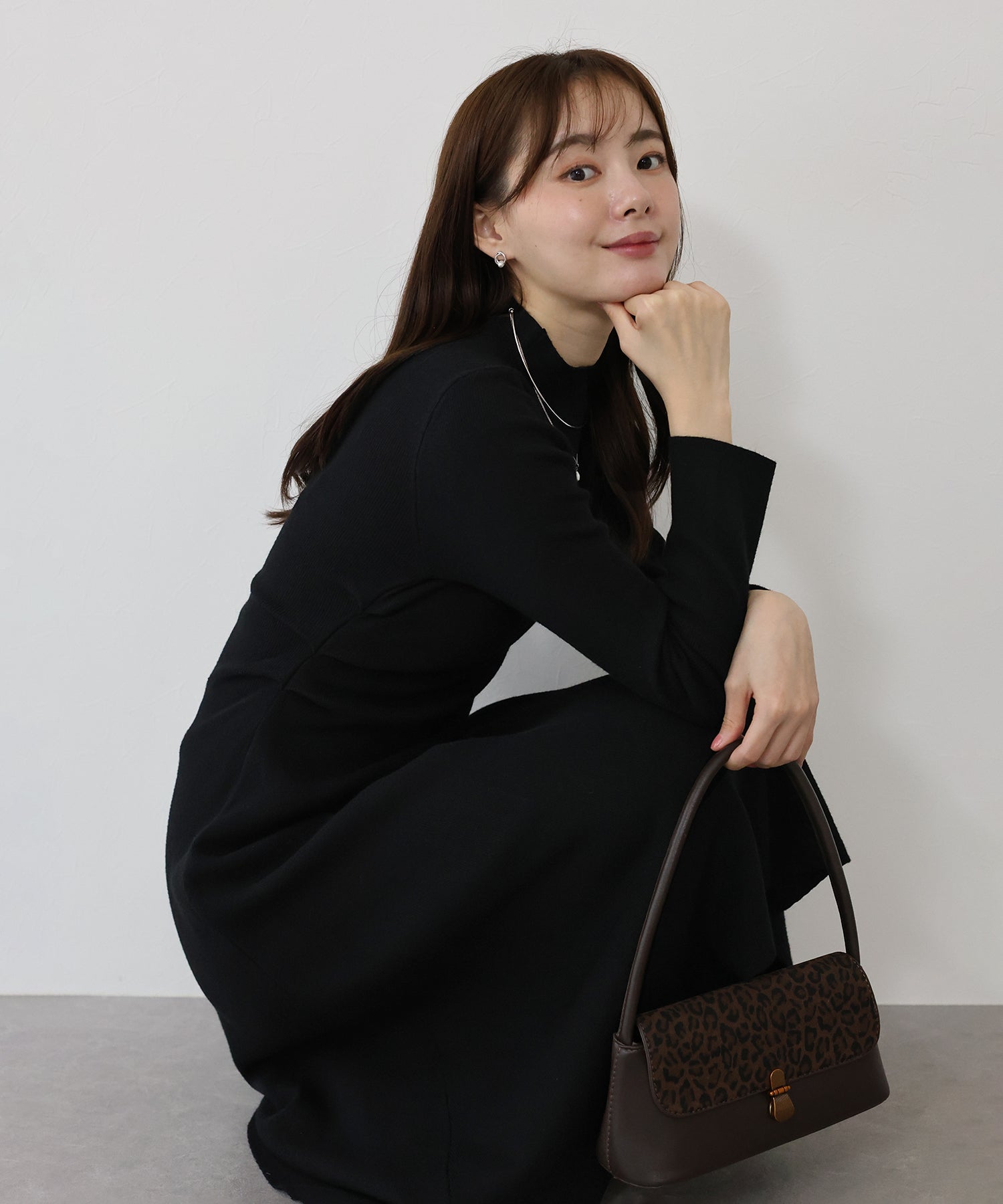 ハイネックとサイドタックが上品な印象のニットワンピース。