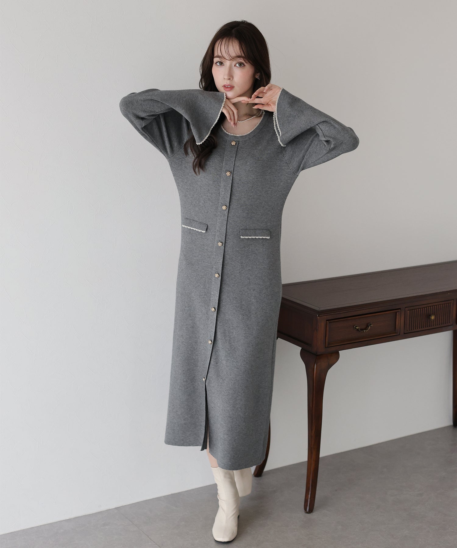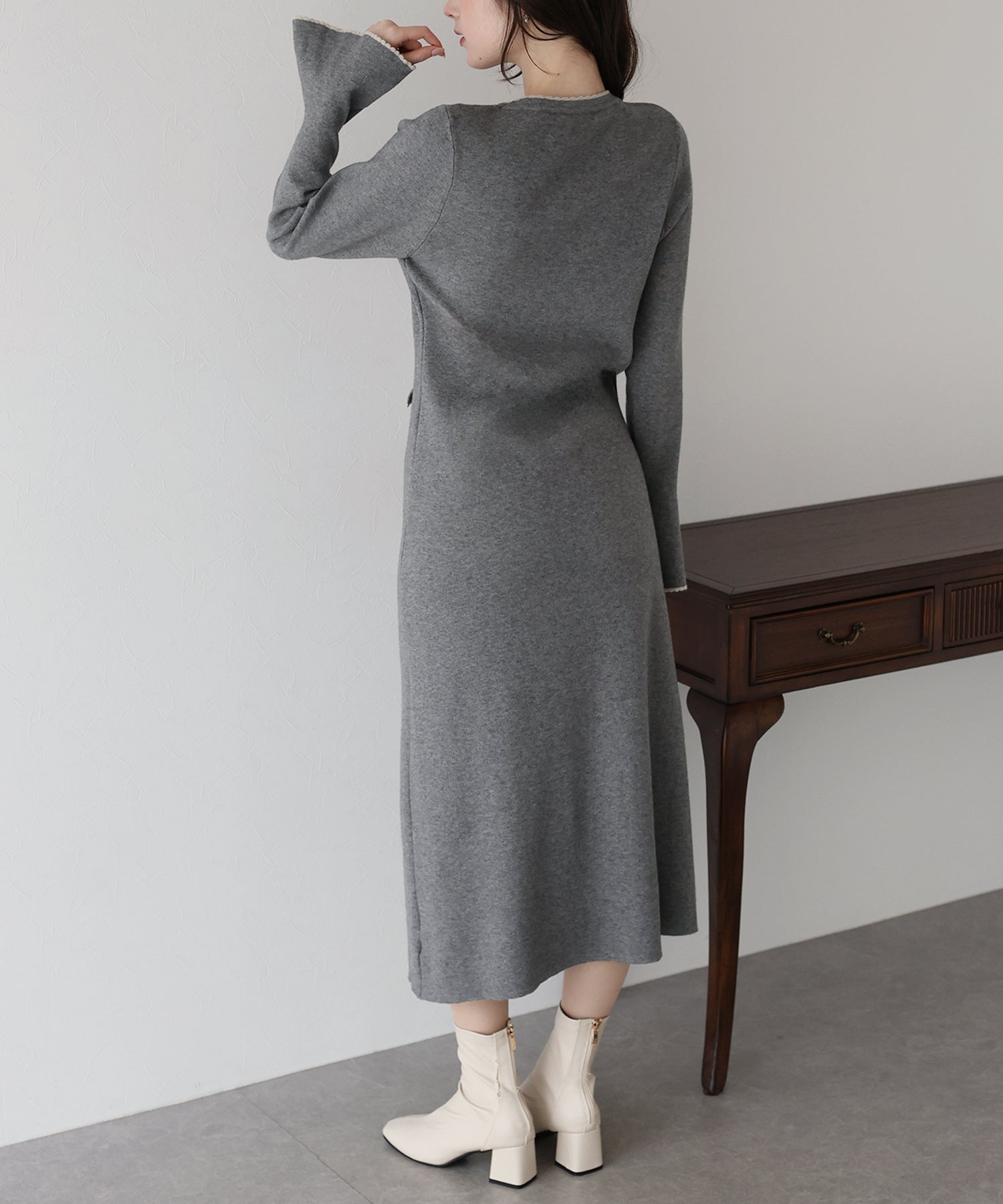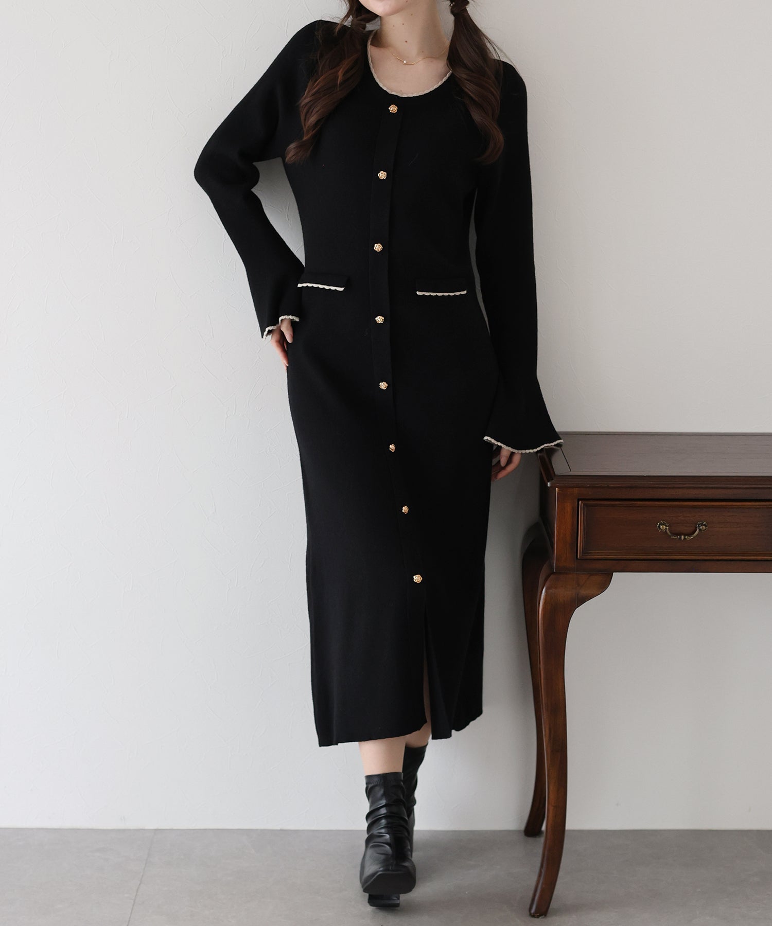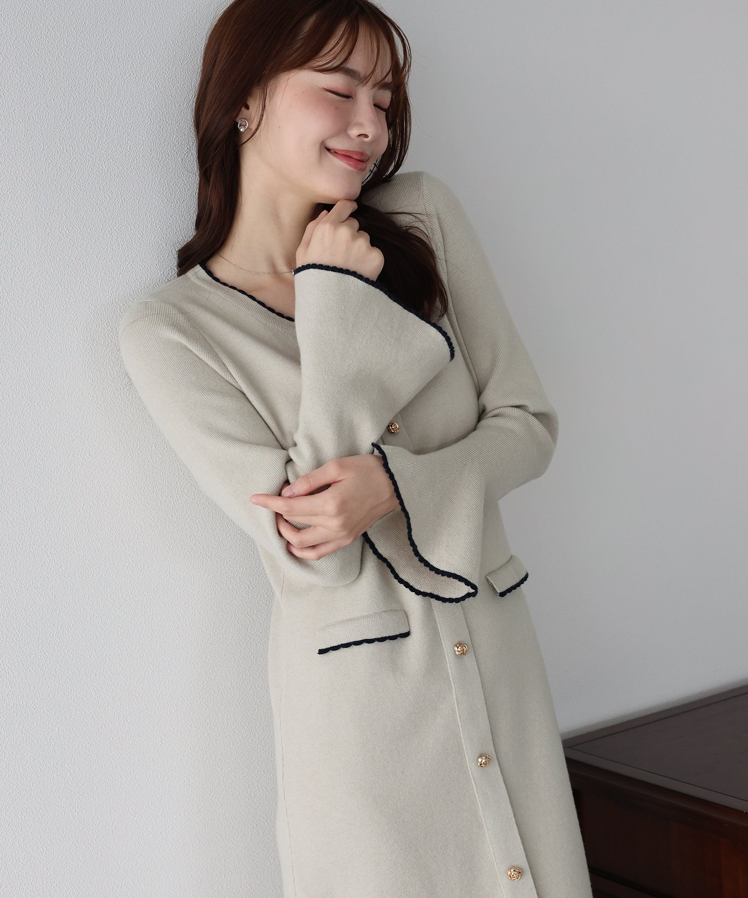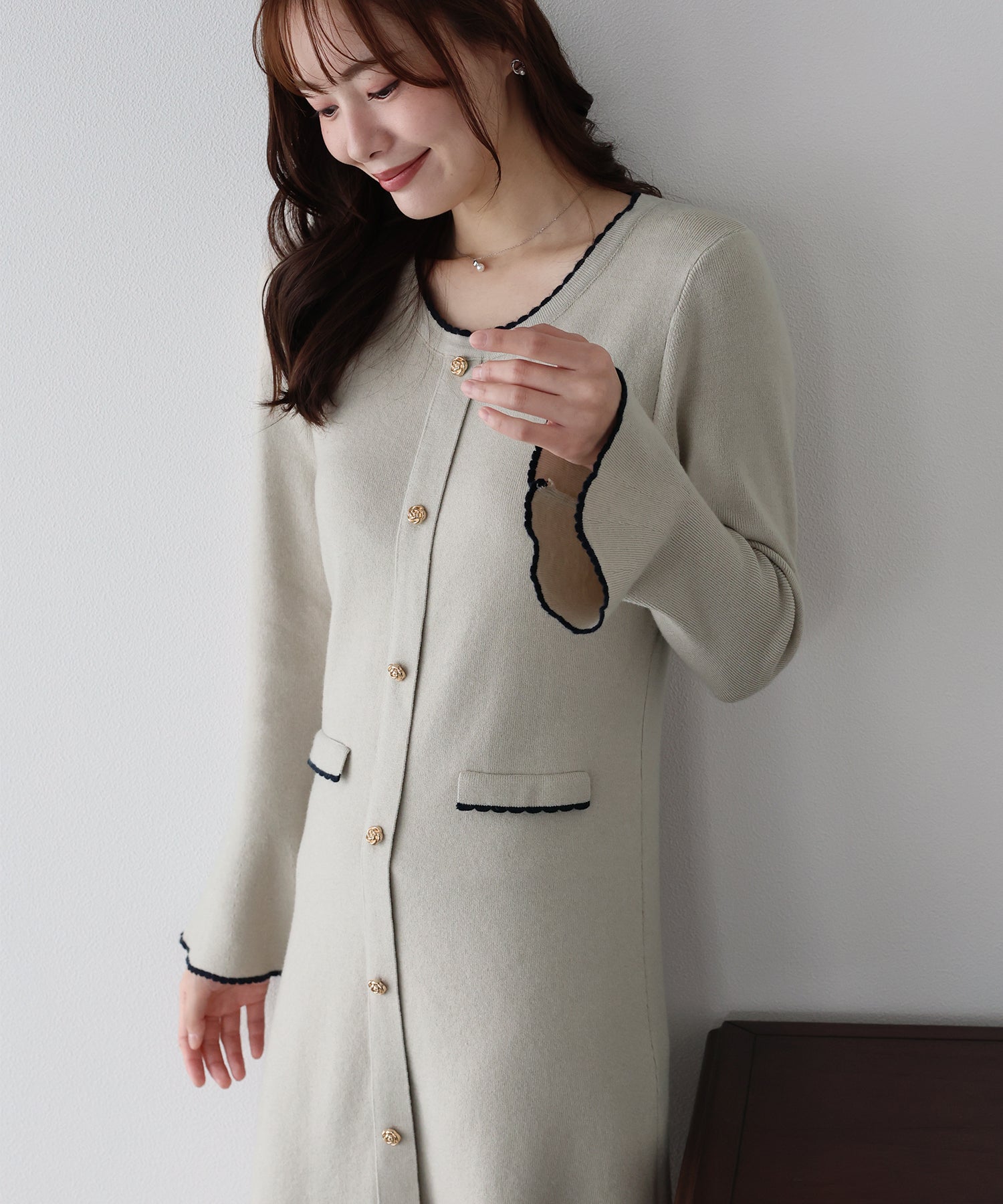 配色とスカラップデザインでフェミニンなアクセントを加えたロングニットワンピース。