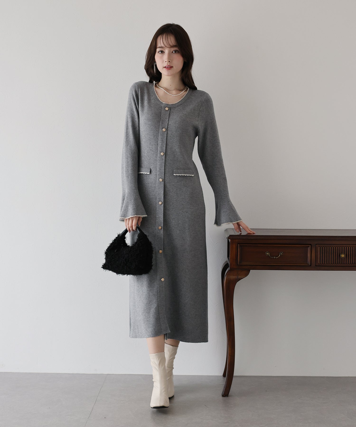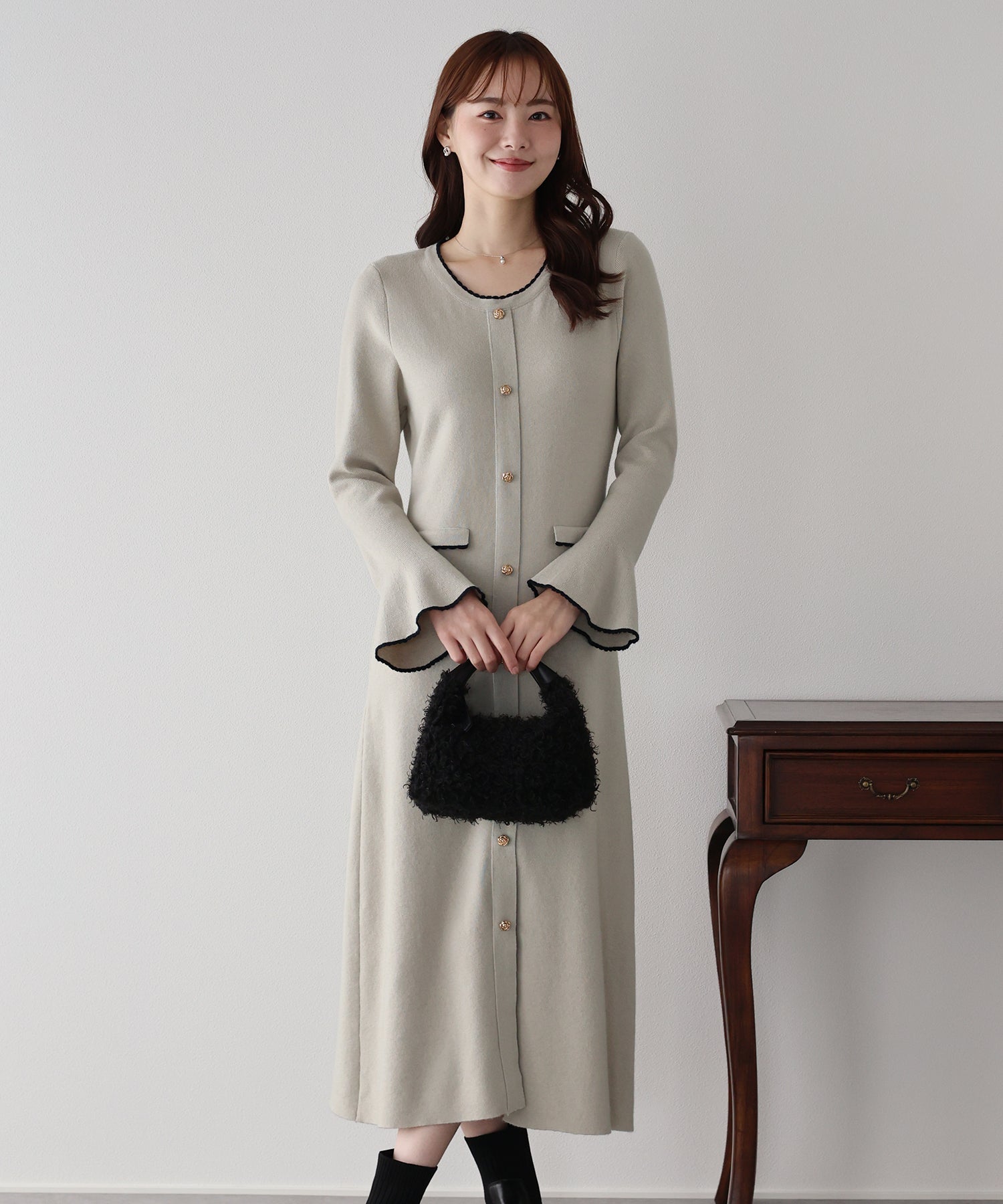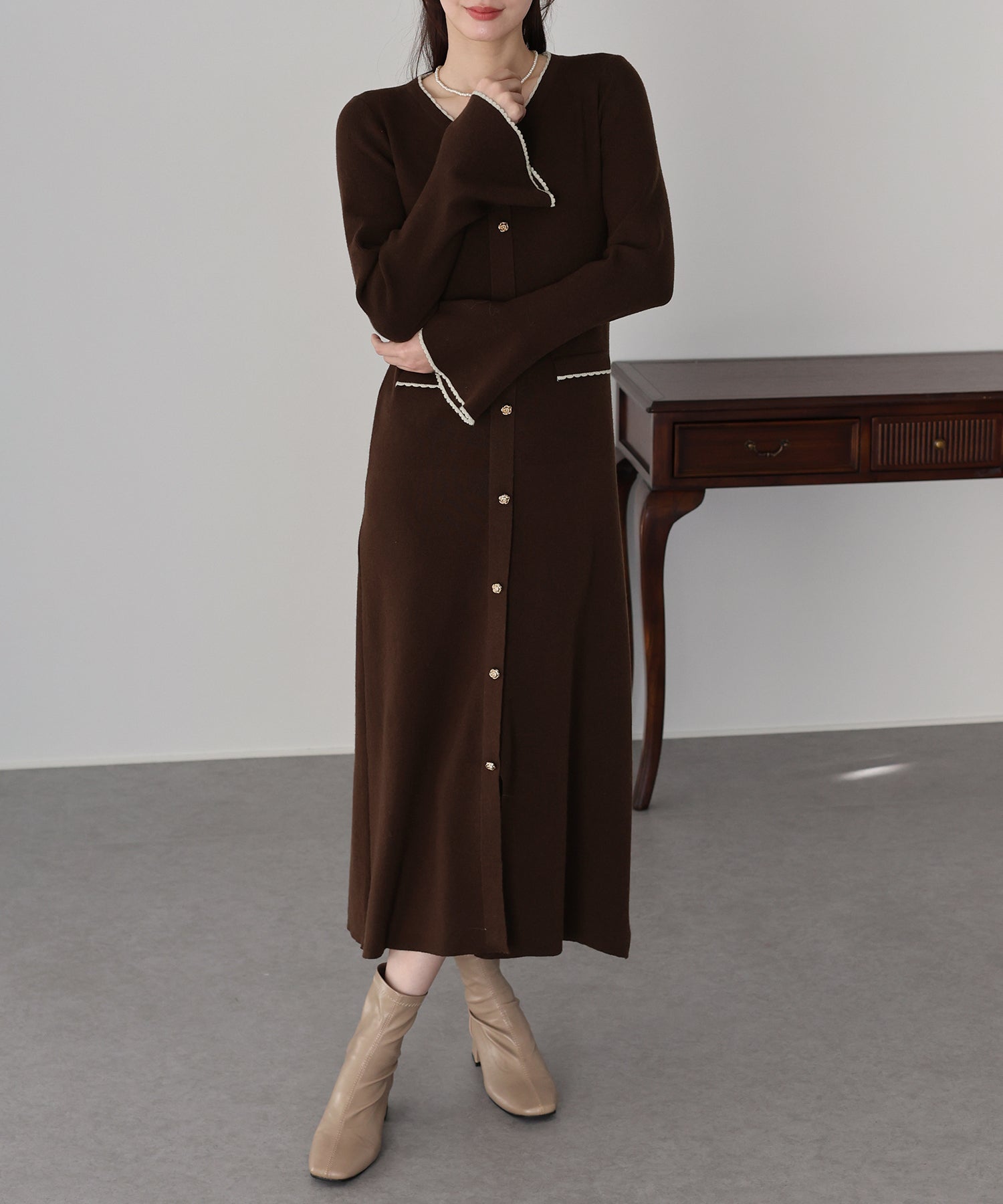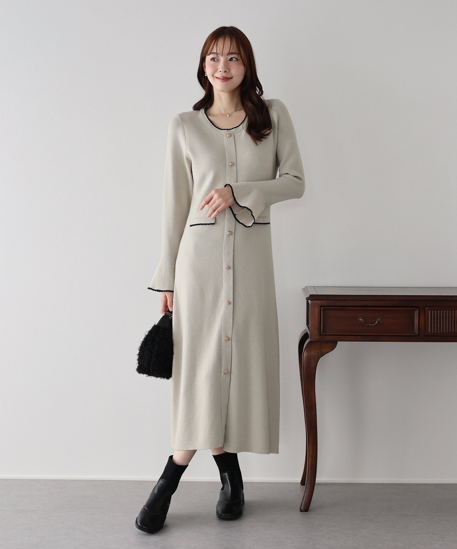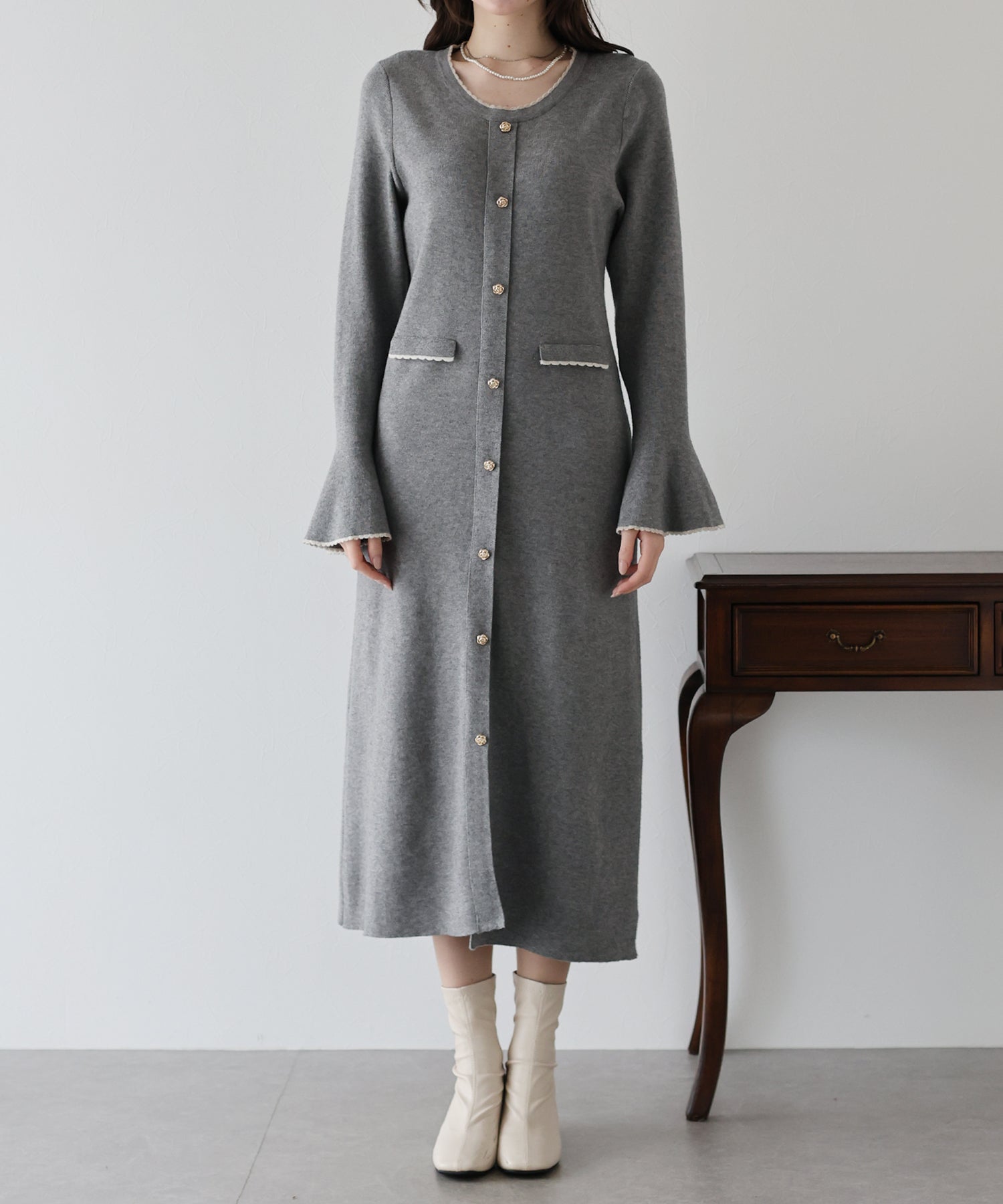 配色とスカラップデザインでフェミニンなアクセントを加えたロングニットワンピース。