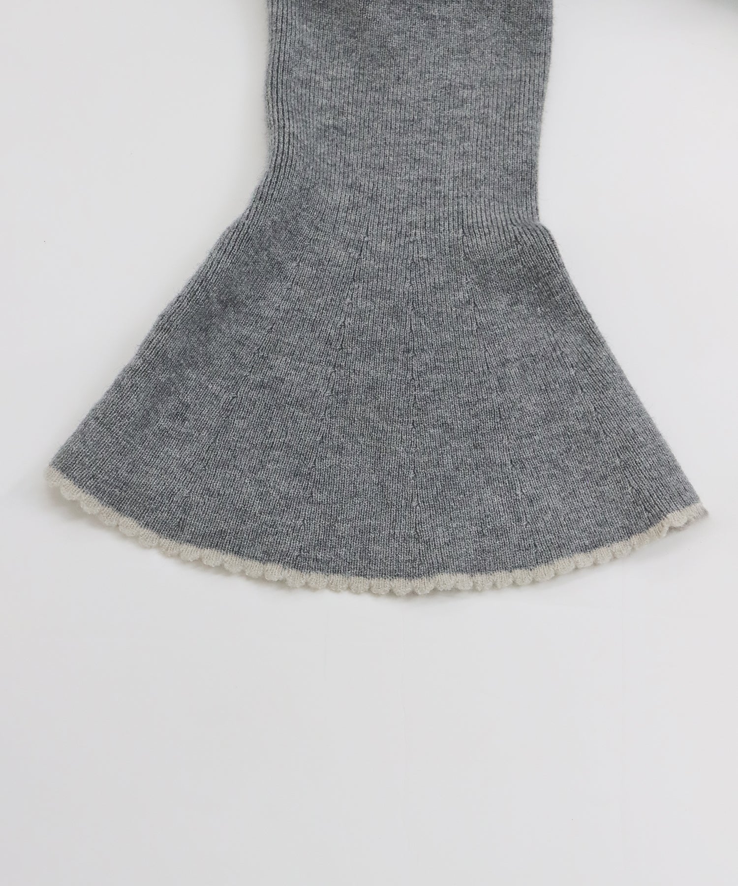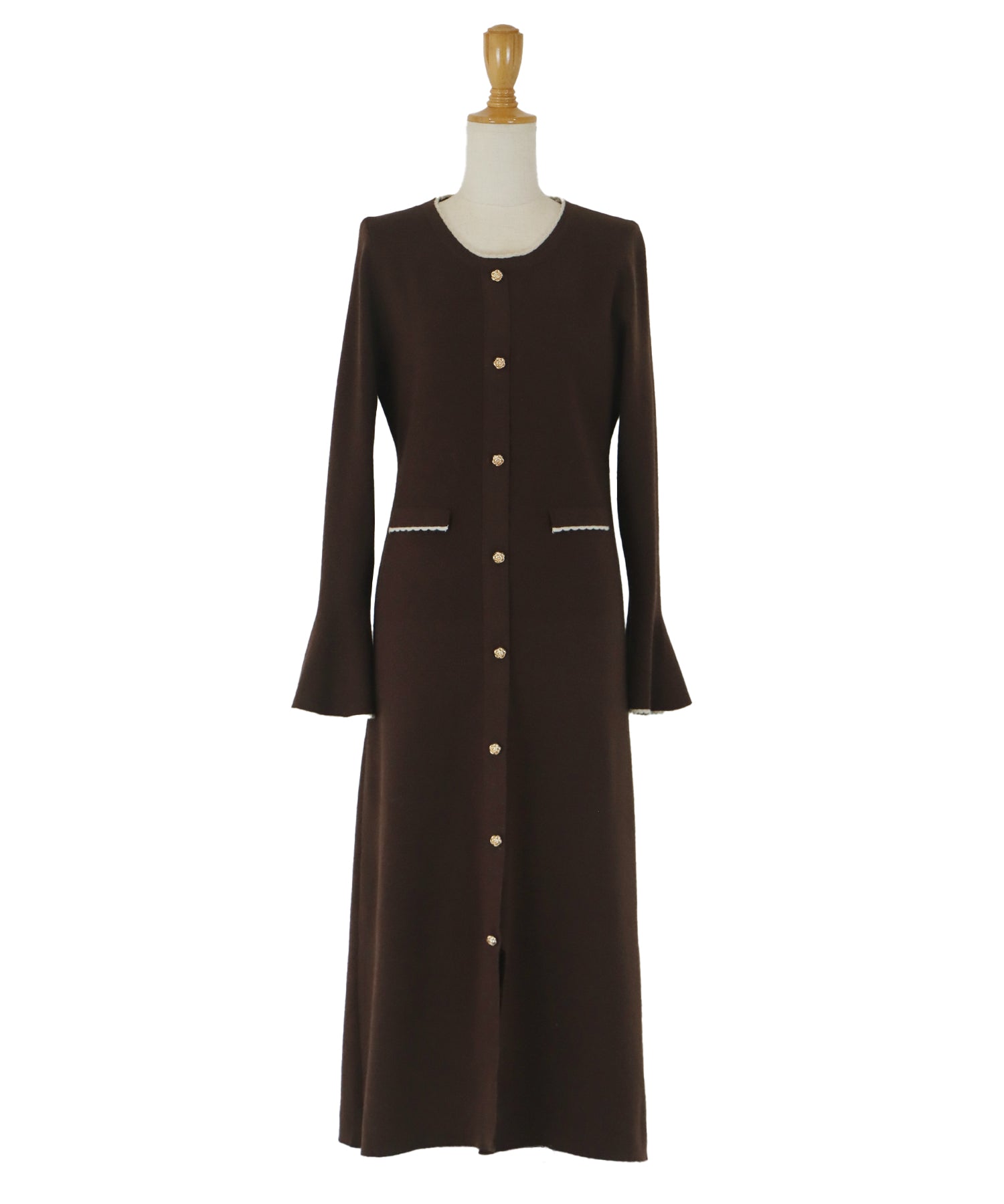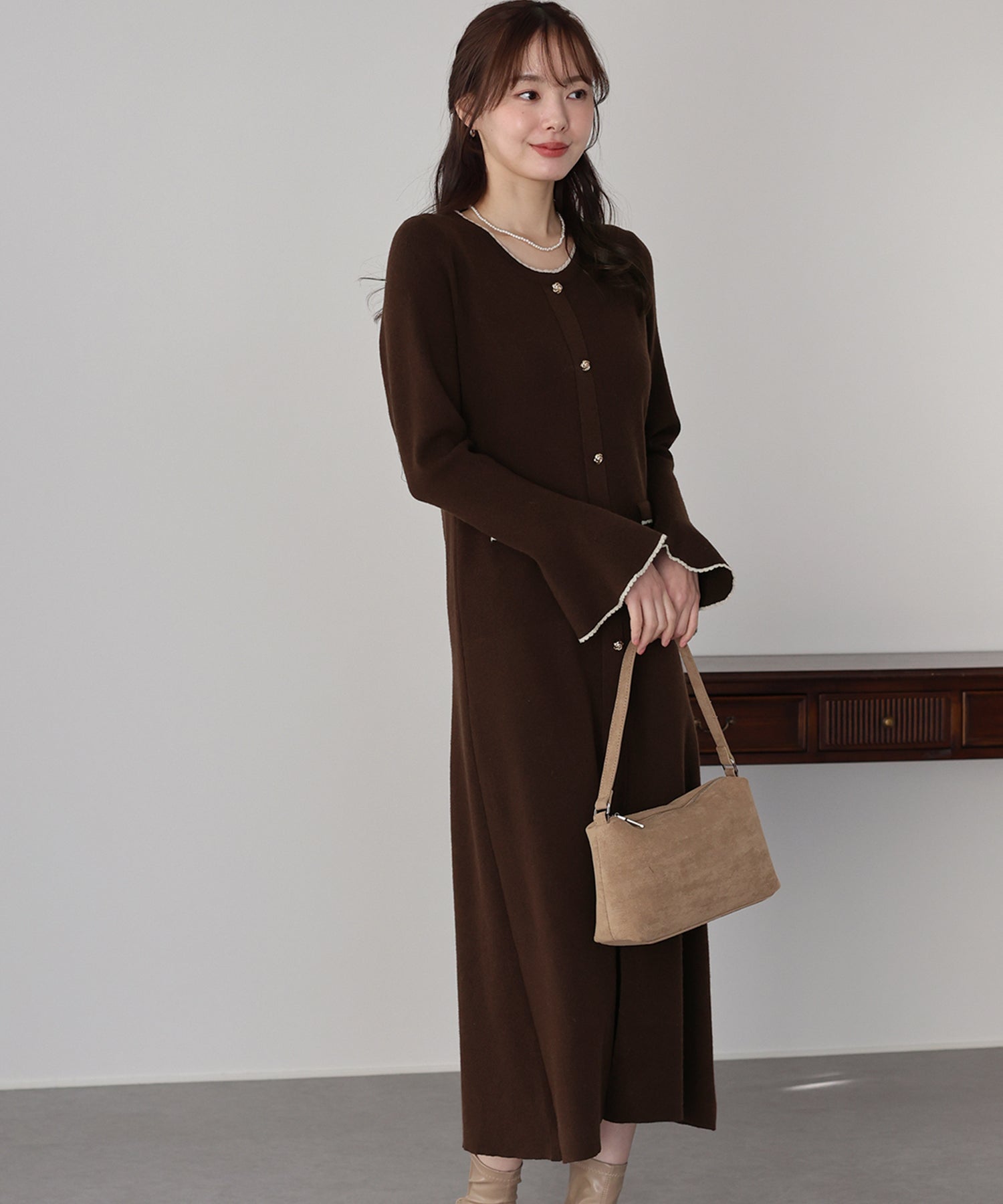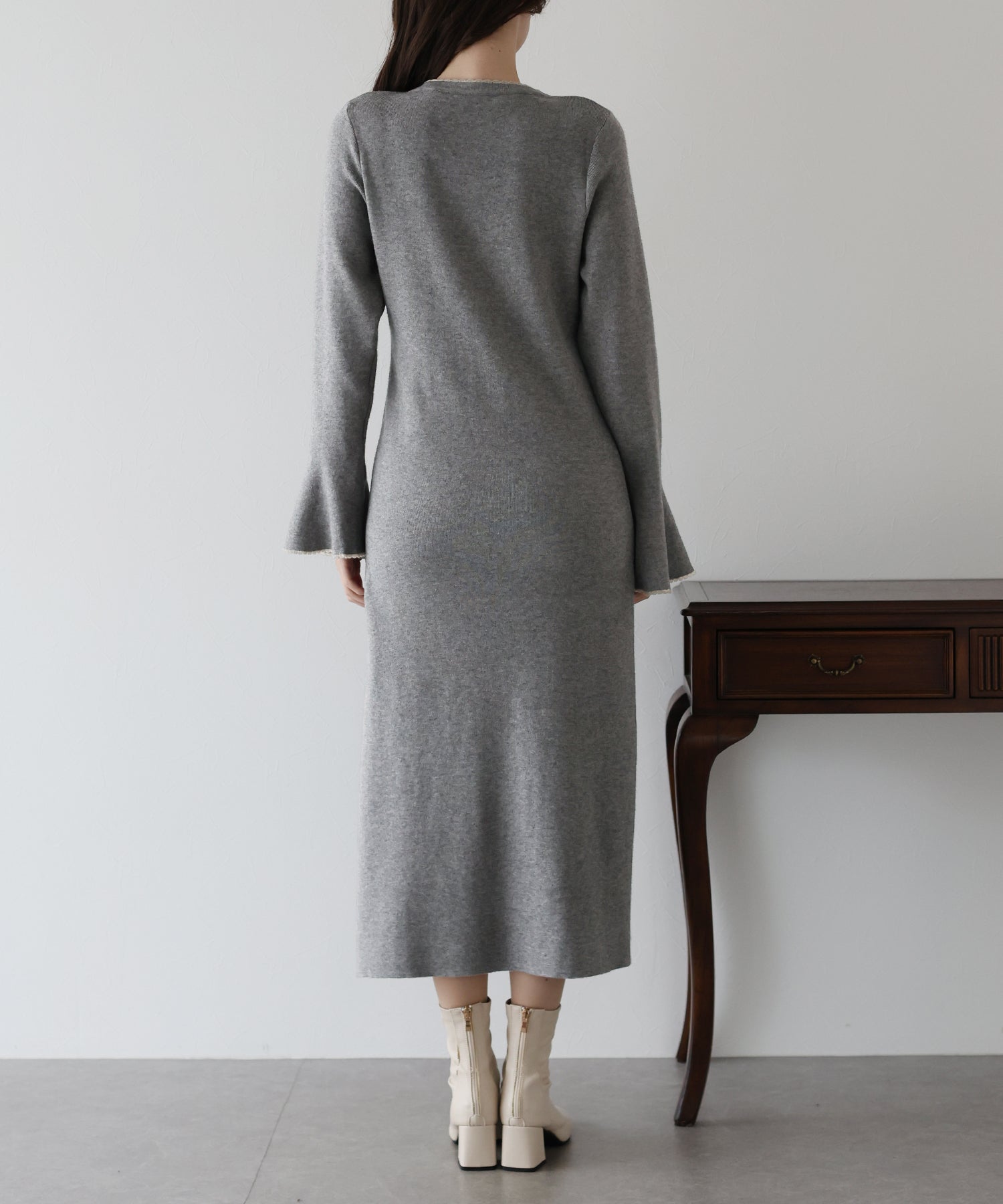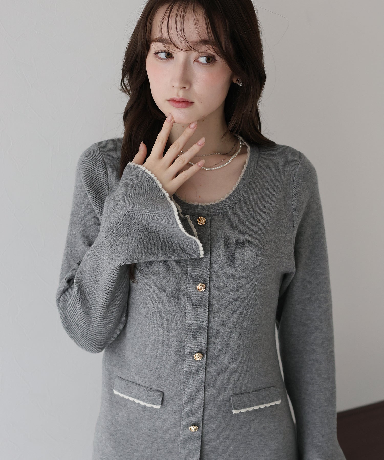 配色とスカラップデザインでフェミニンなアクセントを加えたロングニットワンピース。