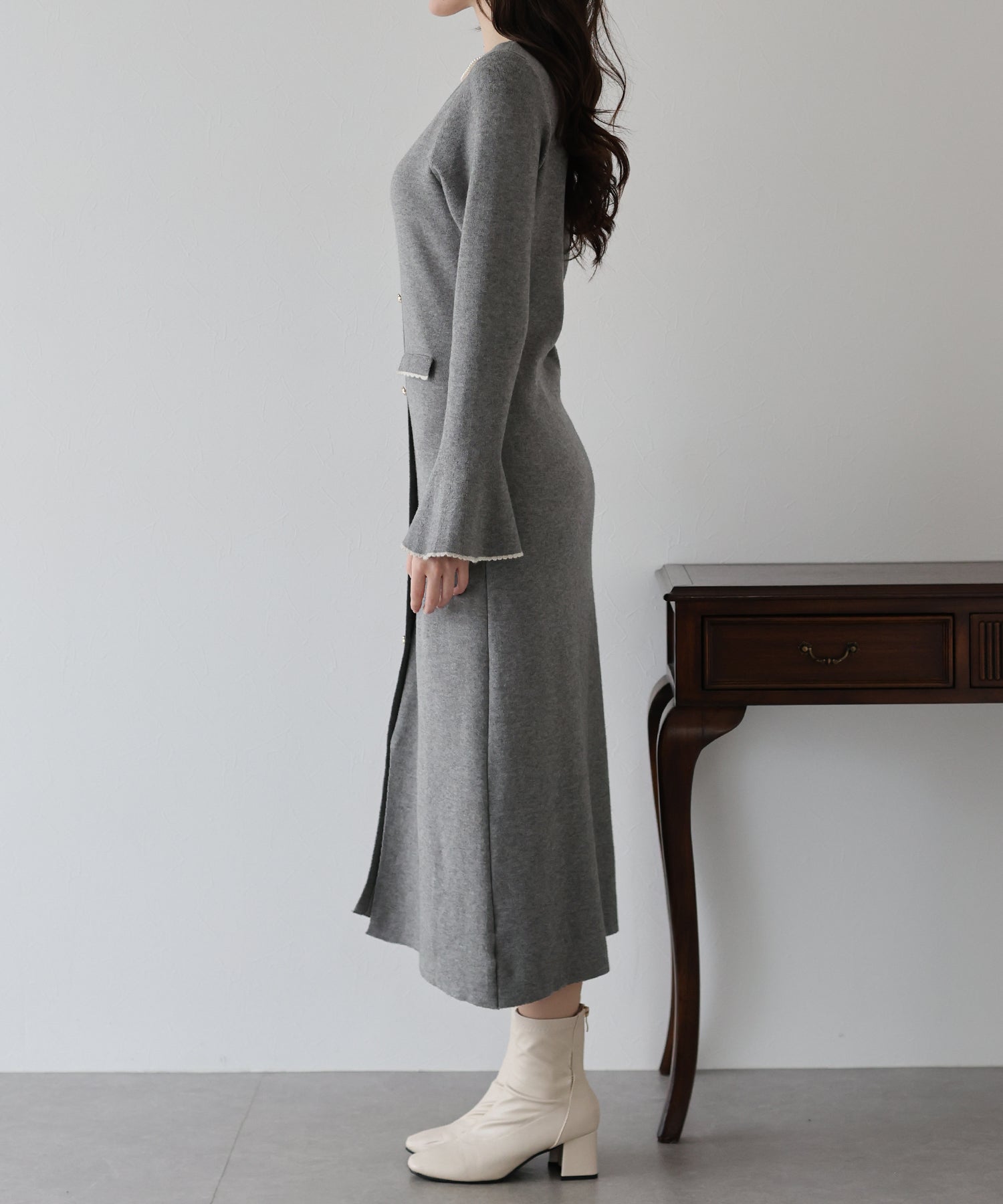 フレア袖と、ほどよく広がるAラインのスカートが大人かわいいイメージをプラスします。