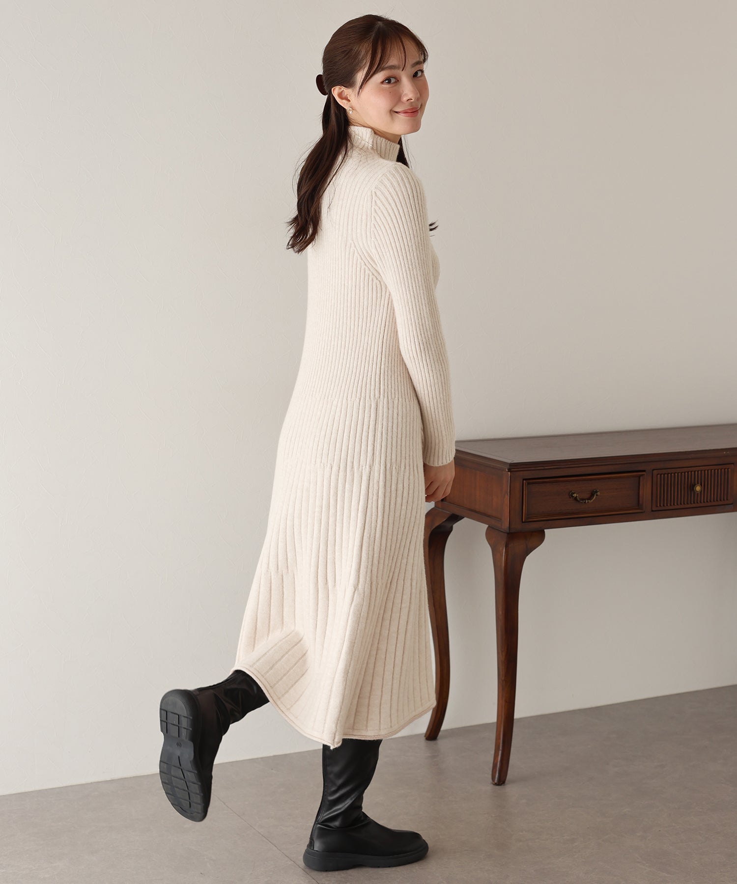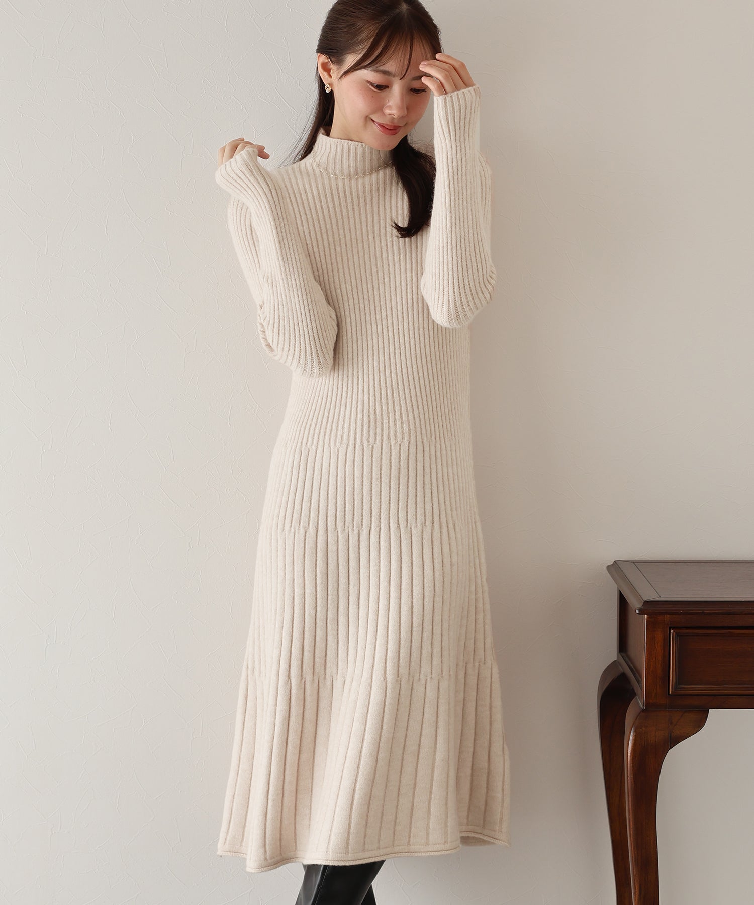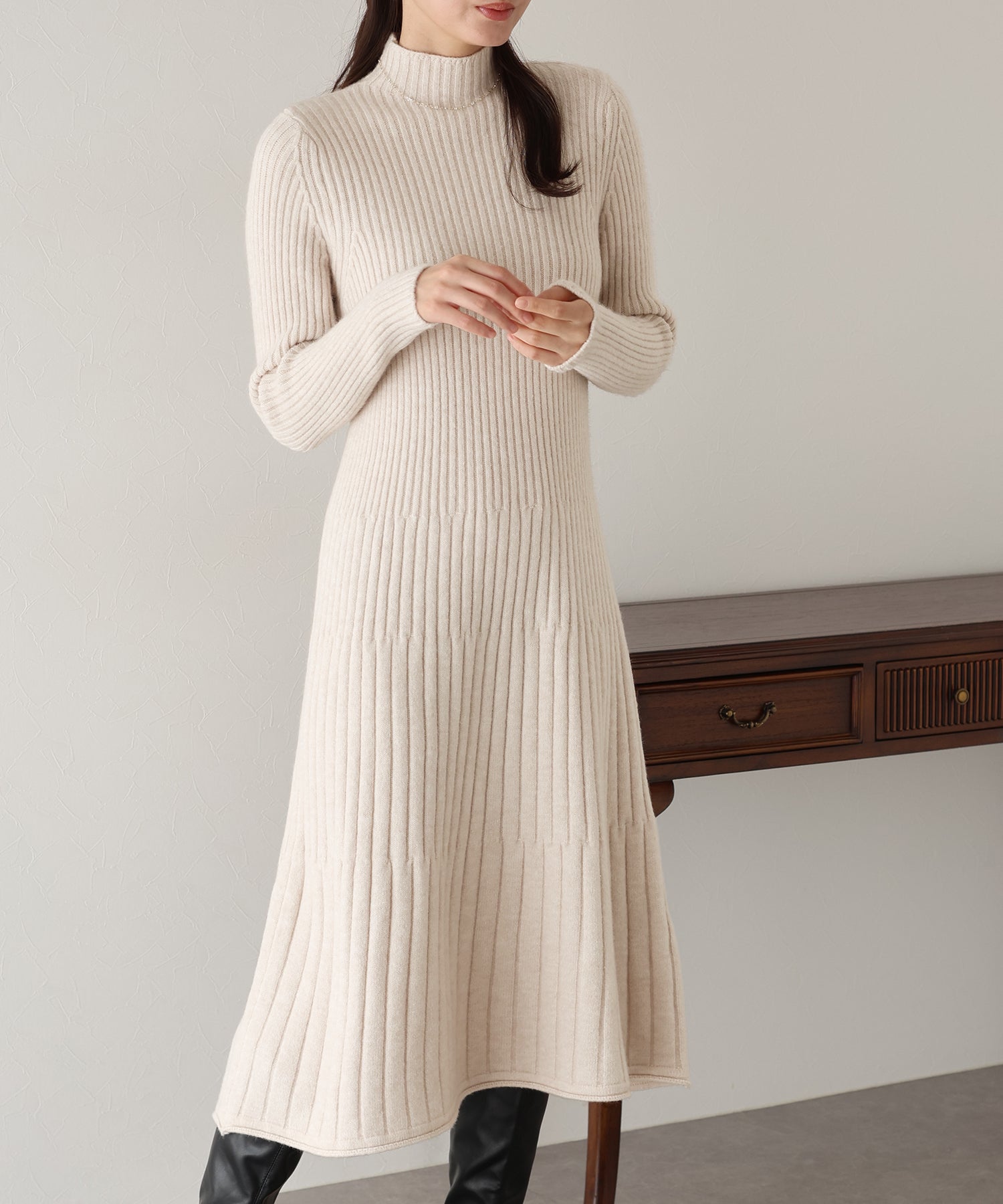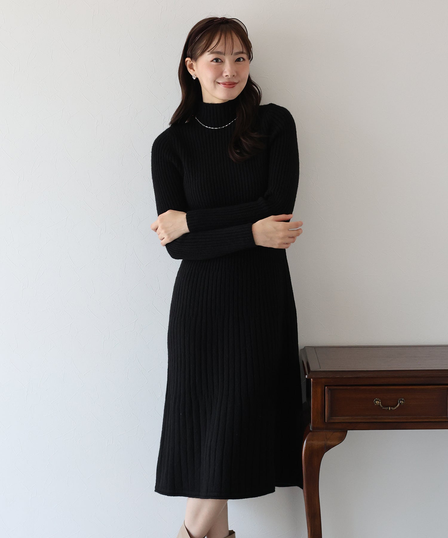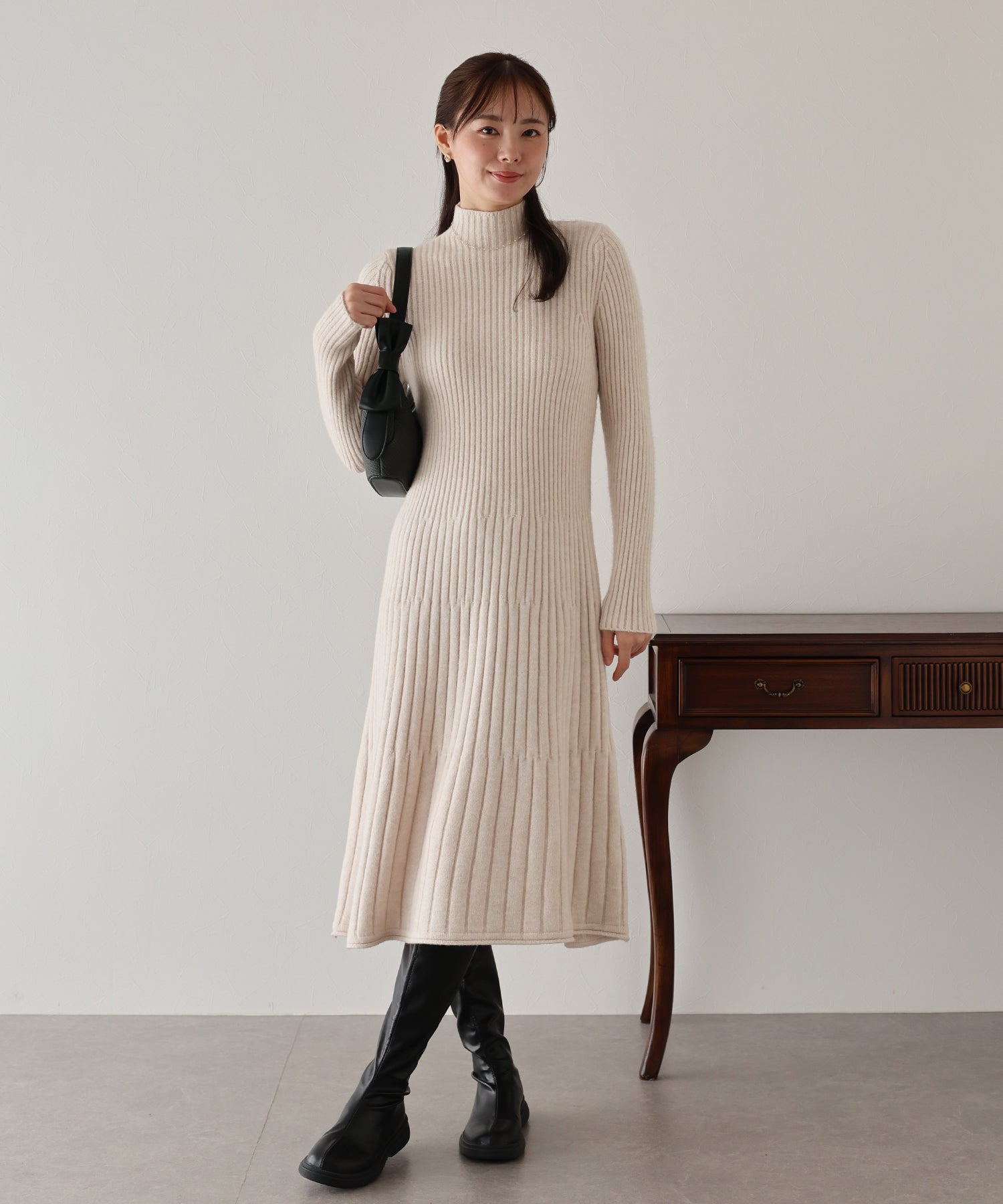 裾に向かって広がるリブ編みのニットで上品さをプラスし、
