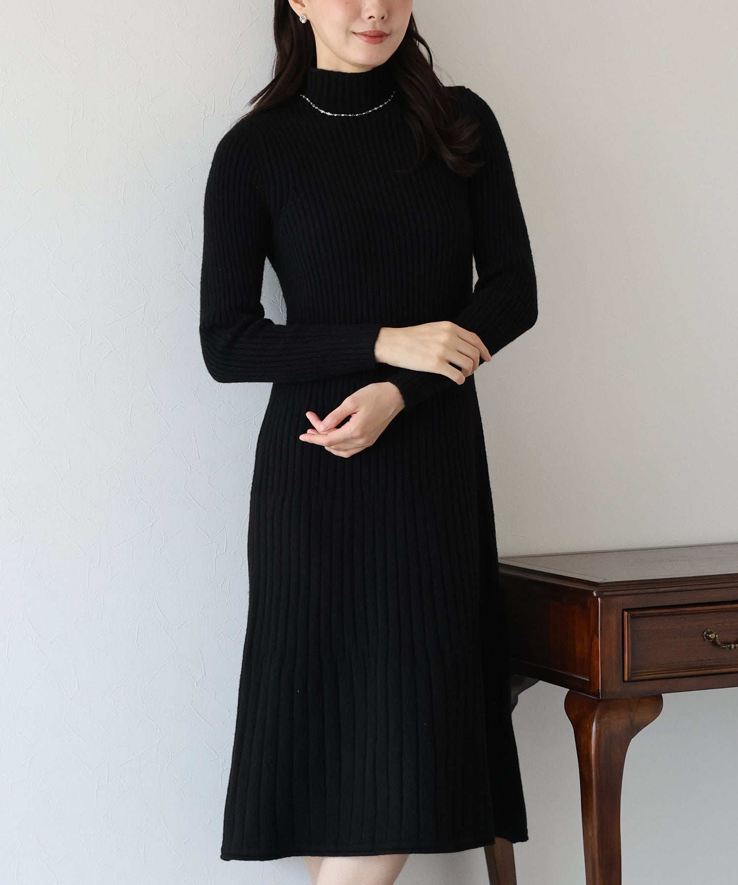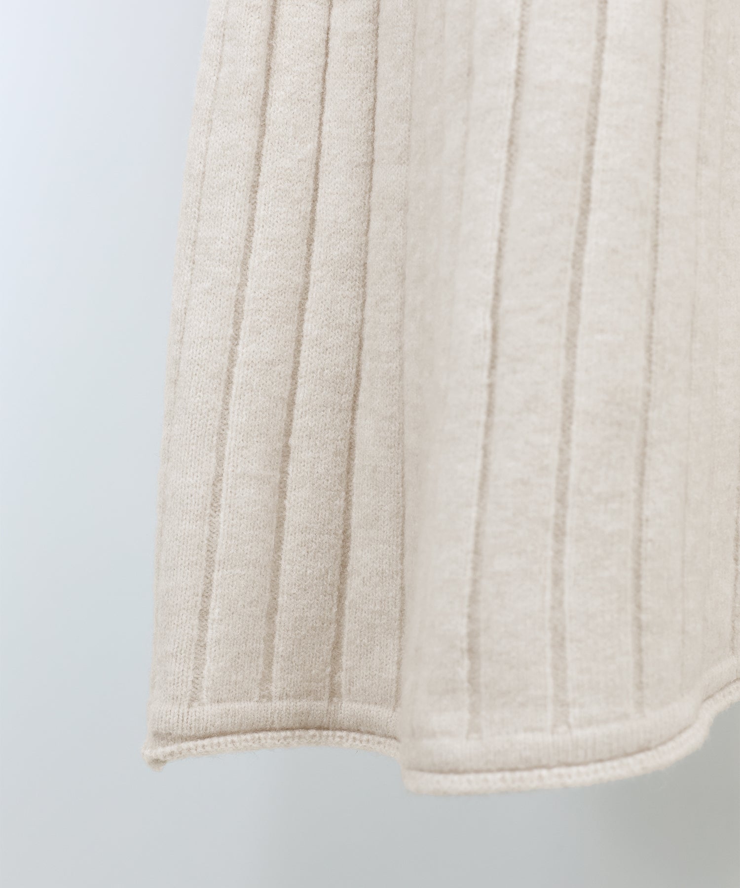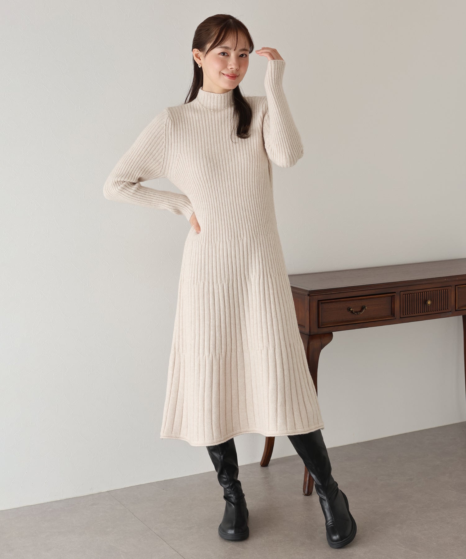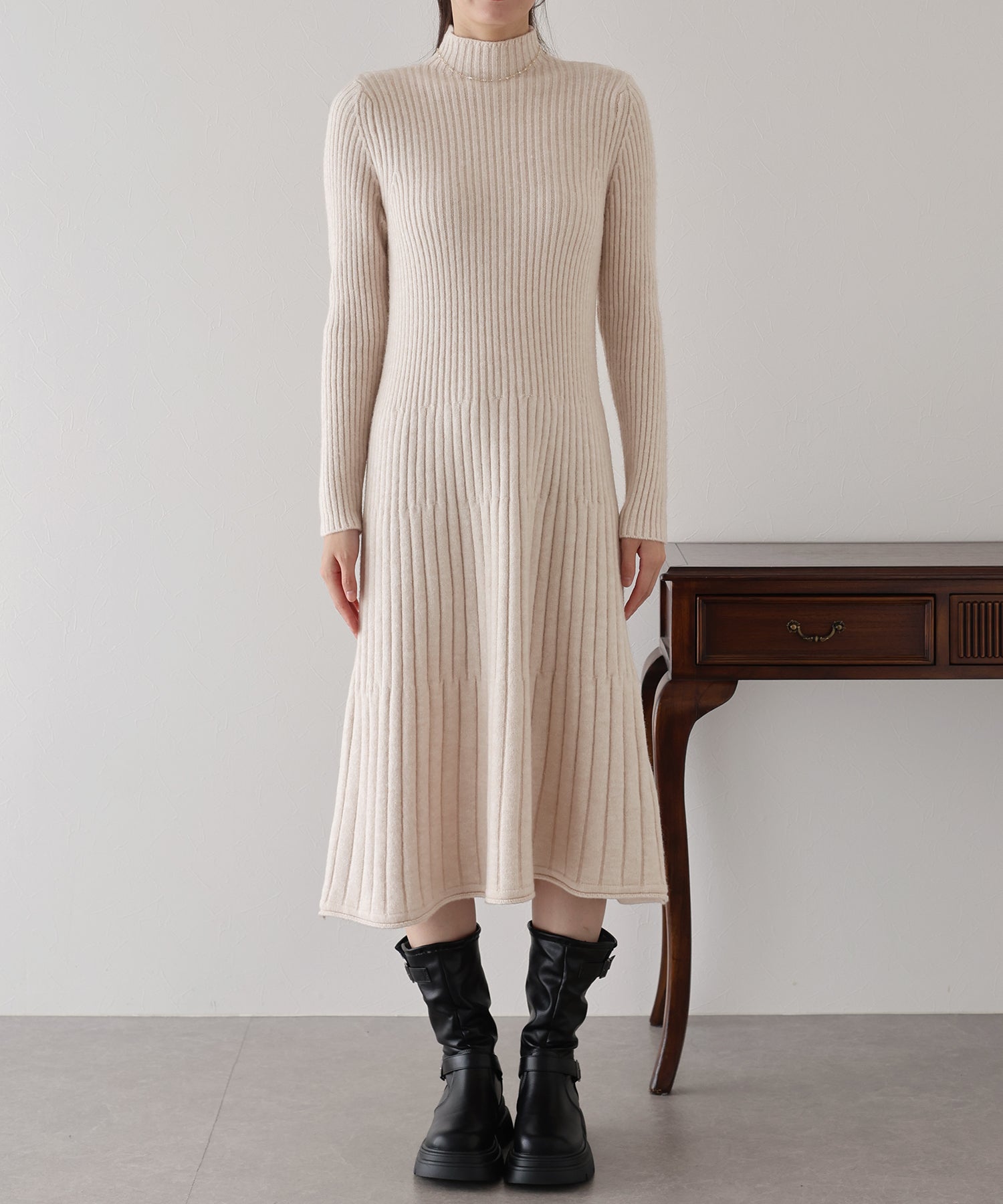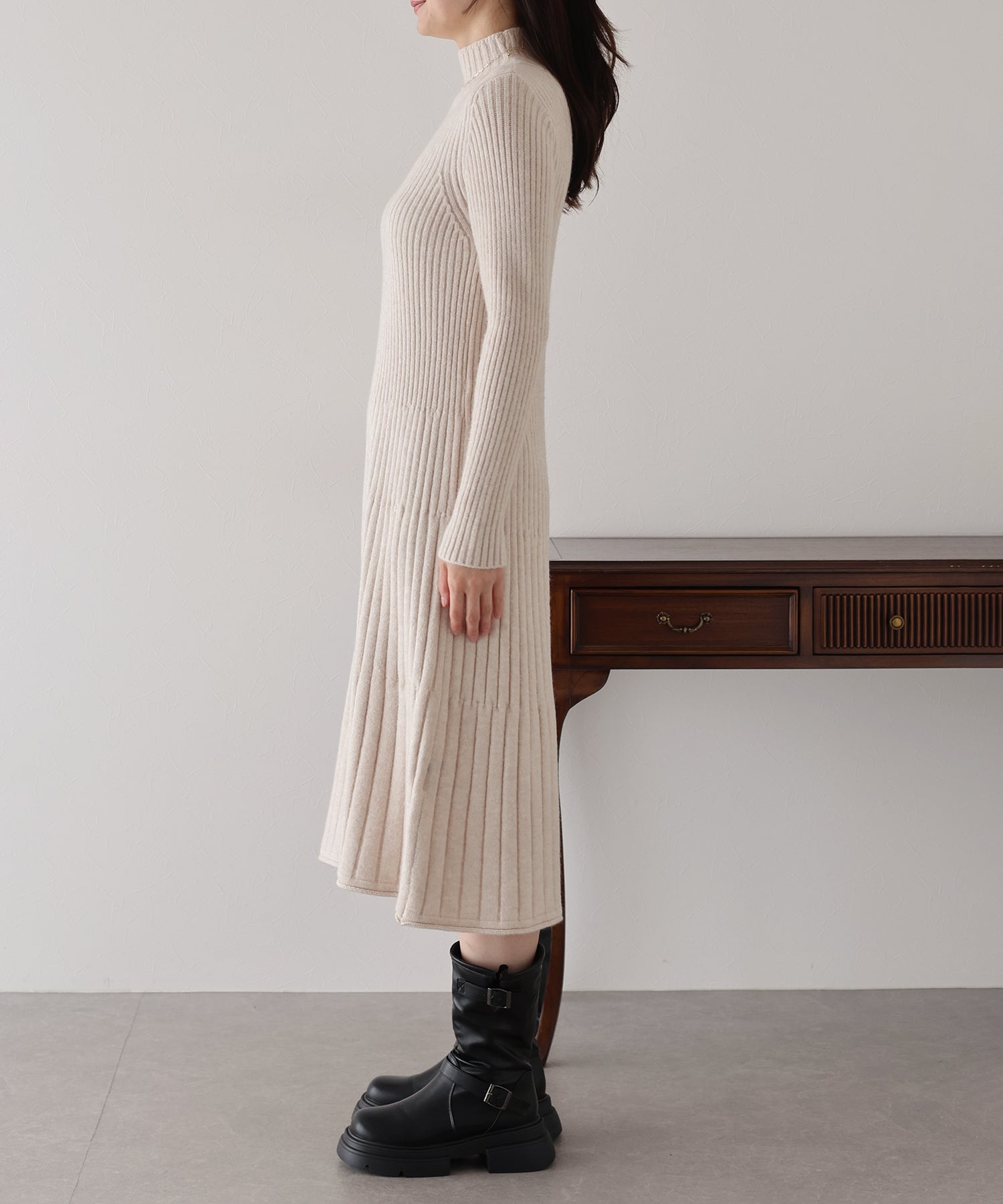 裾に向かって広がるリブ編みのニットで上品さをプラスし、