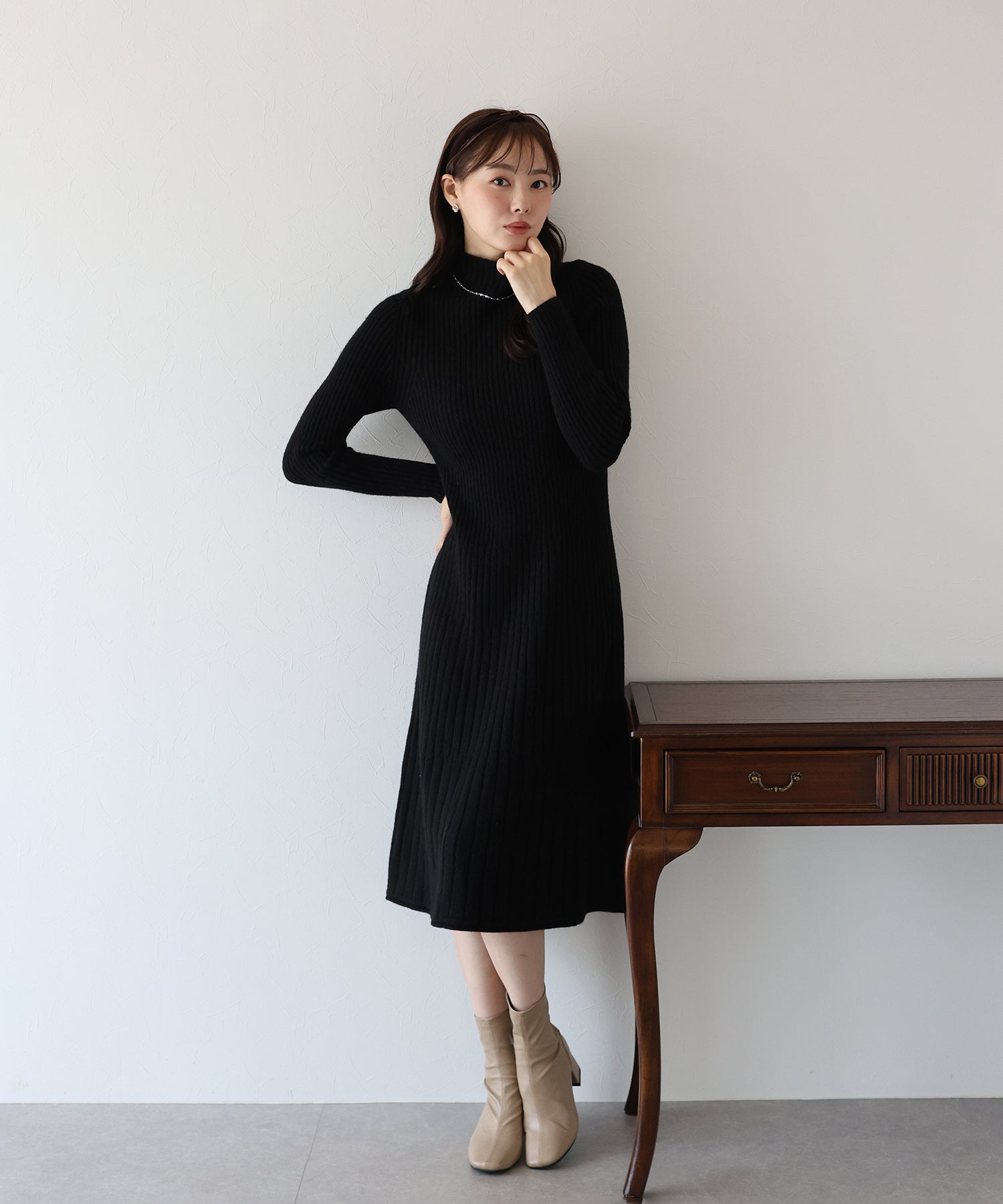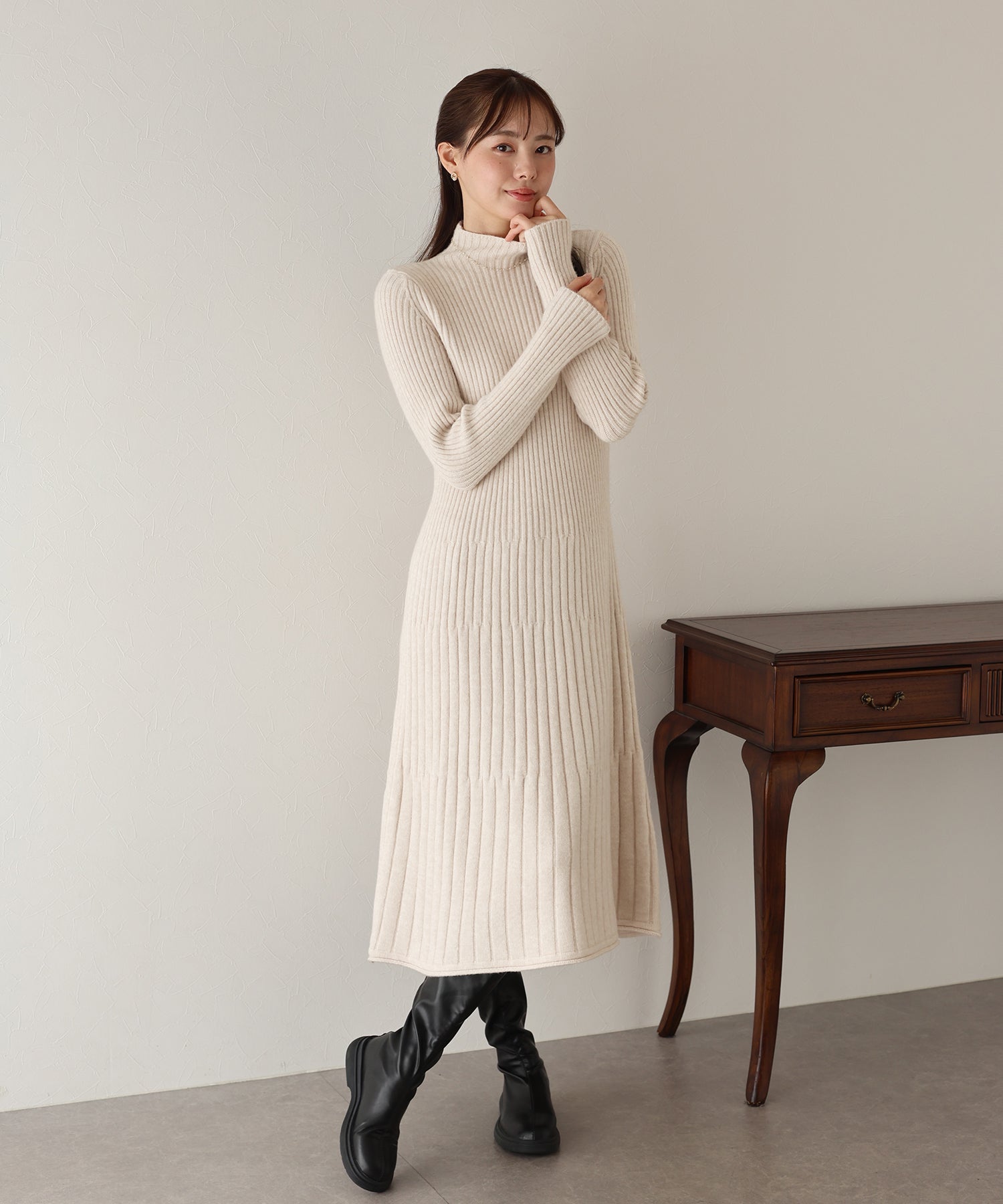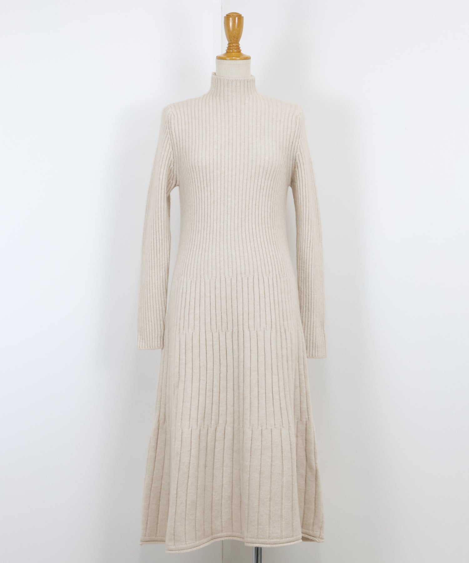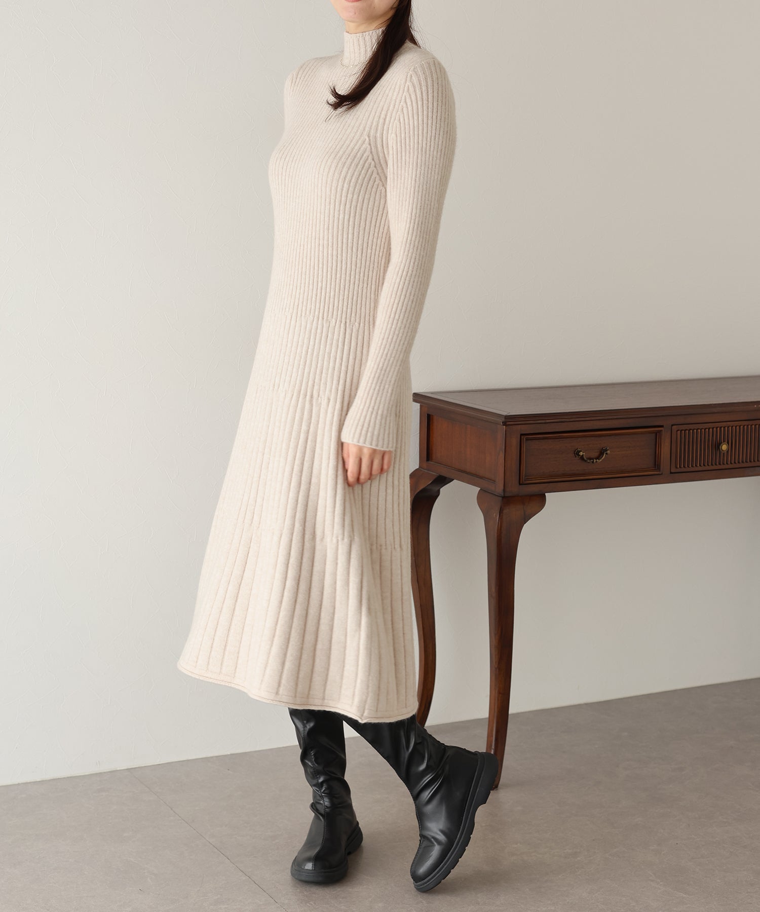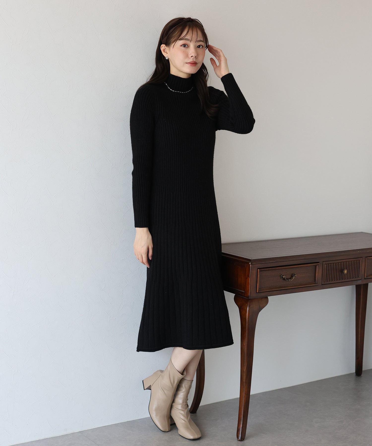 裾に向かって広がるリブ編みのニットで上品さをプラスし、