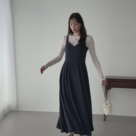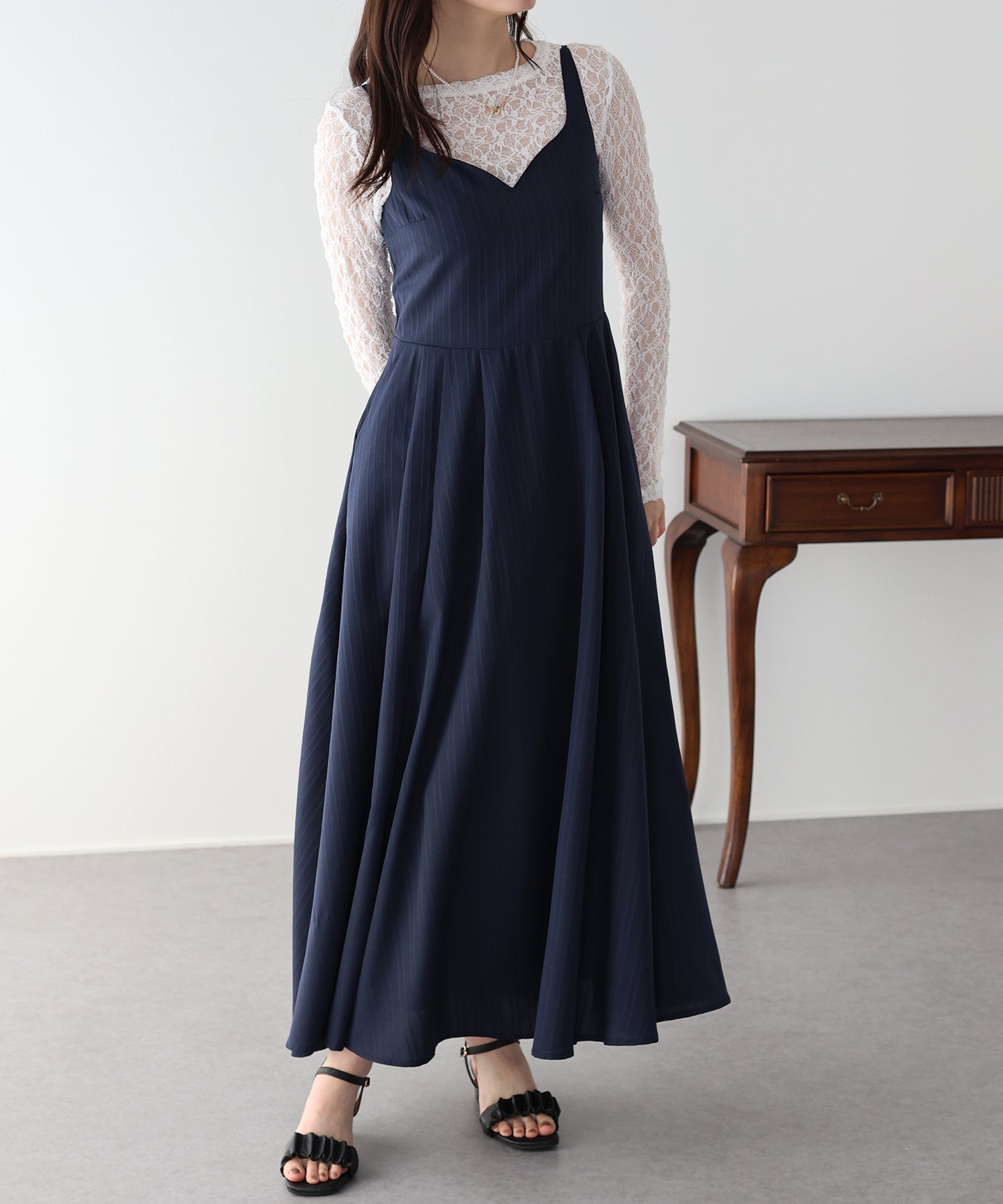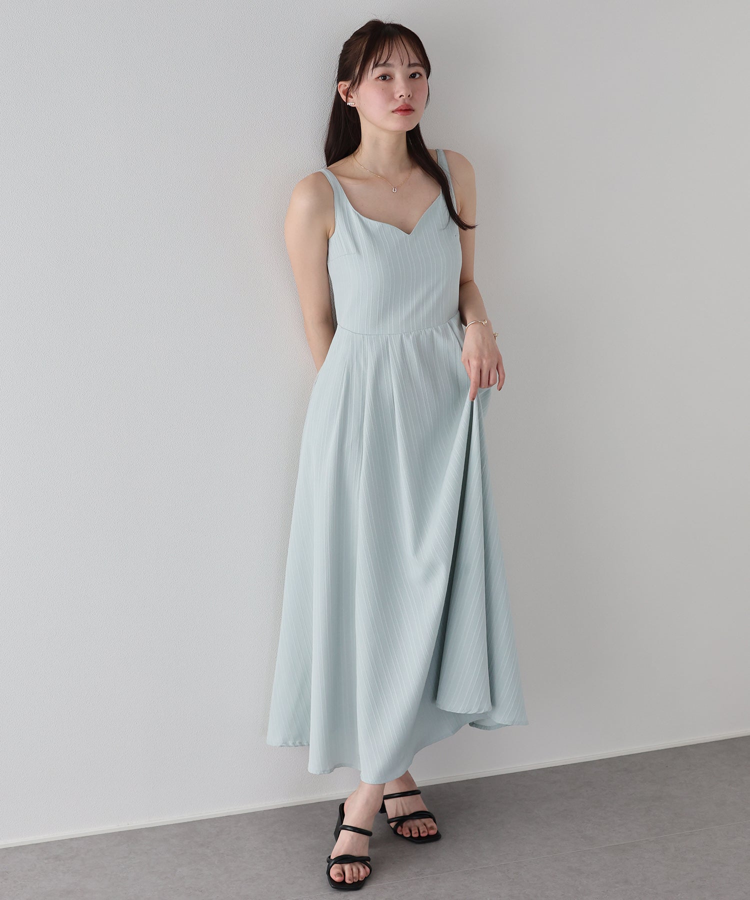 デコルテを美しく、印象的に見せるハートネックラインが主役のキャミワンピース。