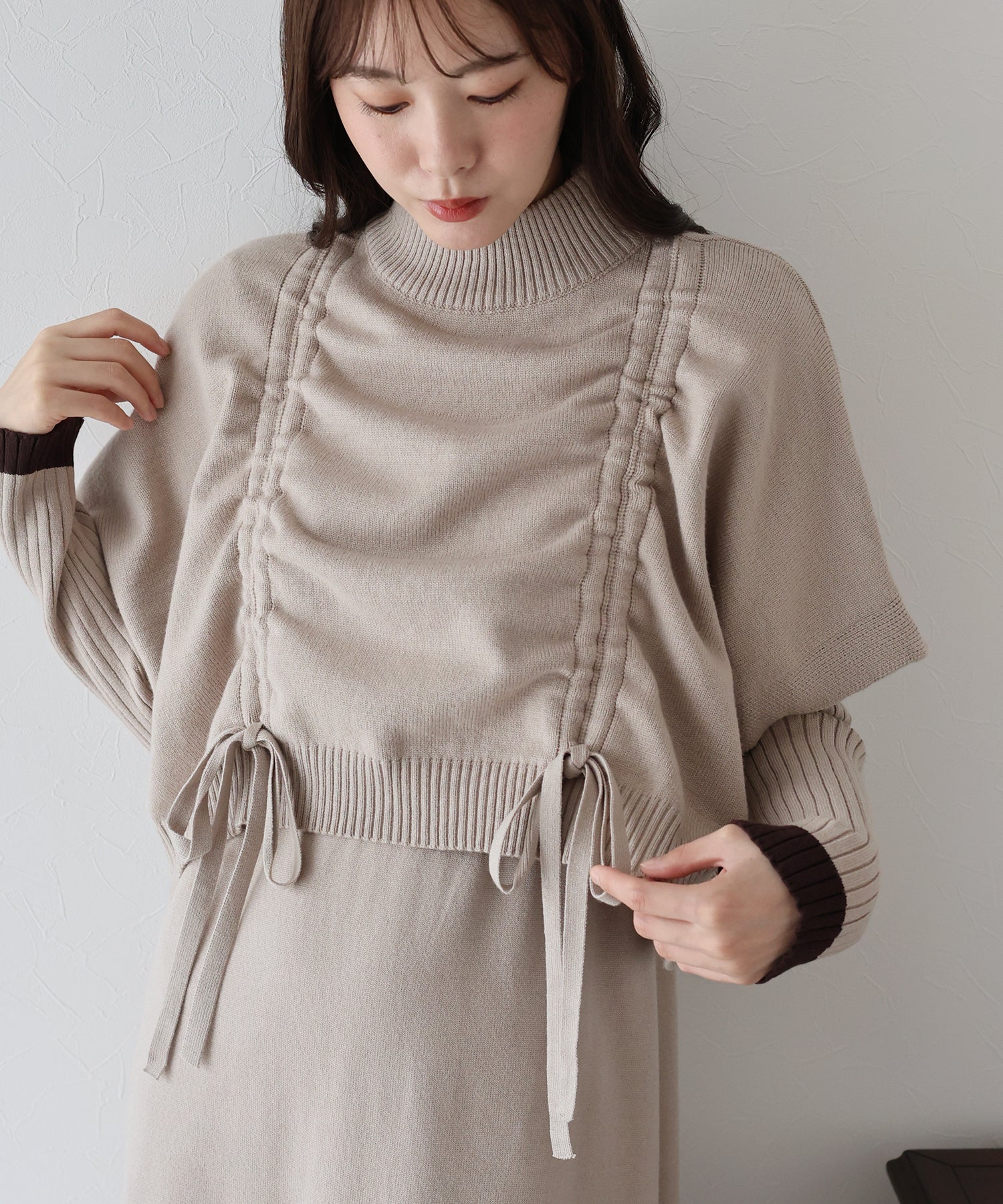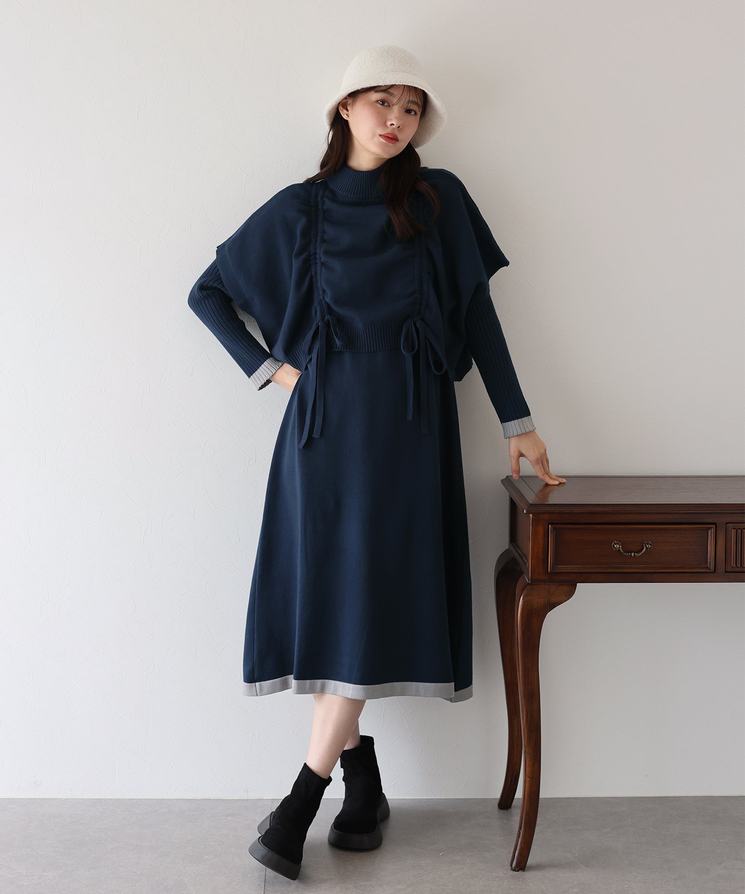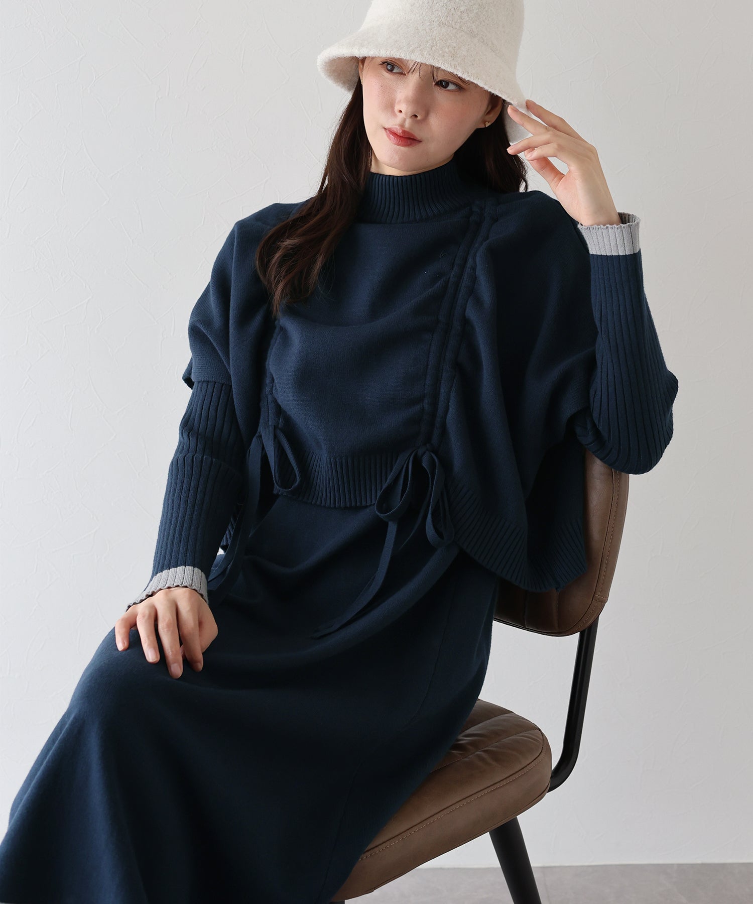 【TIME SALE】選べる2丈・吸湿発熱・リボンケープニットベスト&リブニットワンピース