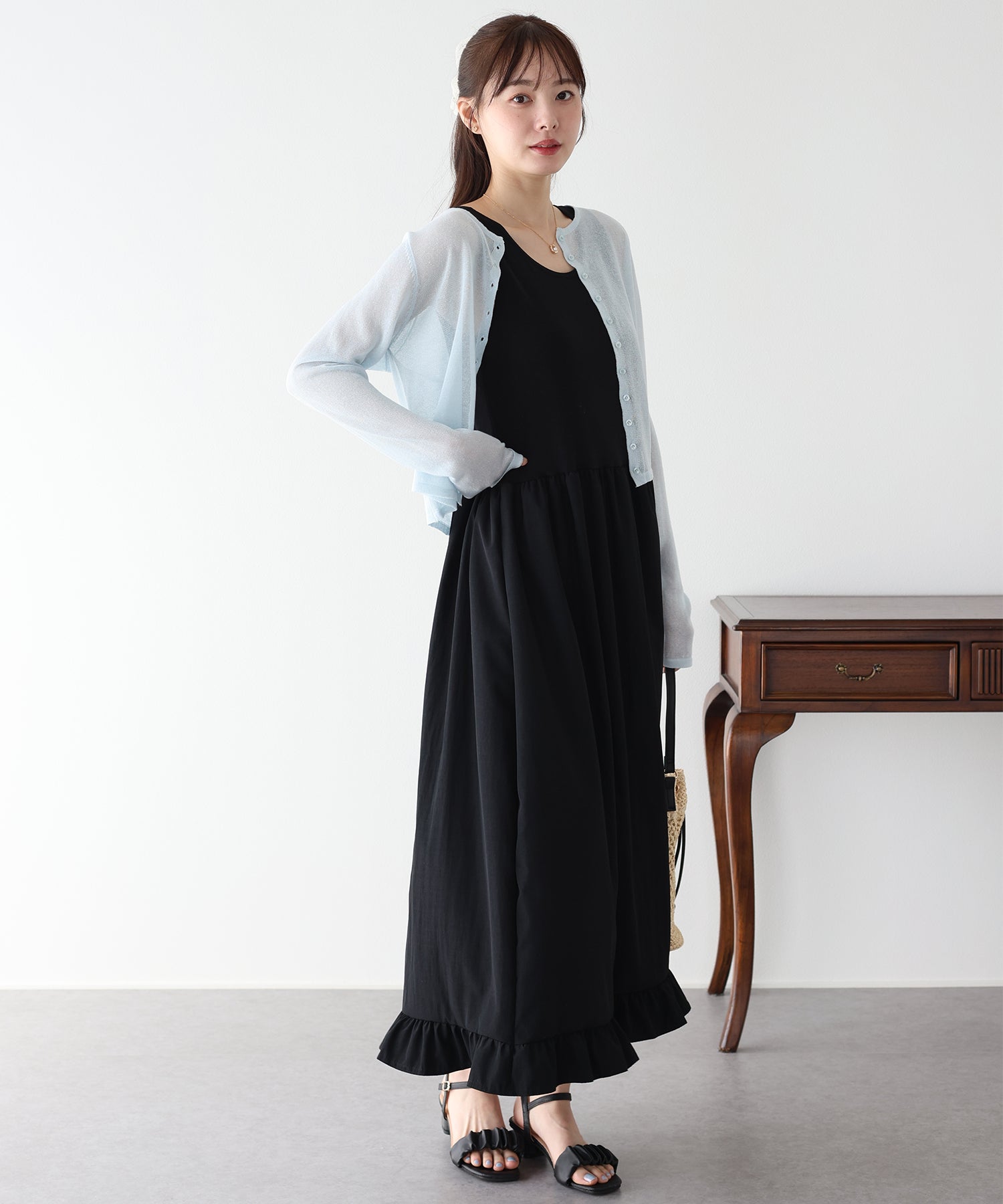 計算された異素材の組み合わせが、単調になりがちなワンピーススタイルに奥行きを与えます。