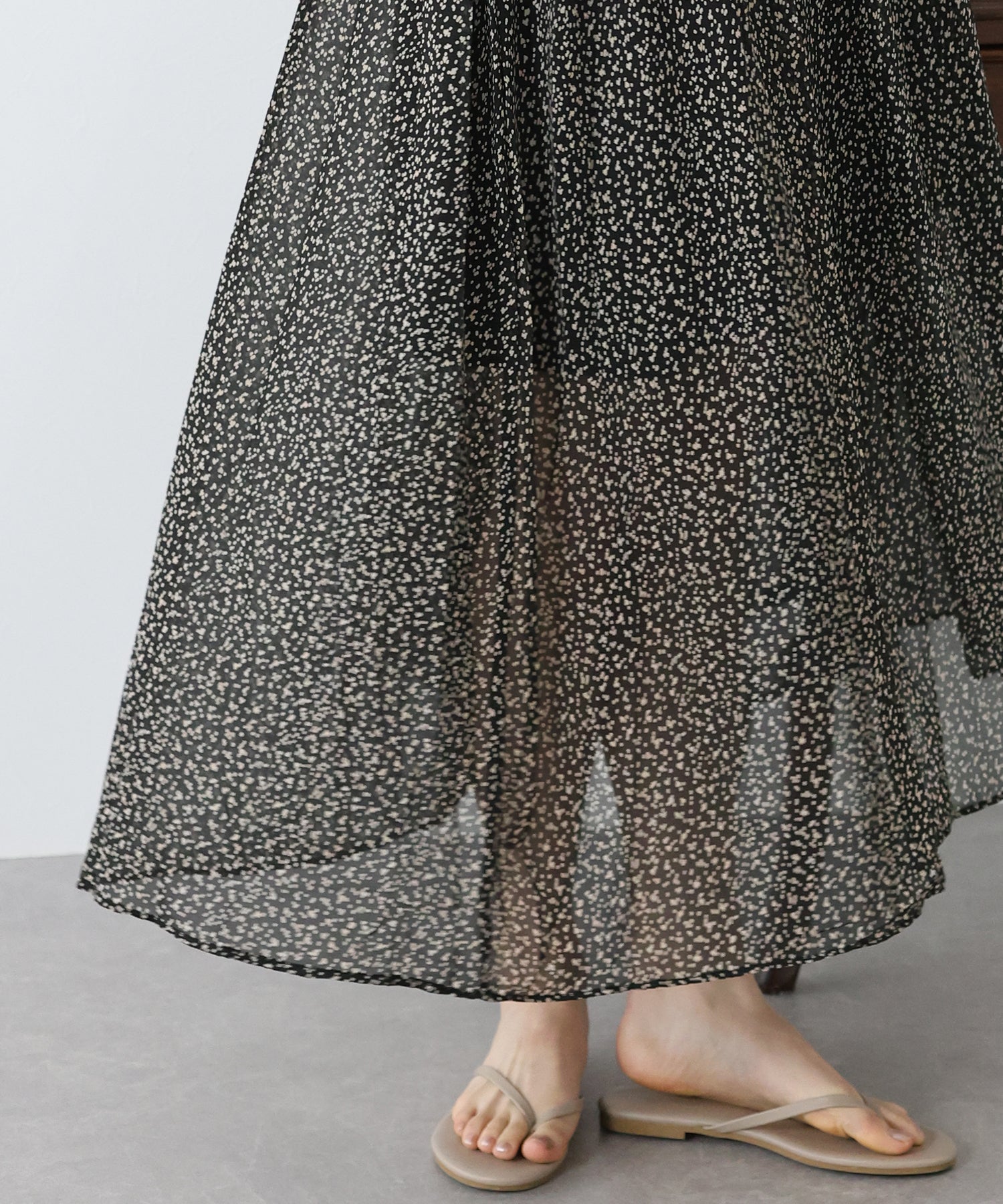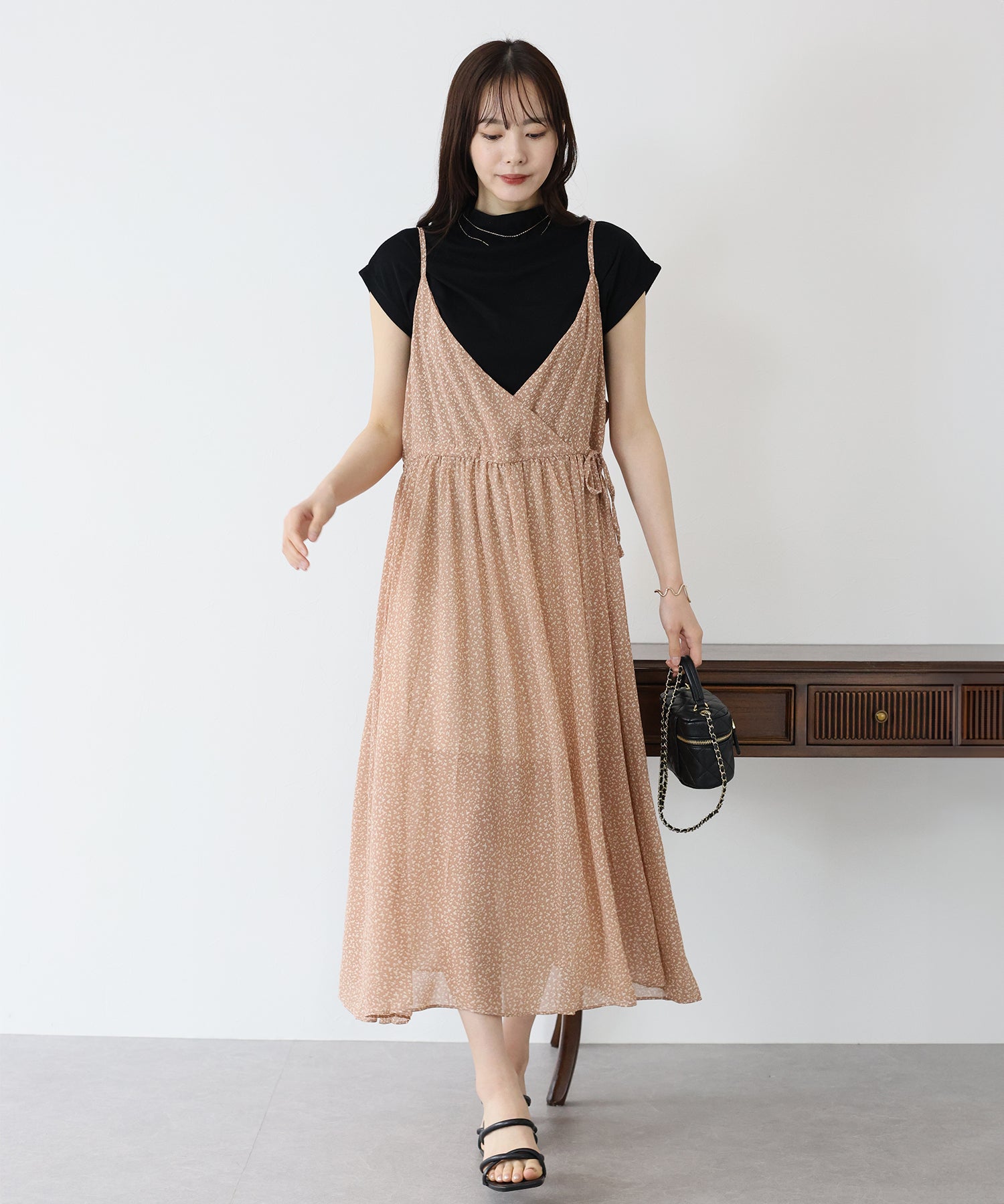 柔らかいシフォン素材にシンプルな単色プリントを施したキャミワンピ。
