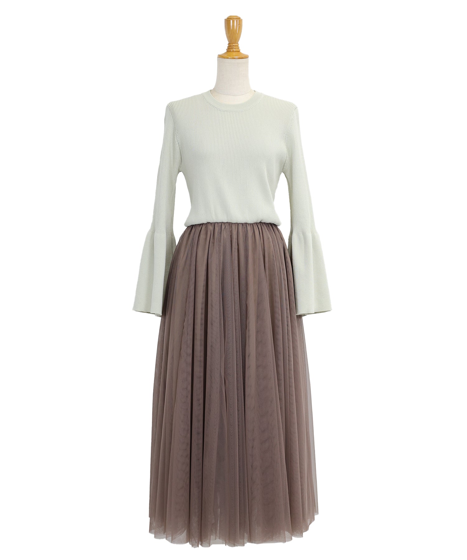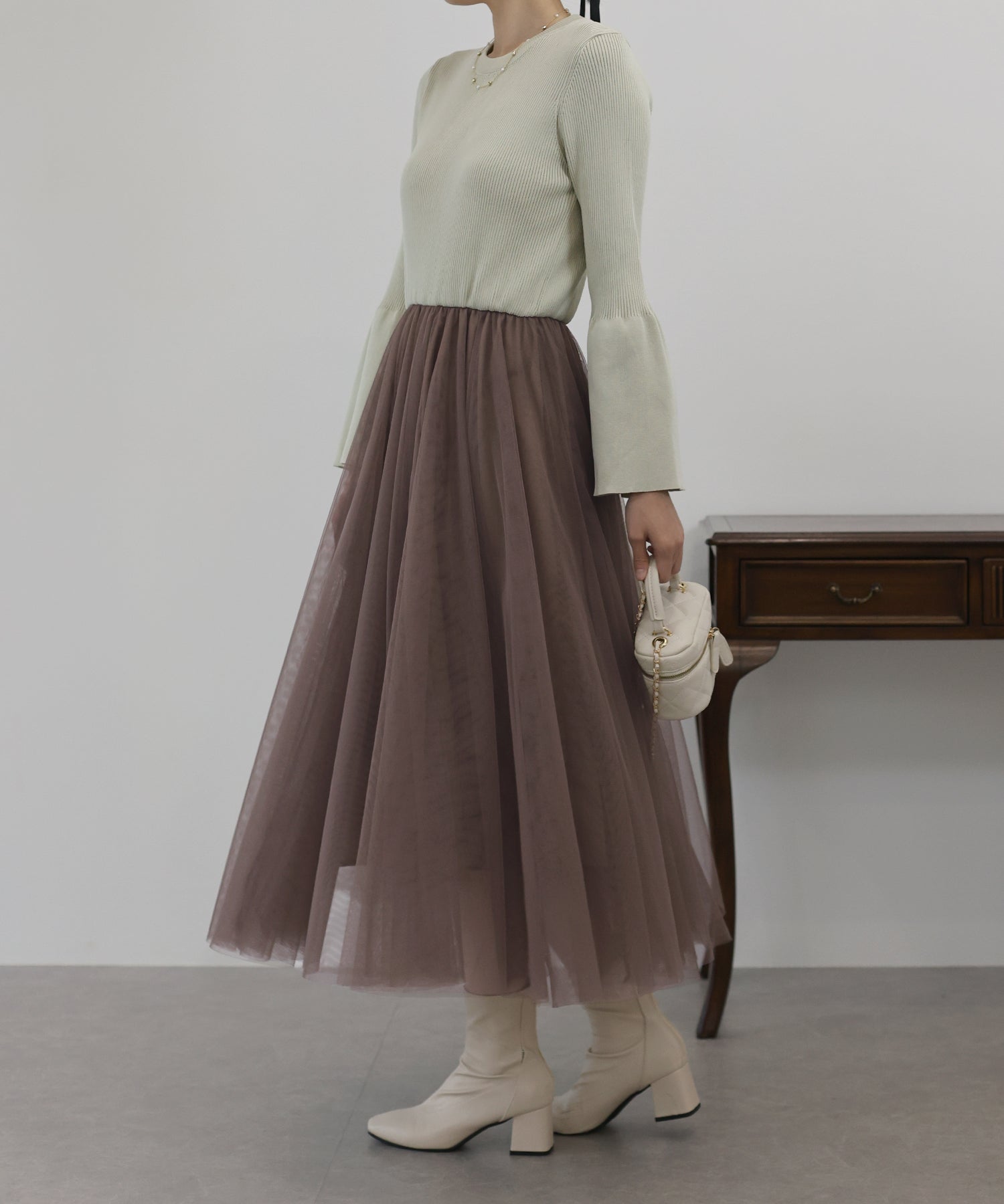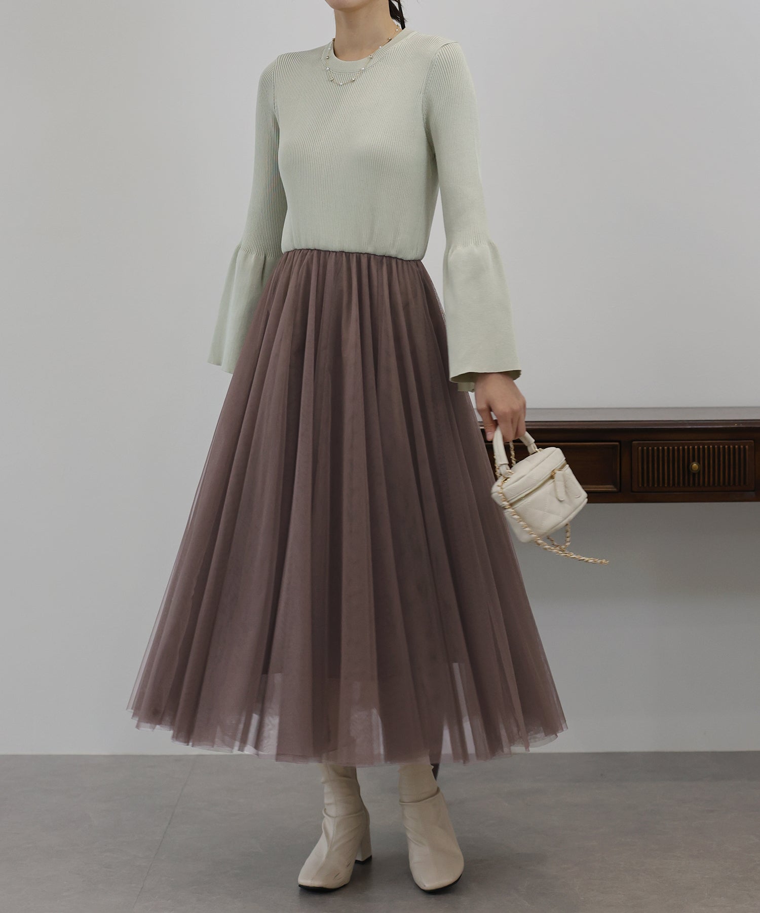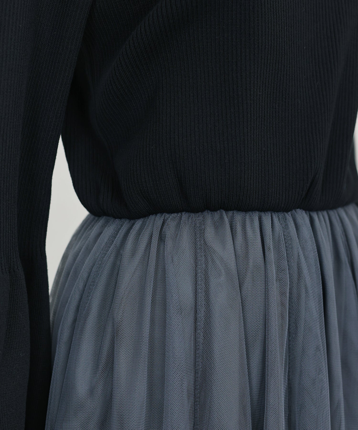 チュールスカートとリブニットの異素材使いが可愛いドッキングワンピース。