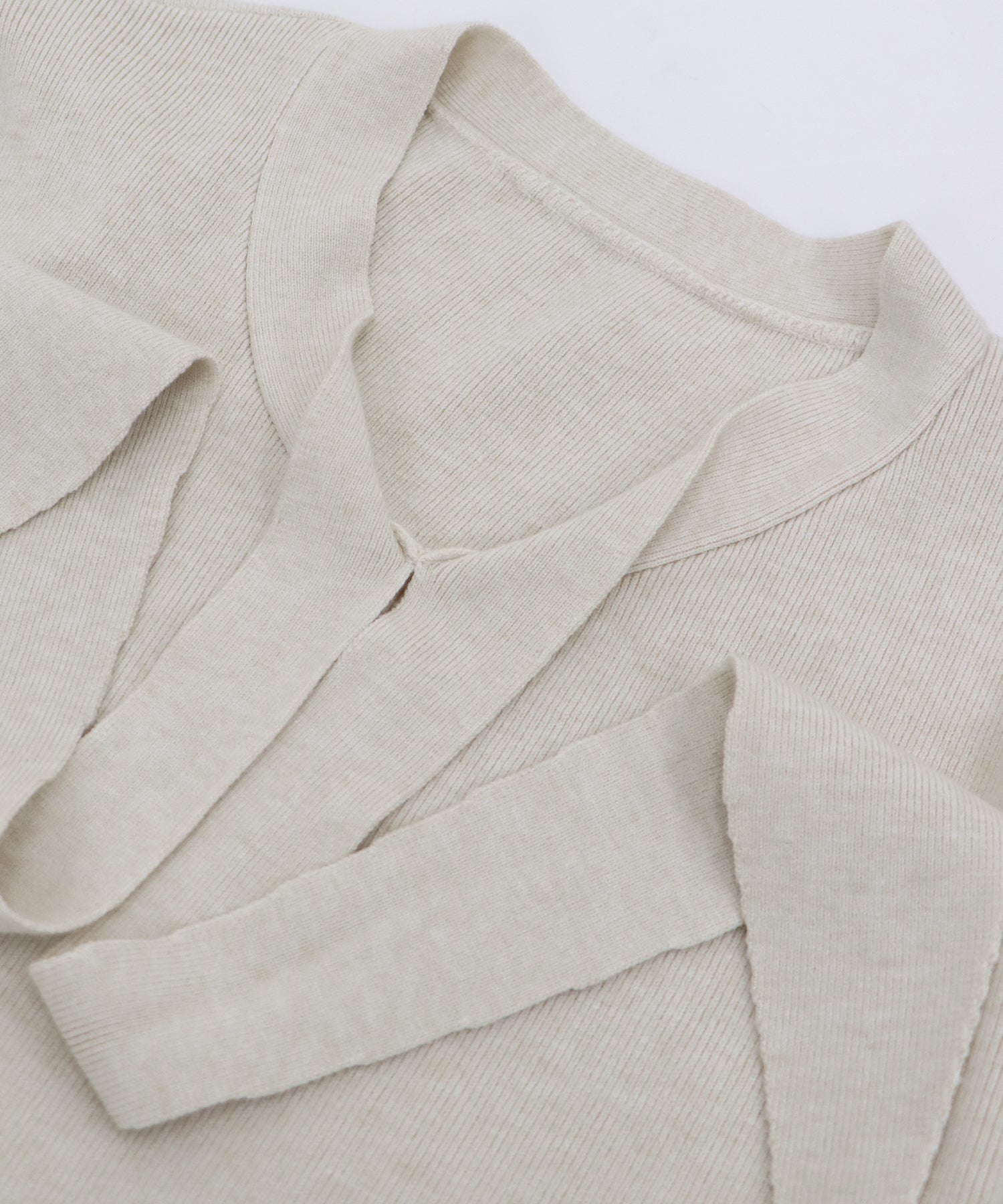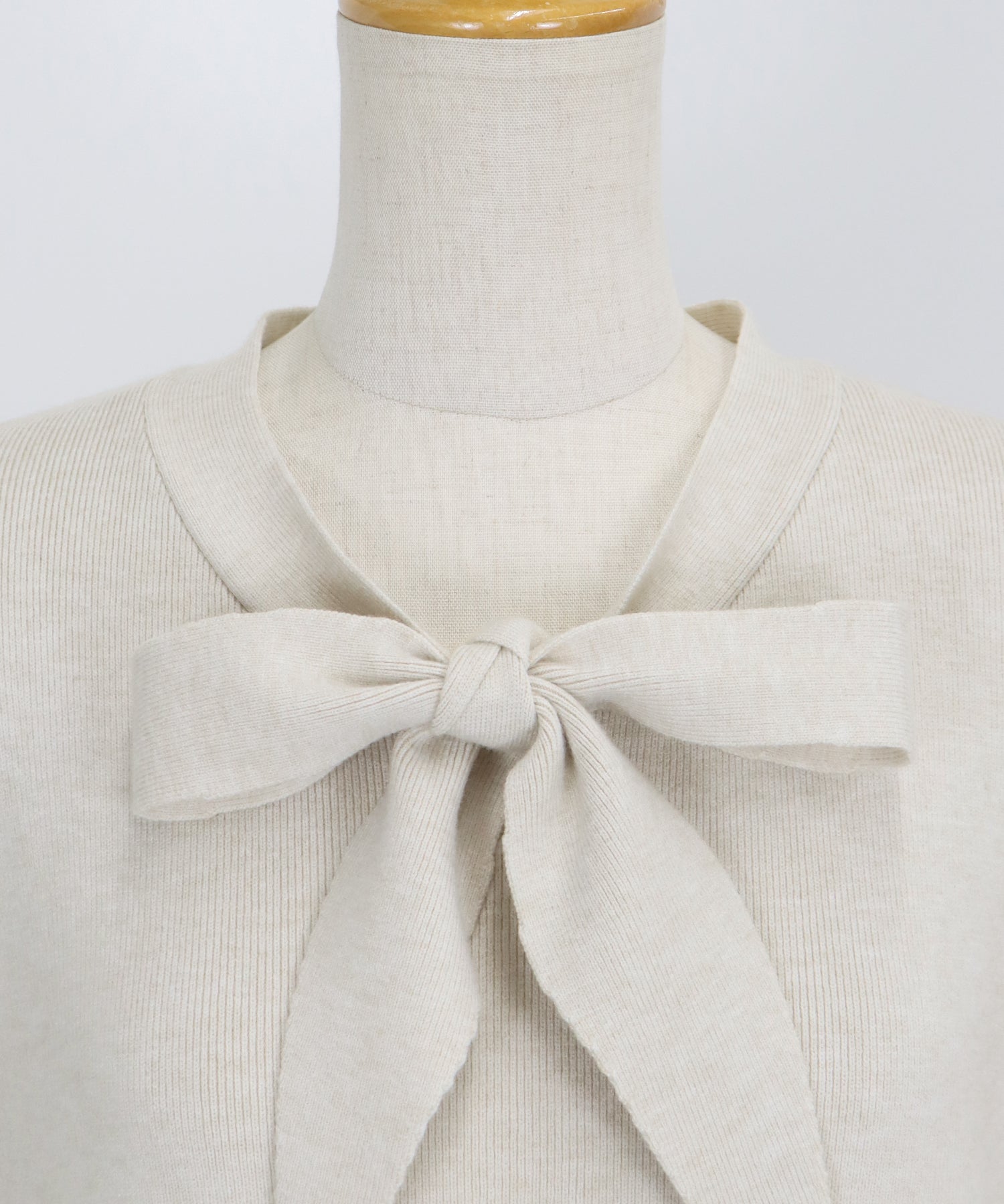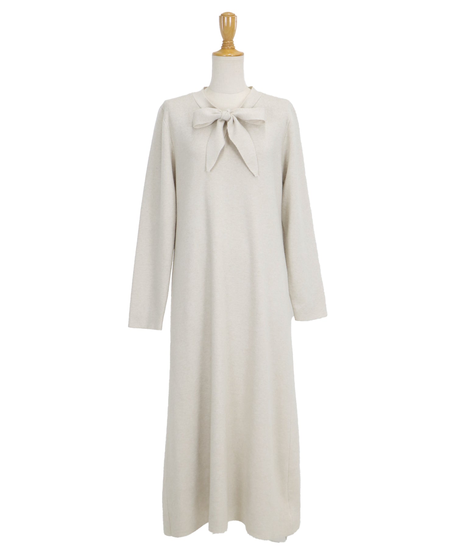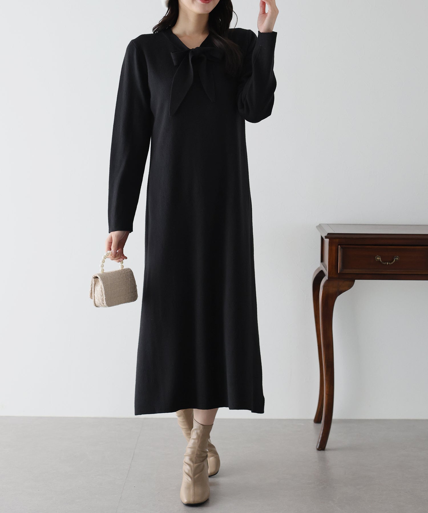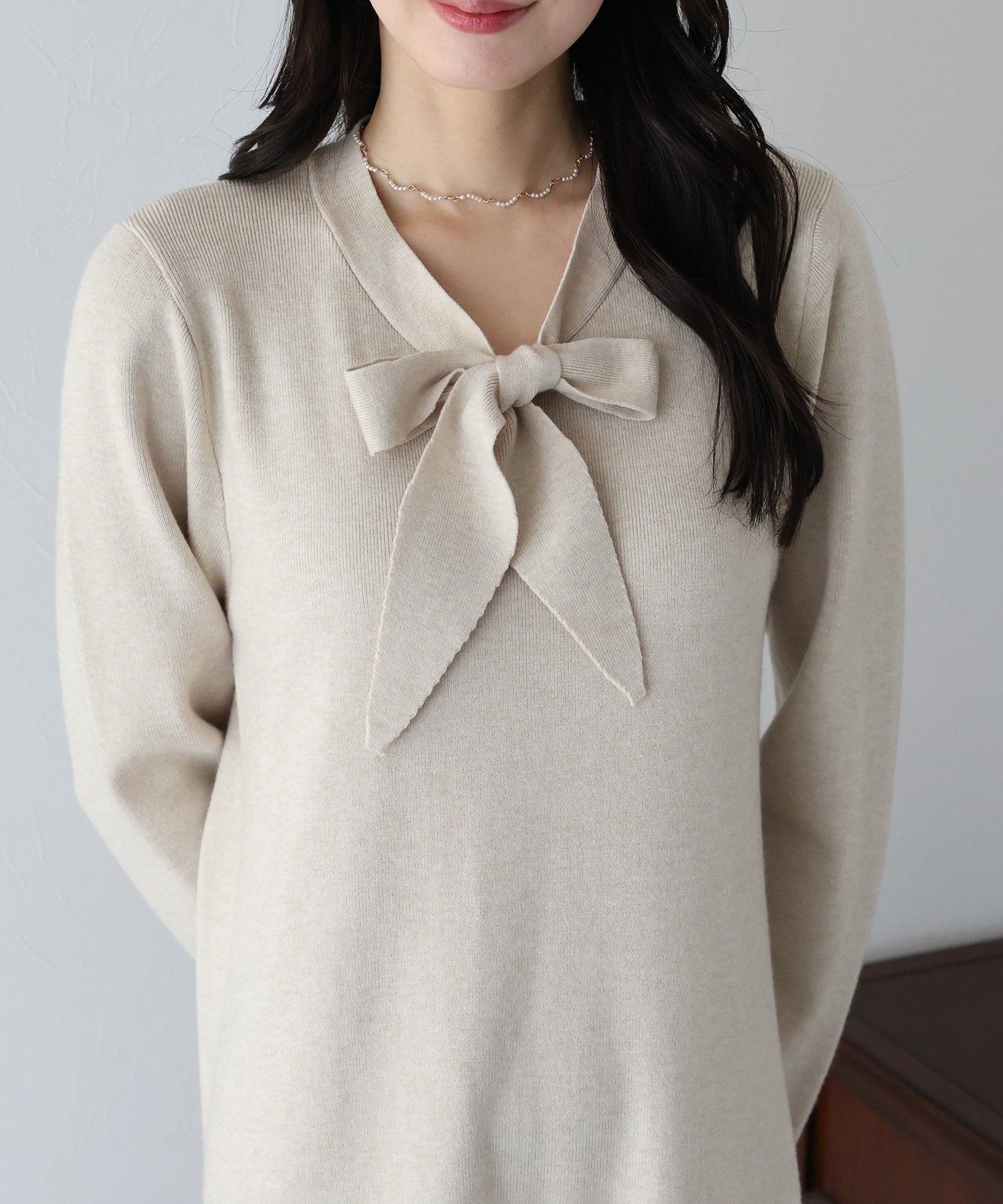 首元にあしらったボウタイが目を惹くニットワンピース。