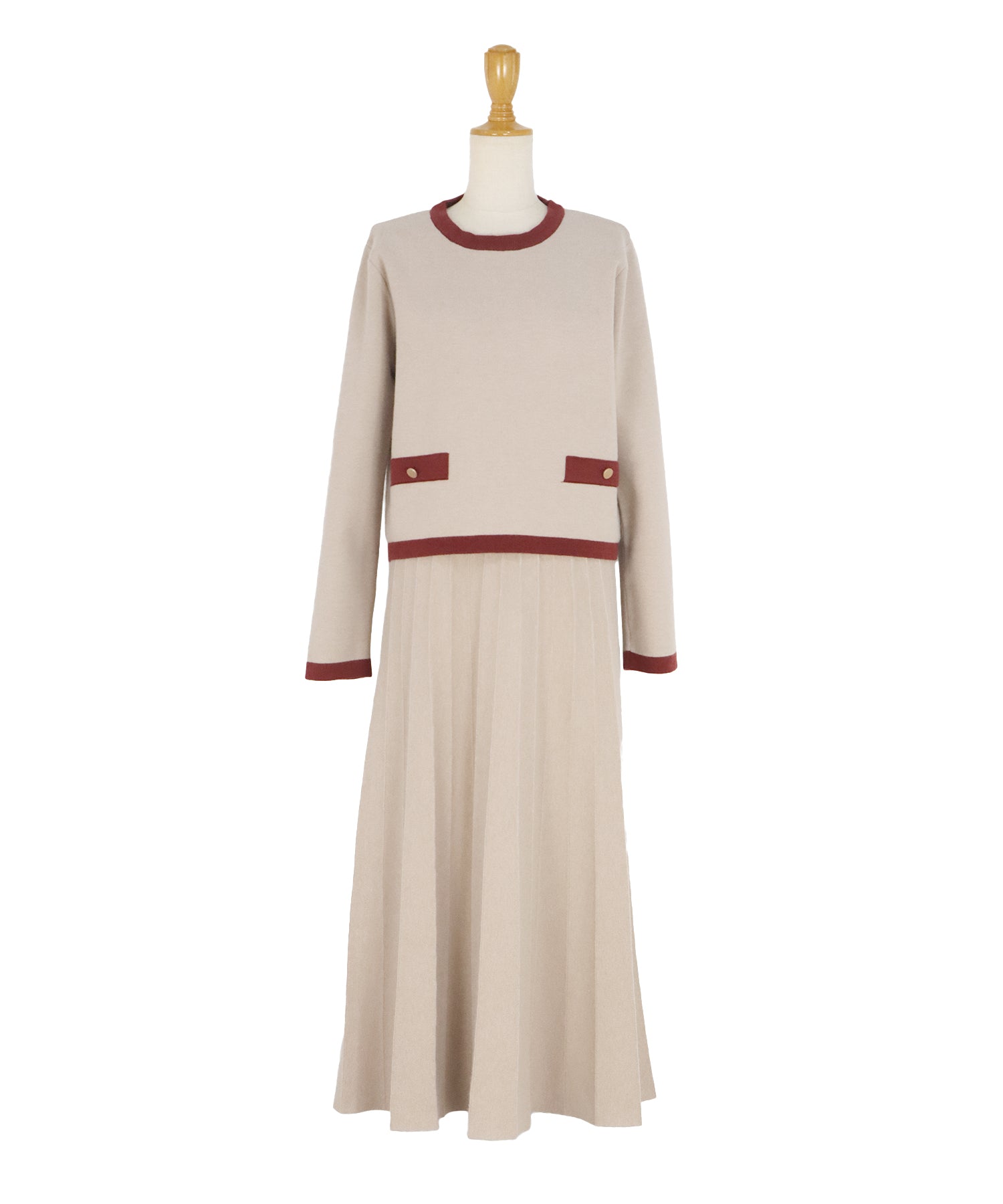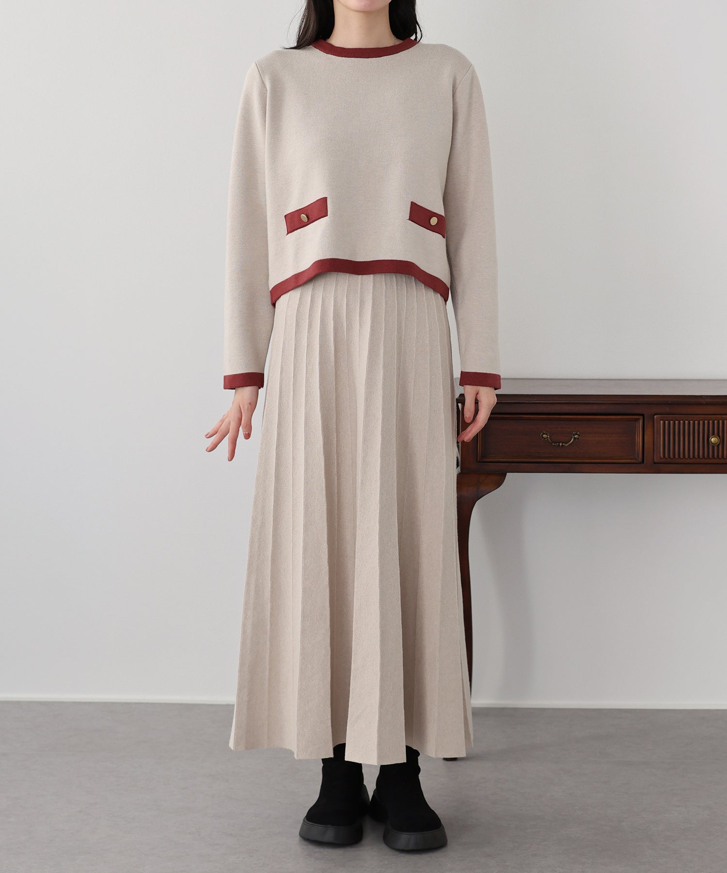 レディな配色ニットとニットプリーツスカートがセットになった着回し力抜群のアイテム。