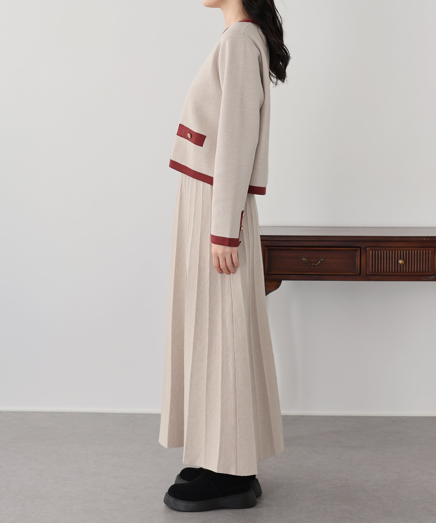 スカートはレディライクなニットプリーツデザインに仕上げ、落ち感があるのでラクに着られます。