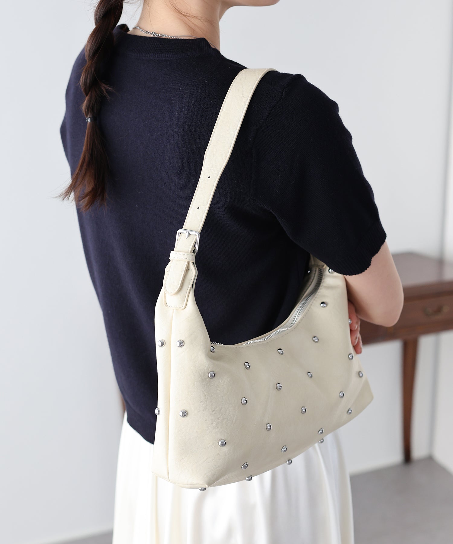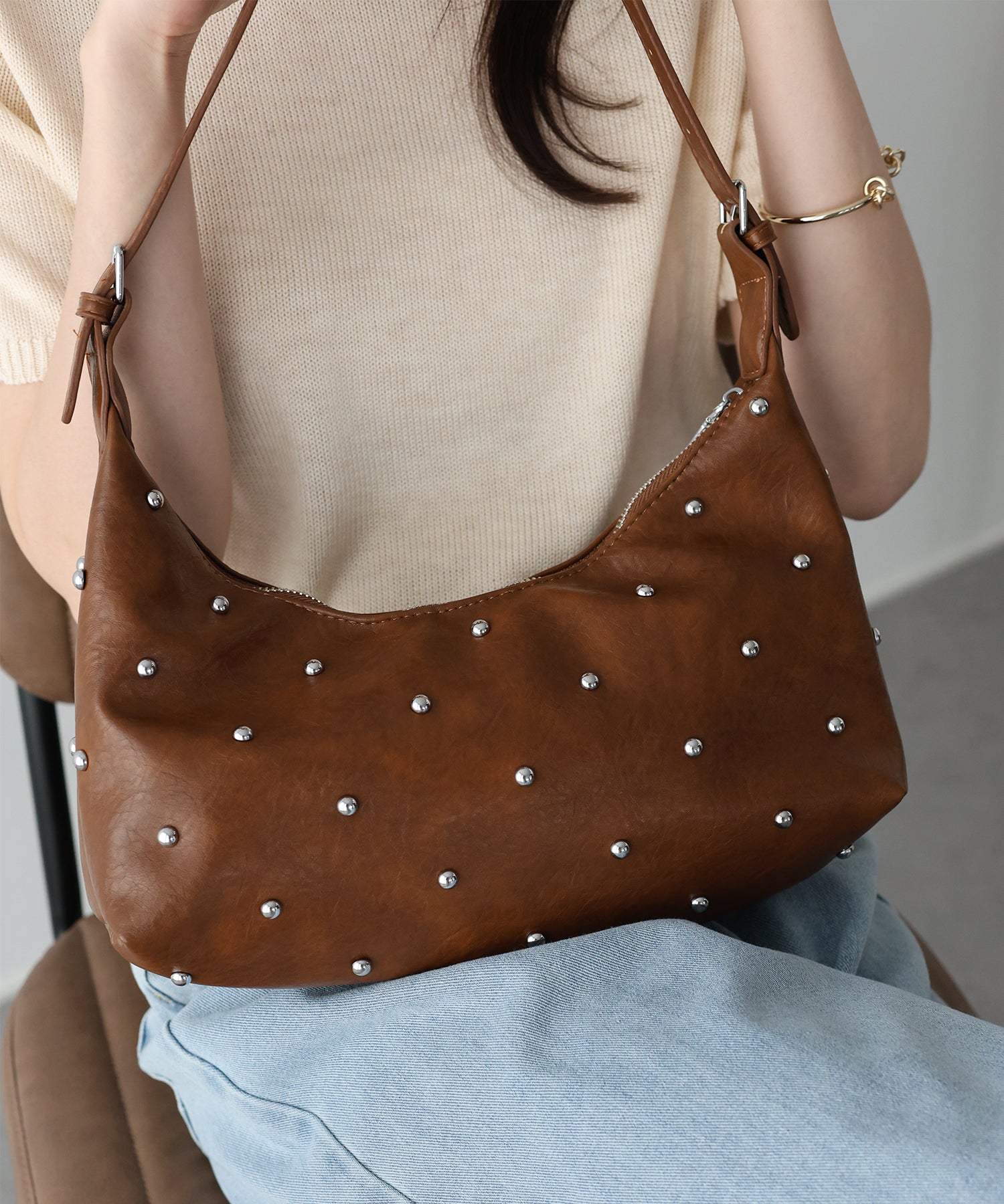 ハードな印象になりがちなスタッズデザインですが、洗練されたフォルムとシルバーの光沢感が相まって、大人の女性にふさわしい上品なモード感を演出。