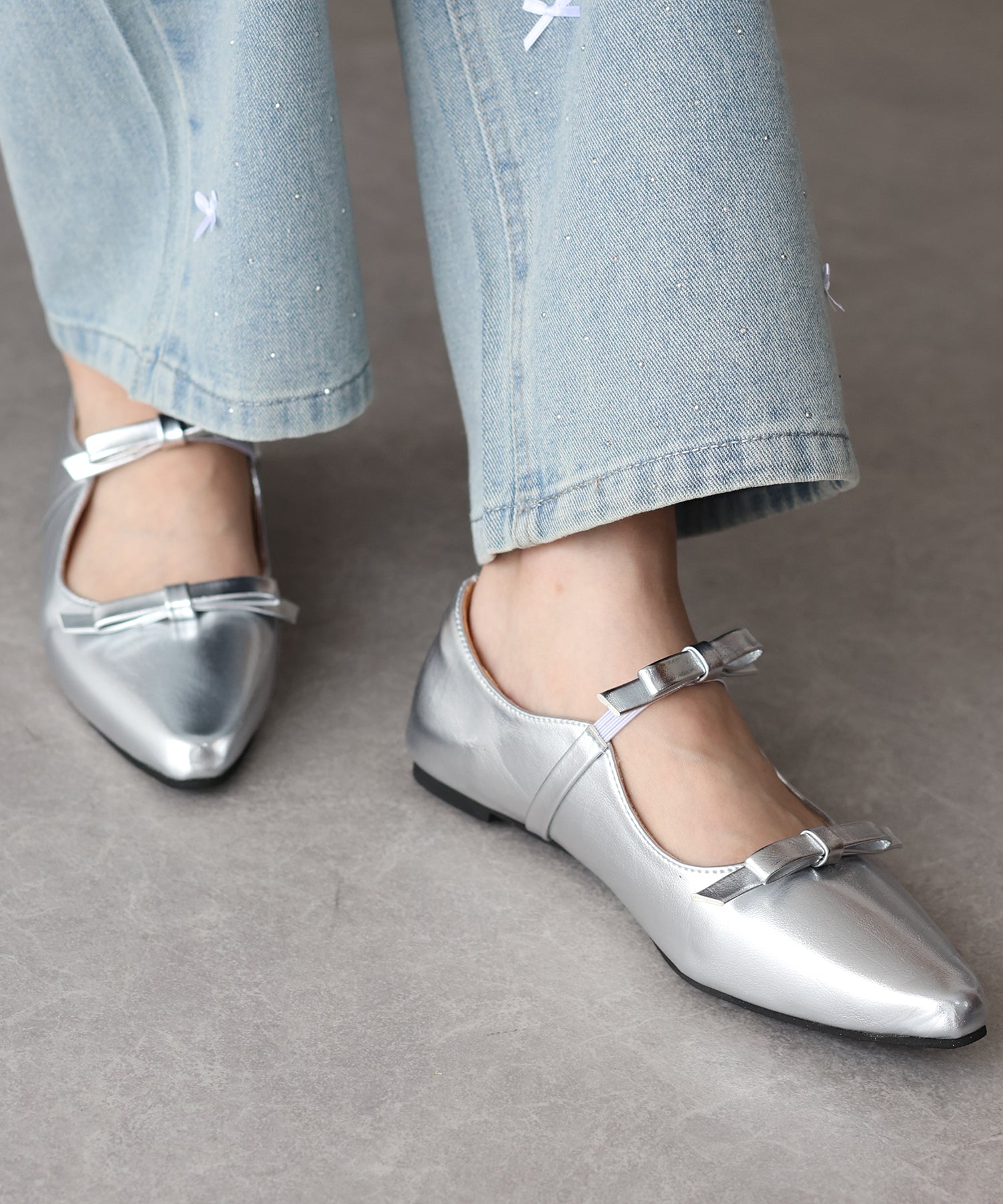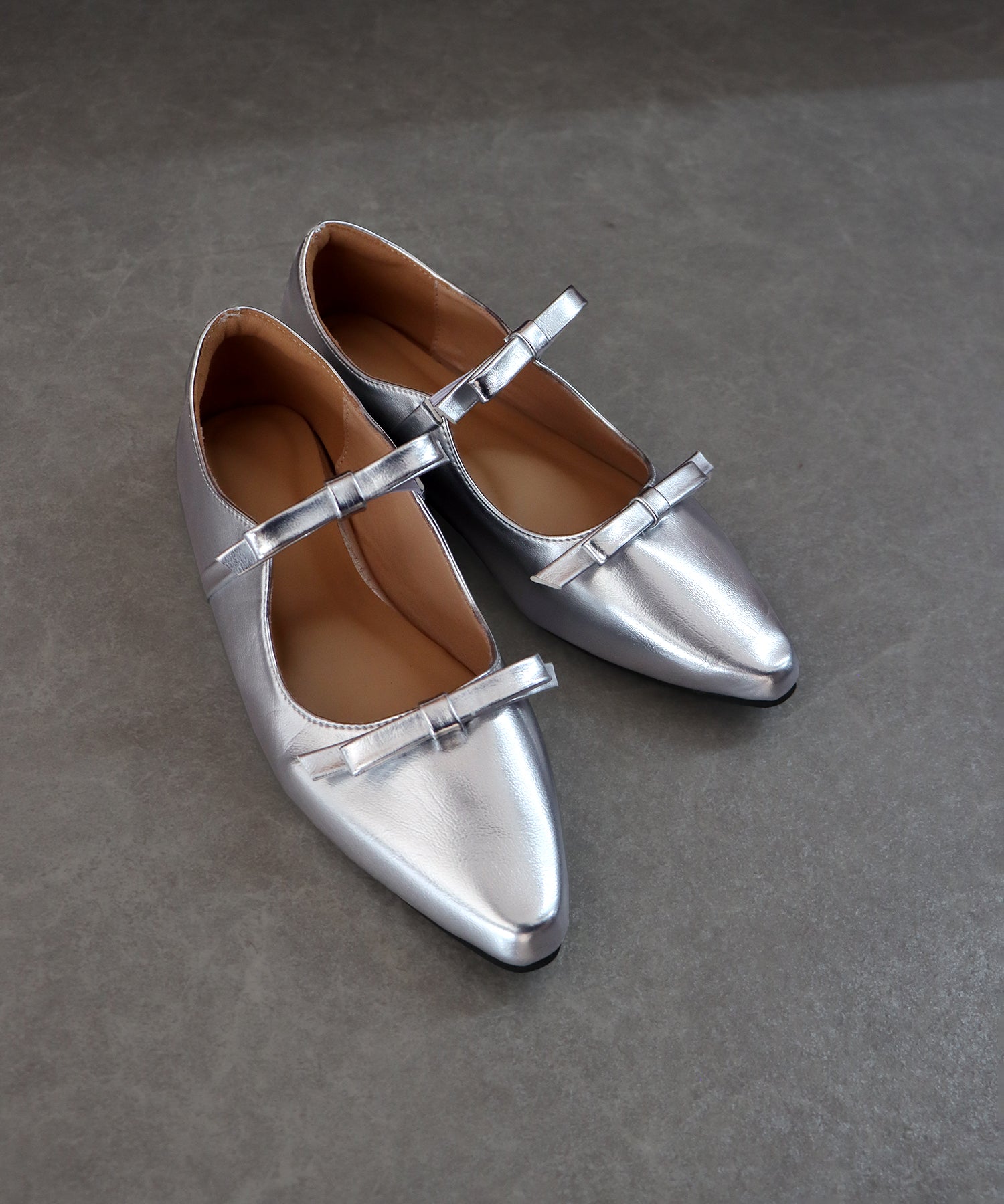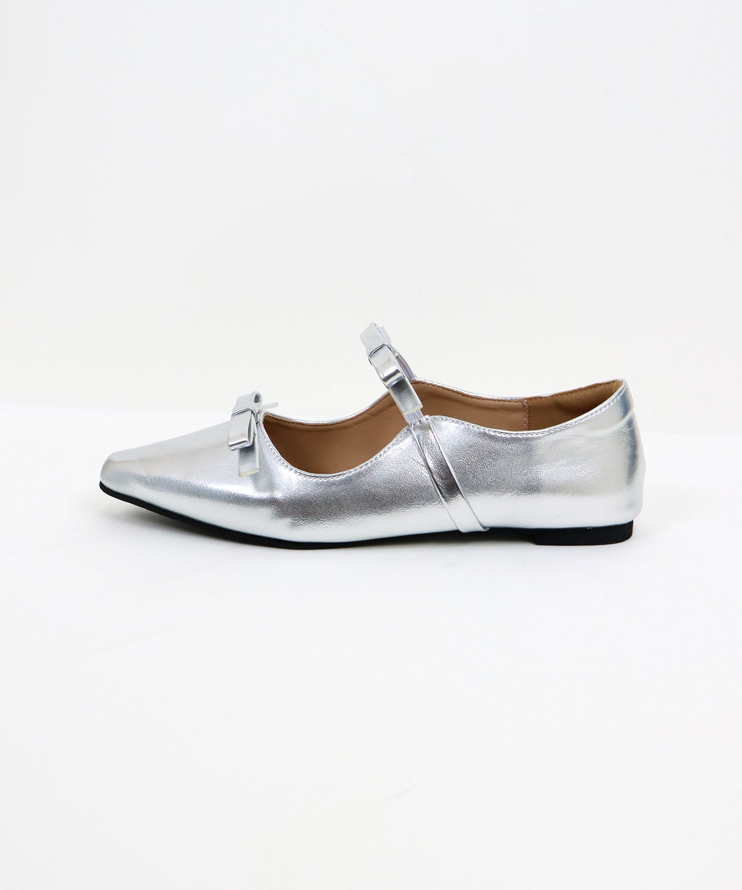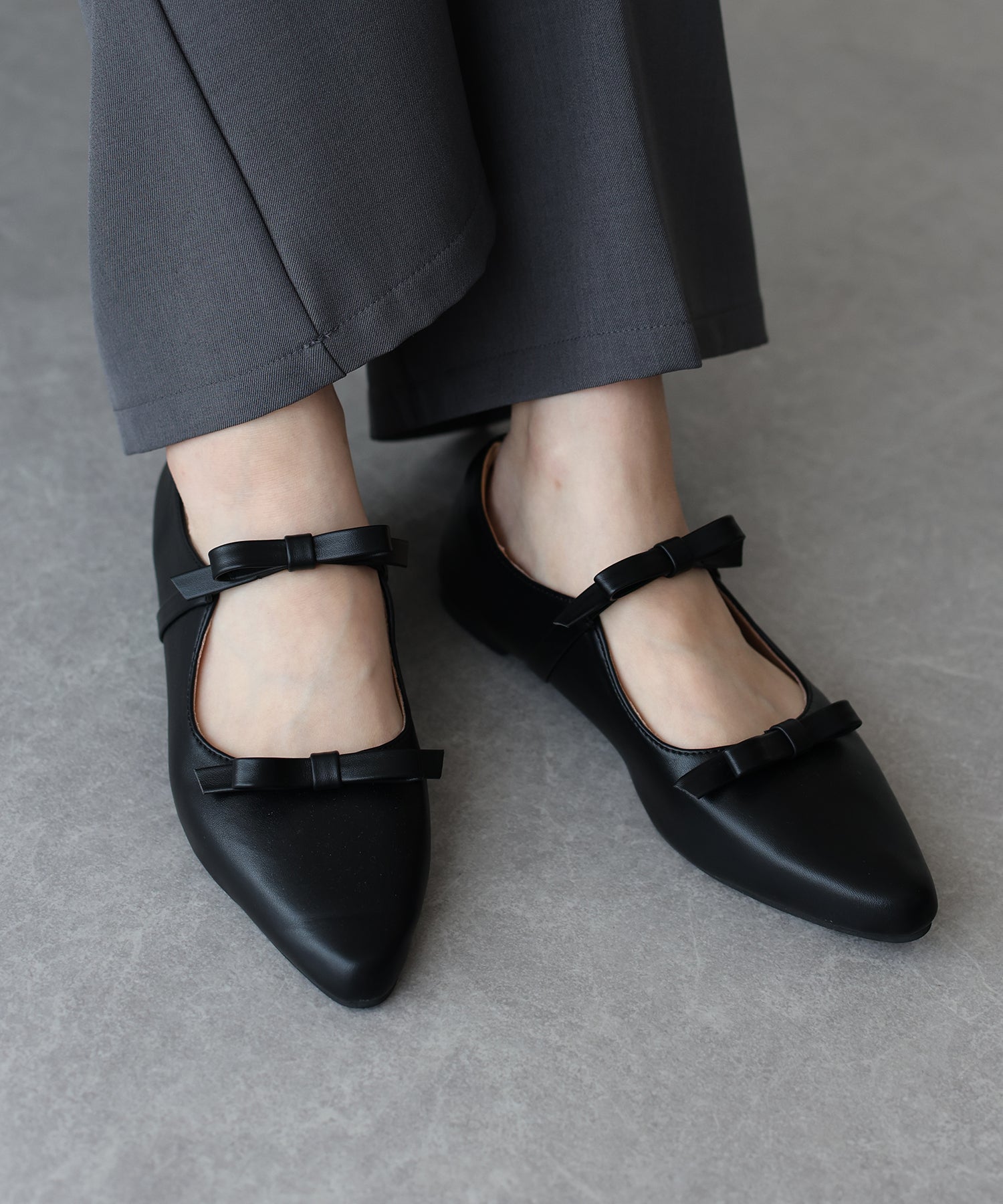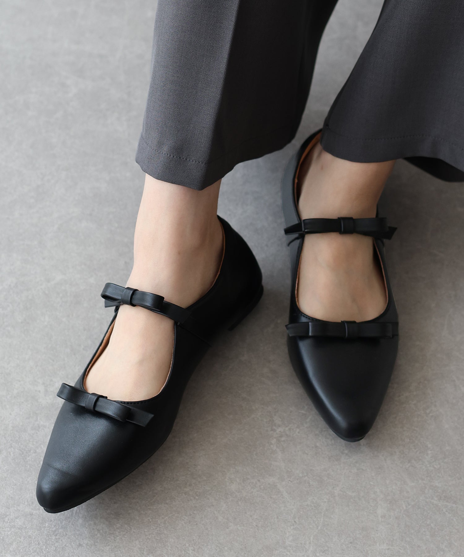 シャープなポインテッドトゥに、あえて華奢で控えめなリボンのデザインにすることで