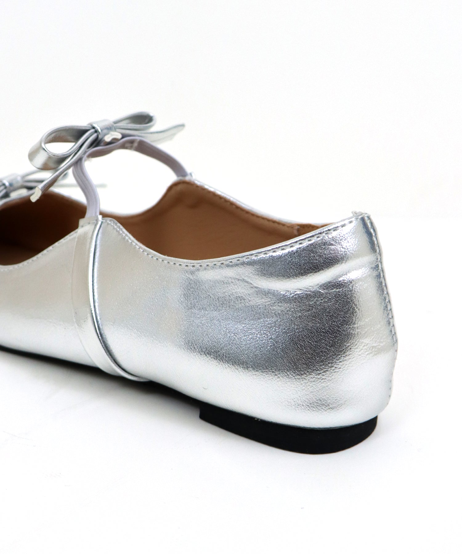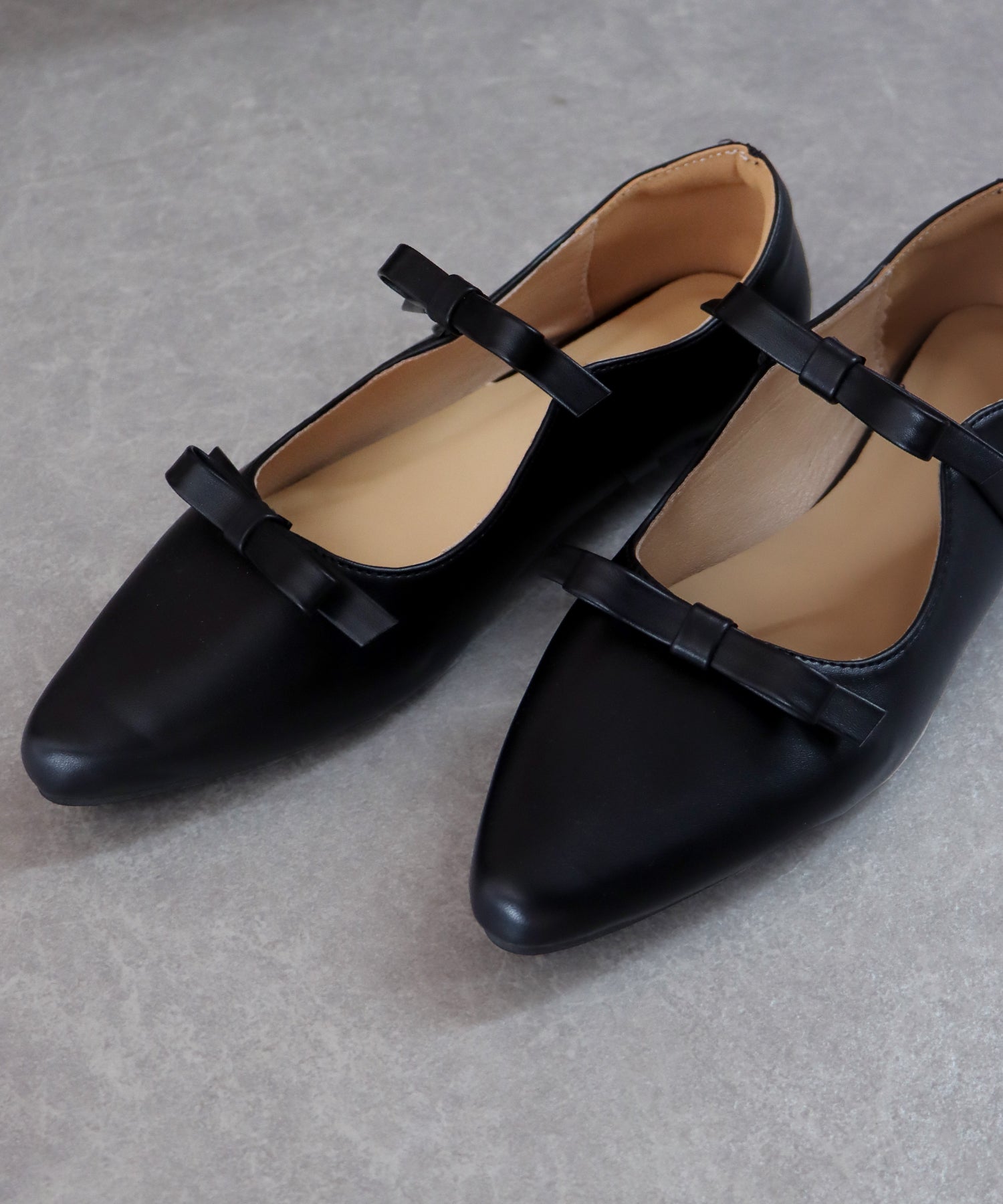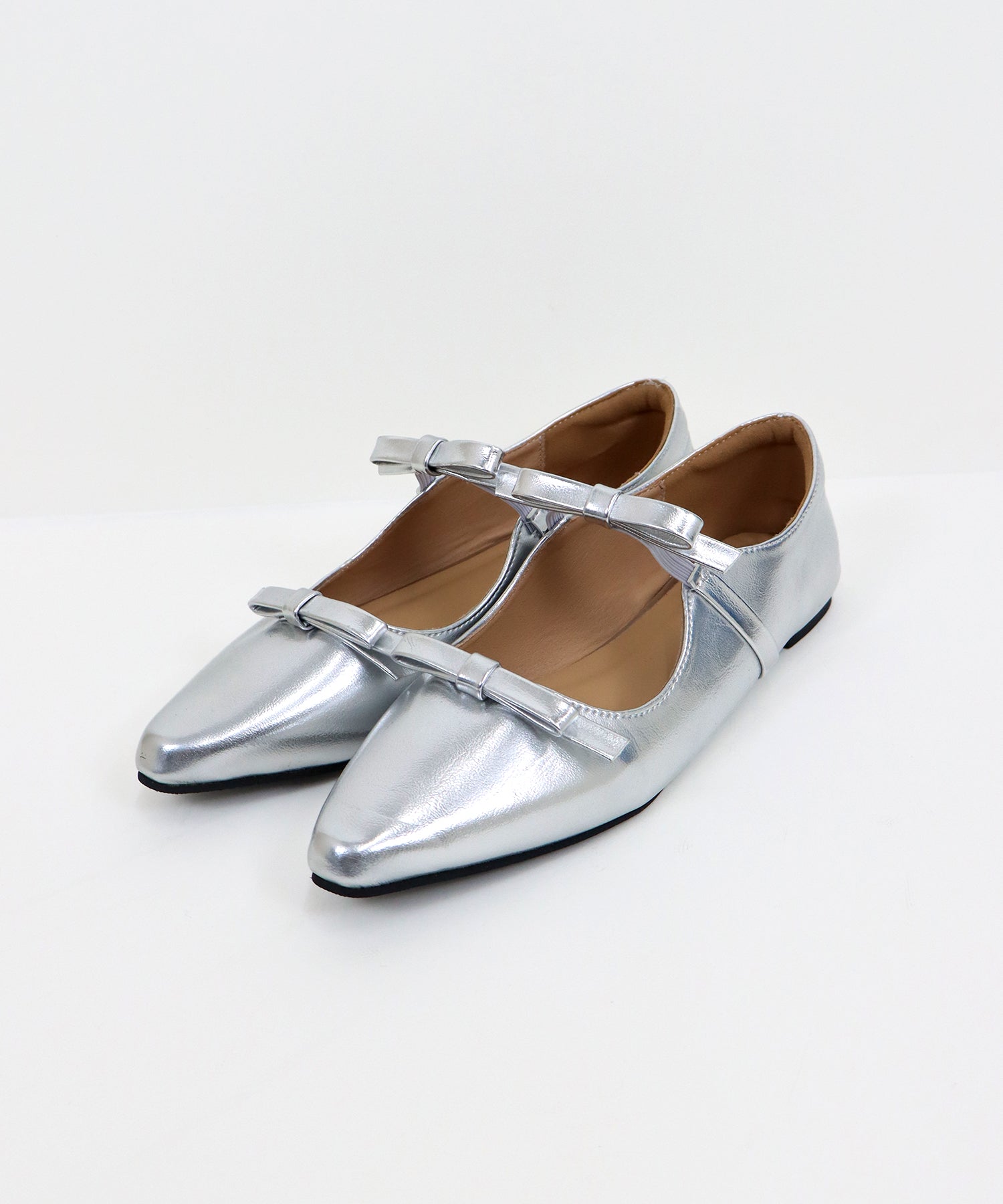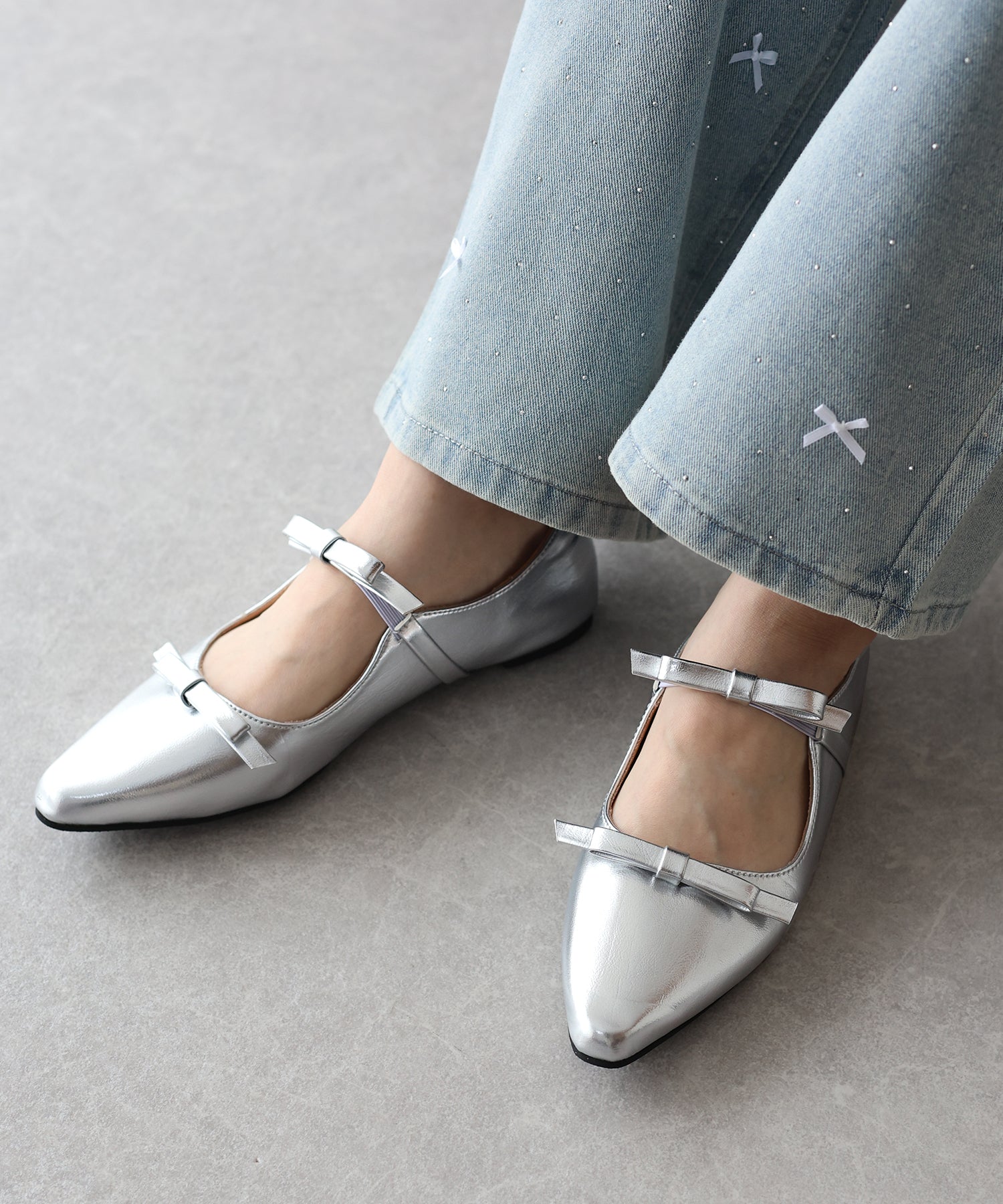 シャープなポインテッドトゥに、あえて華奢で控えめなリボンのデザインにすることで