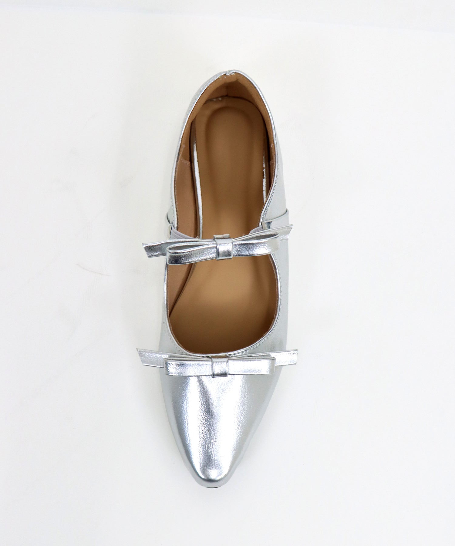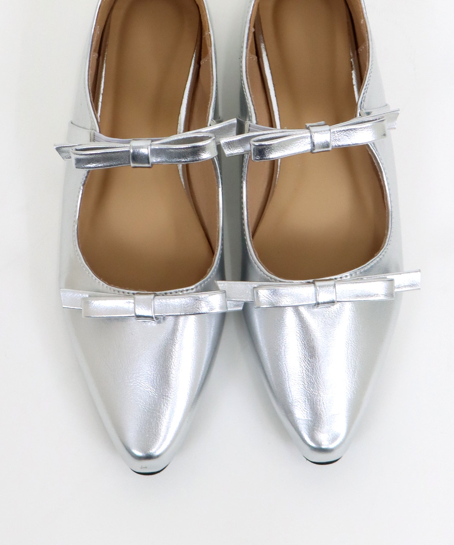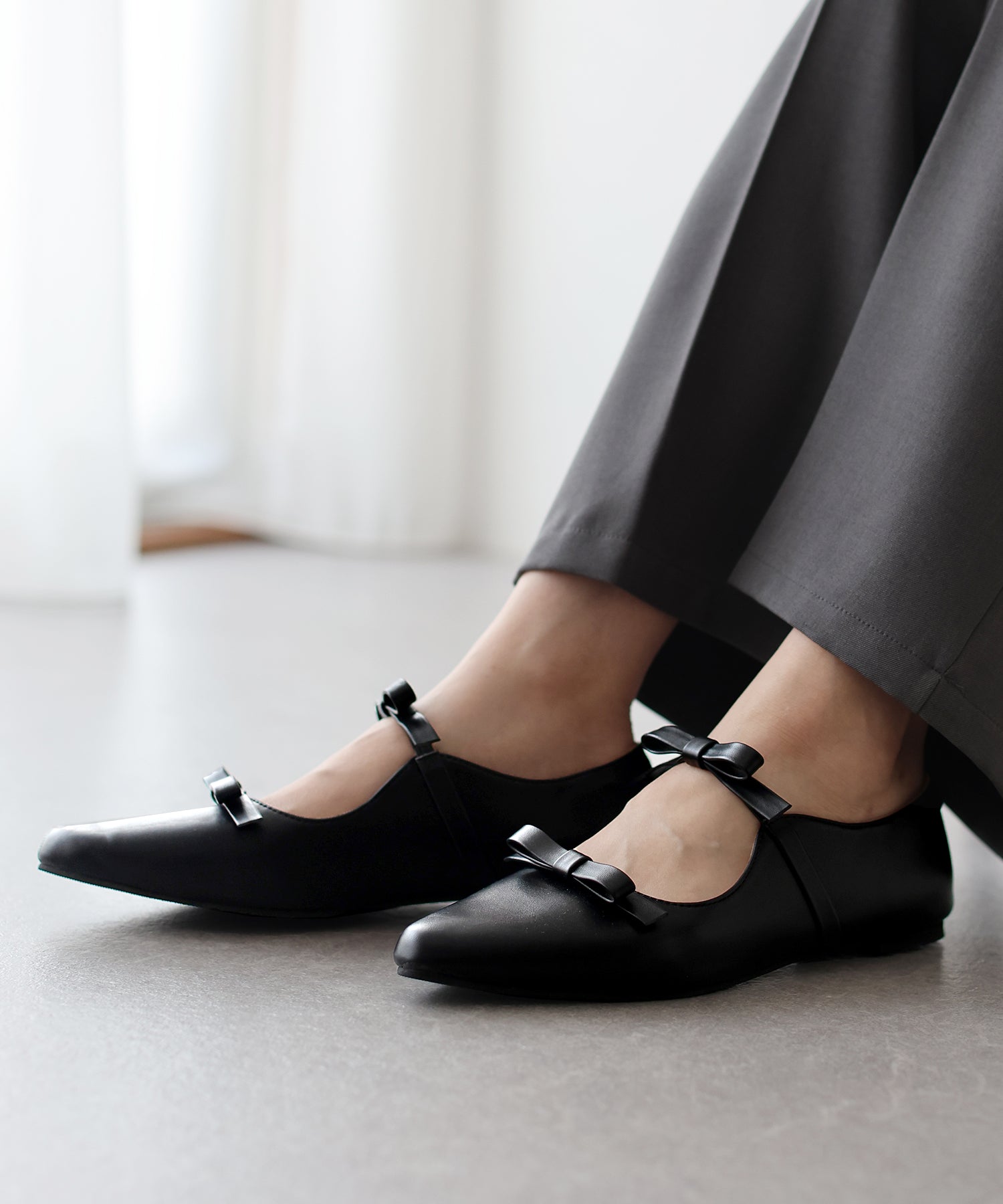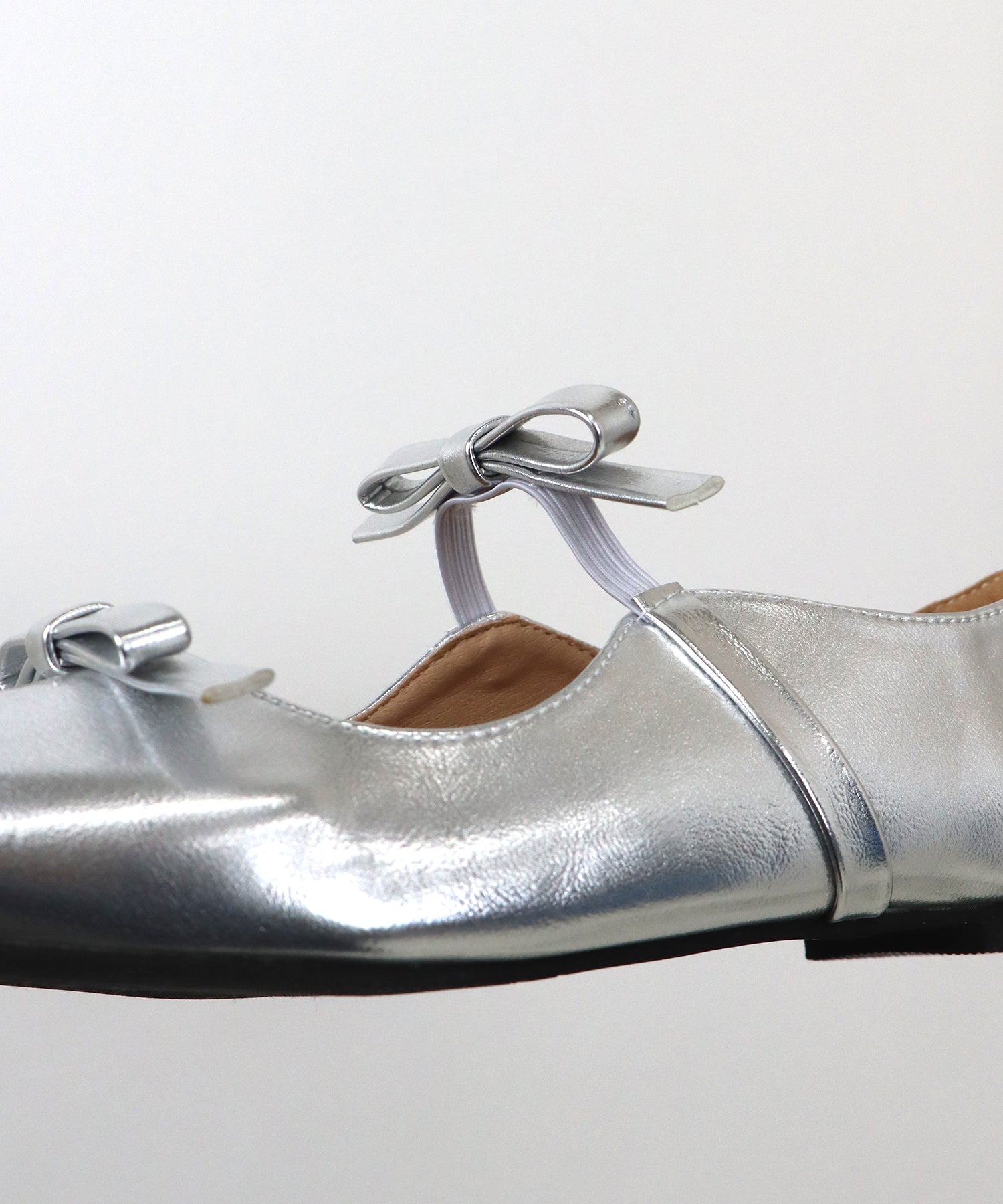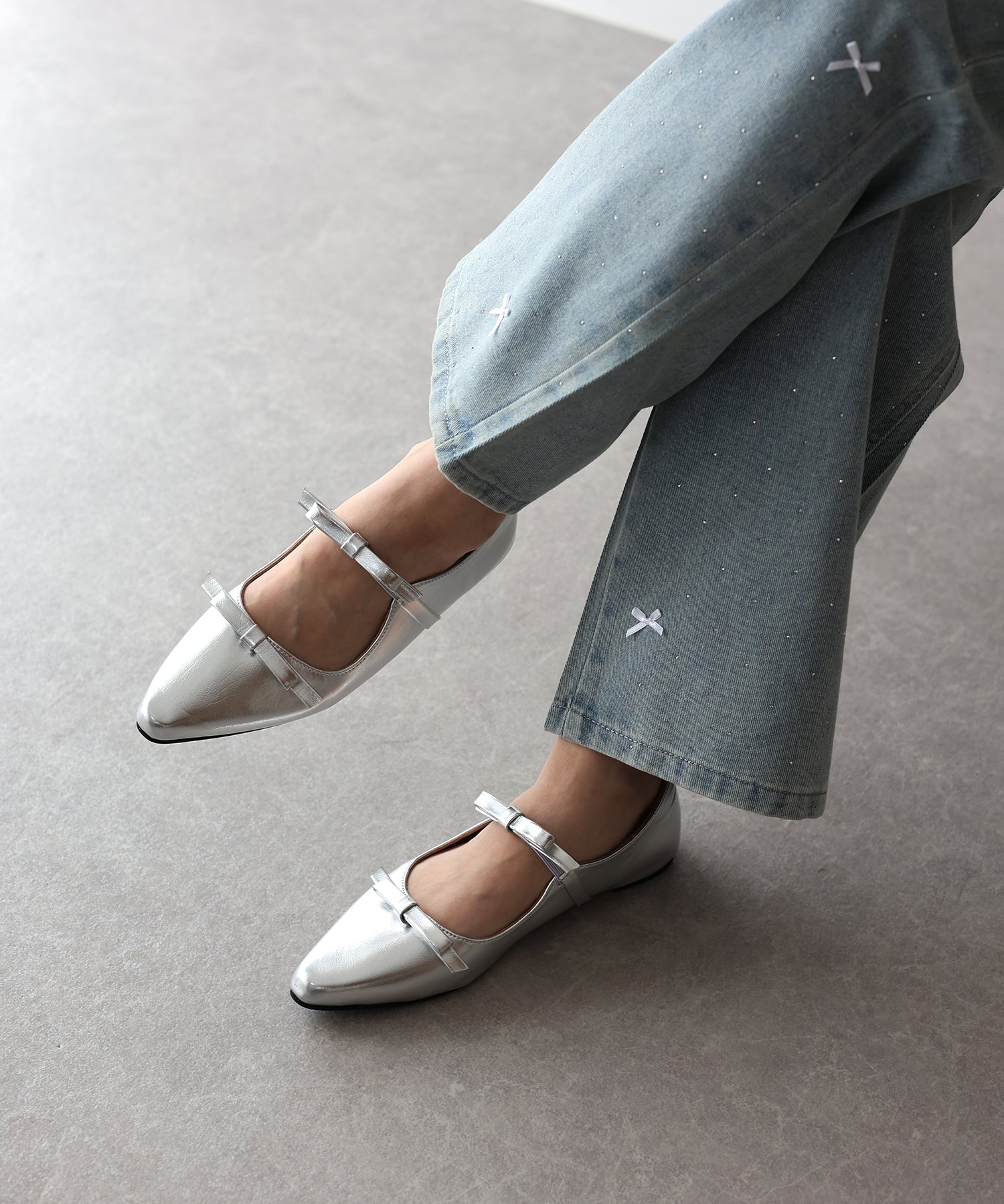 シャープなポインテッドトゥに、あえて華奢で控えめなリボンのデザインにすることで