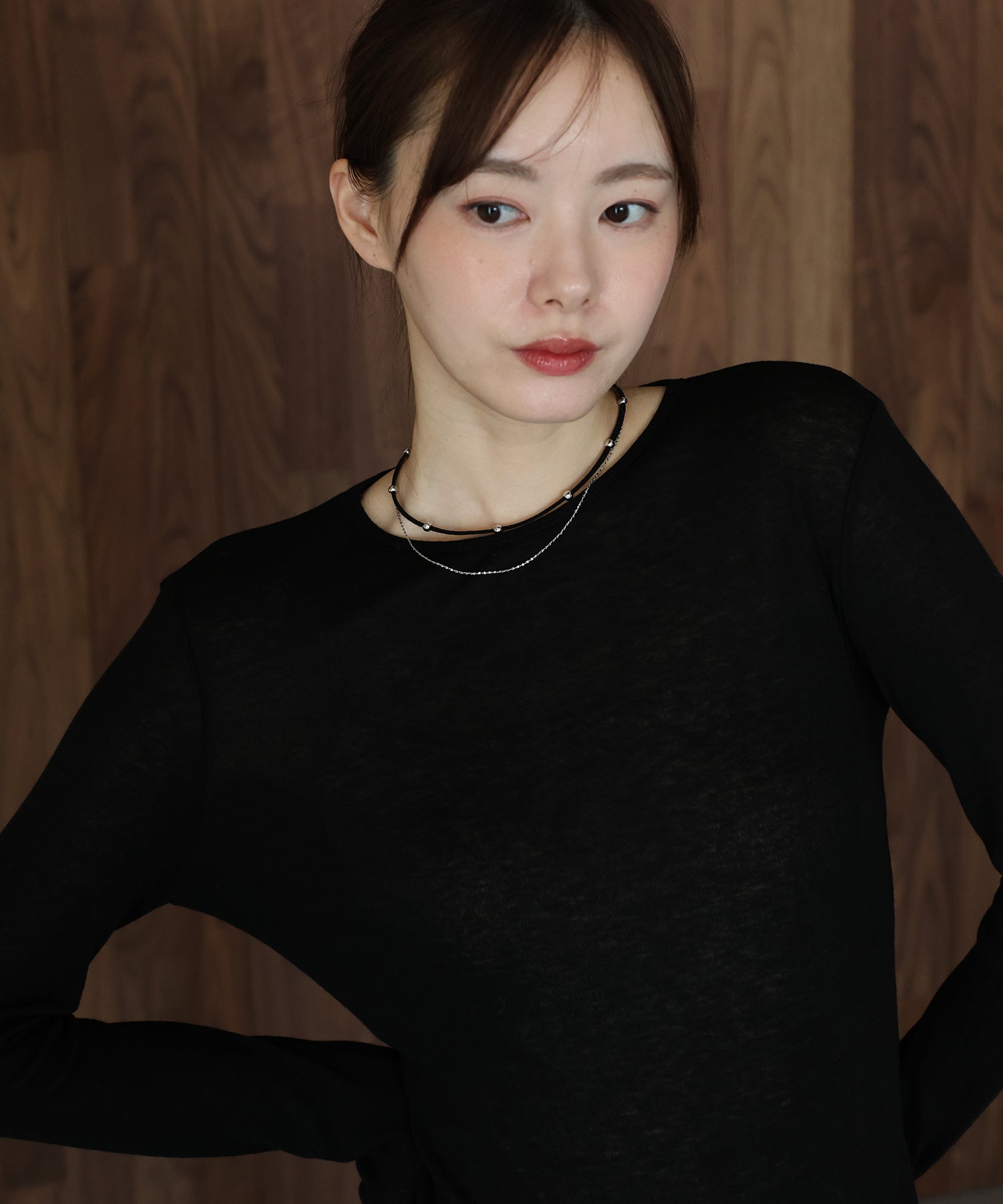 デコルテラインの開いたトップスやジャケットで合わせて綺麗めにも、