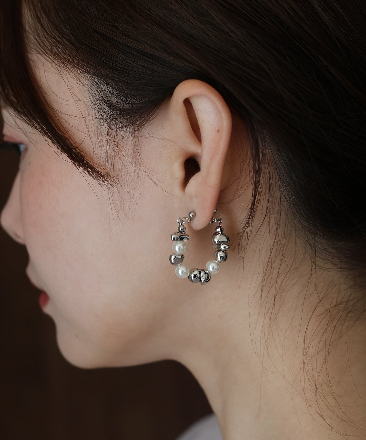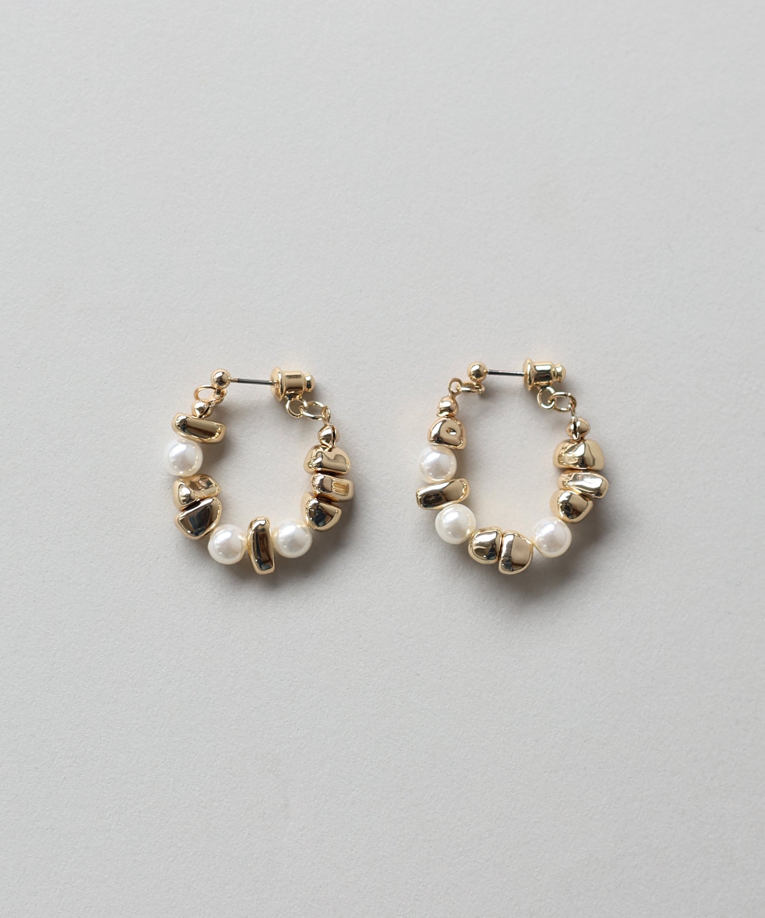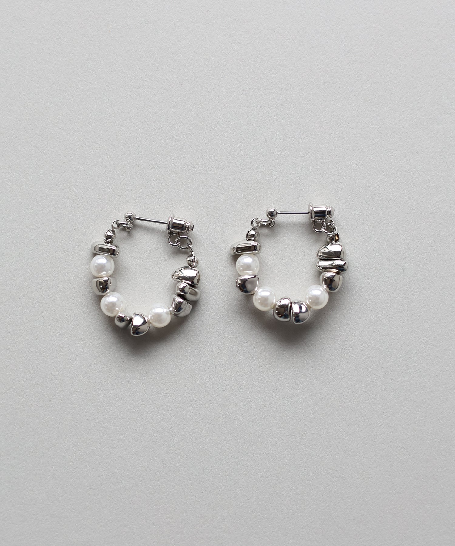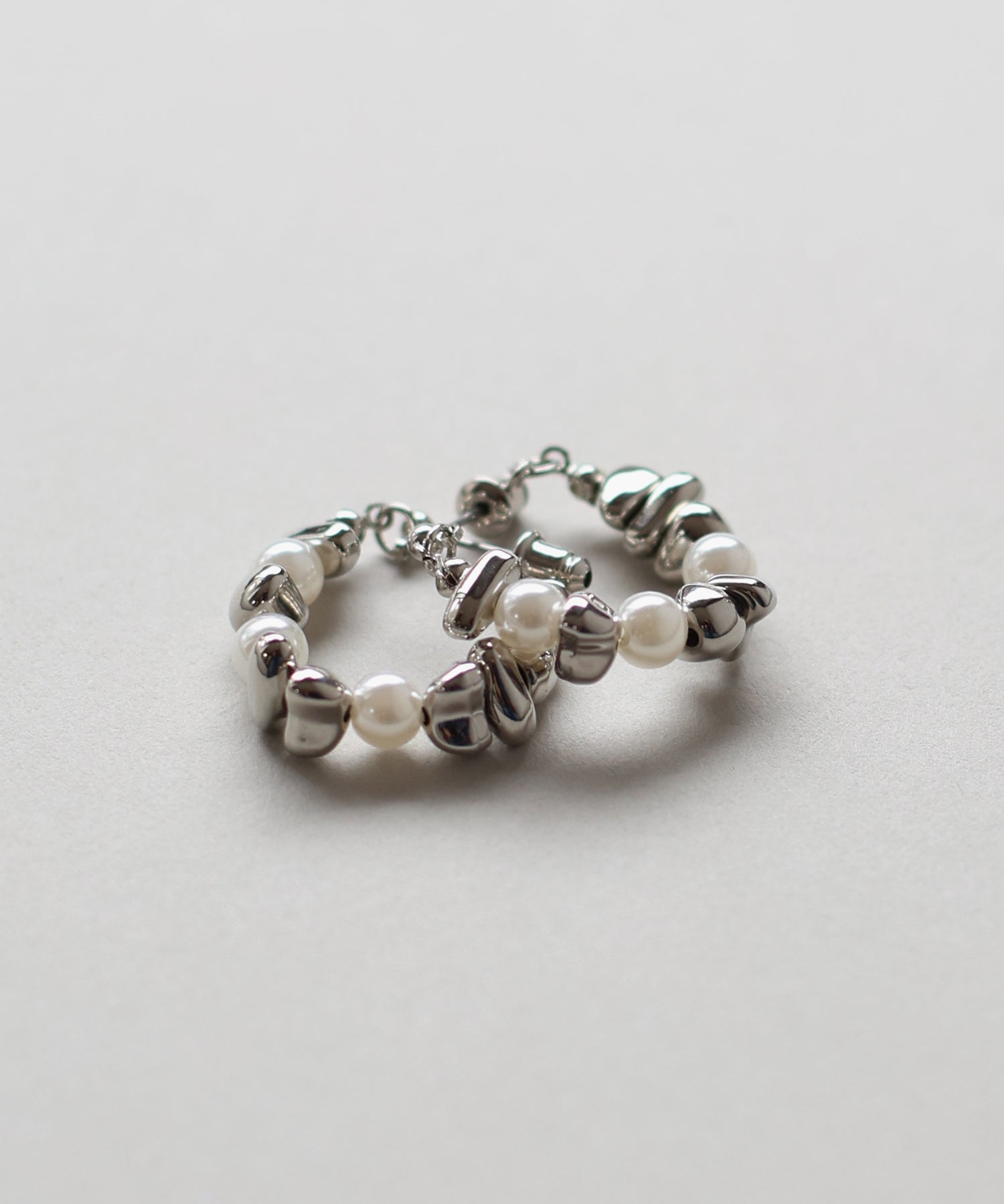 パールと歪なメタルモチーフがフープ状に連なったピアス。
