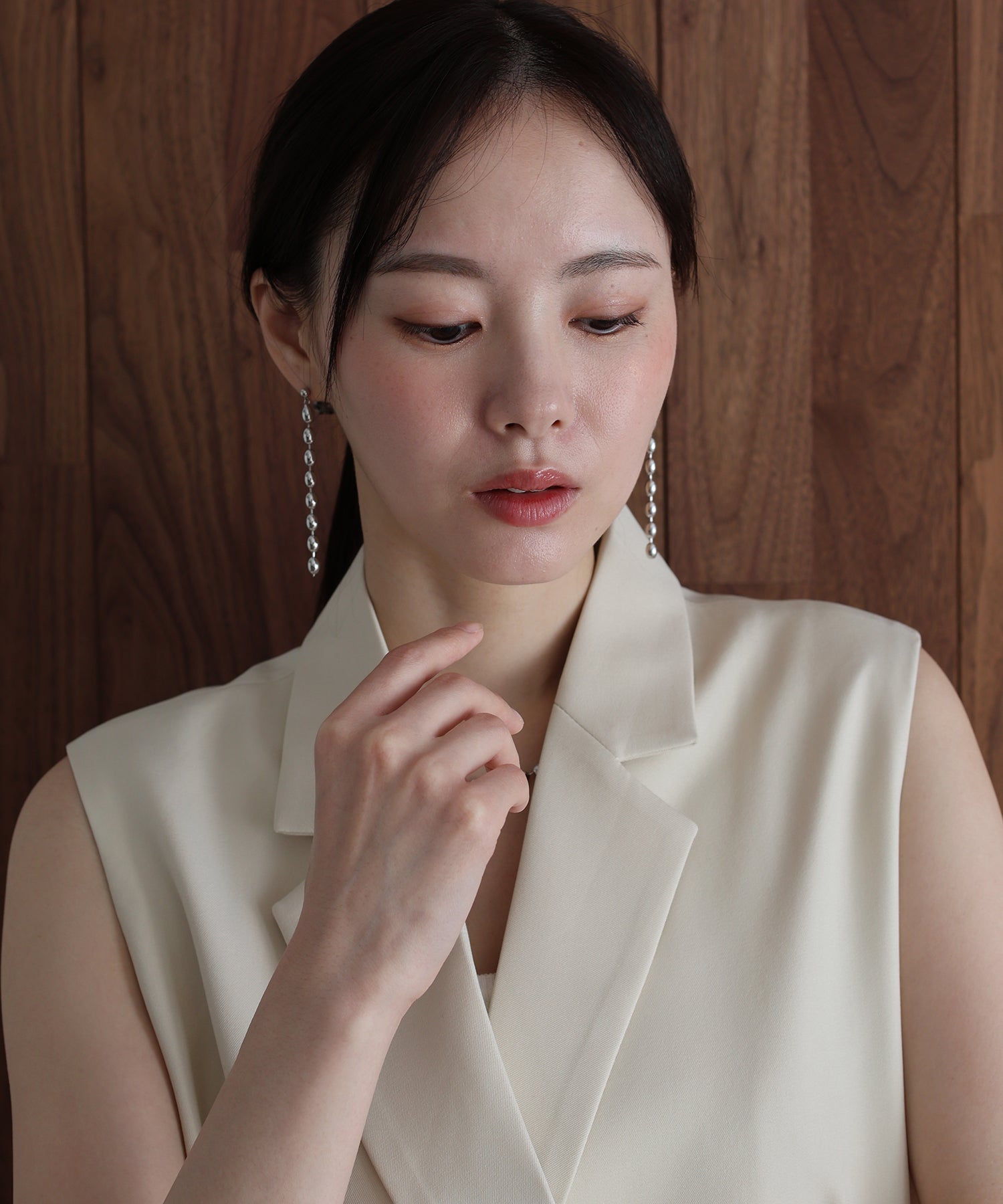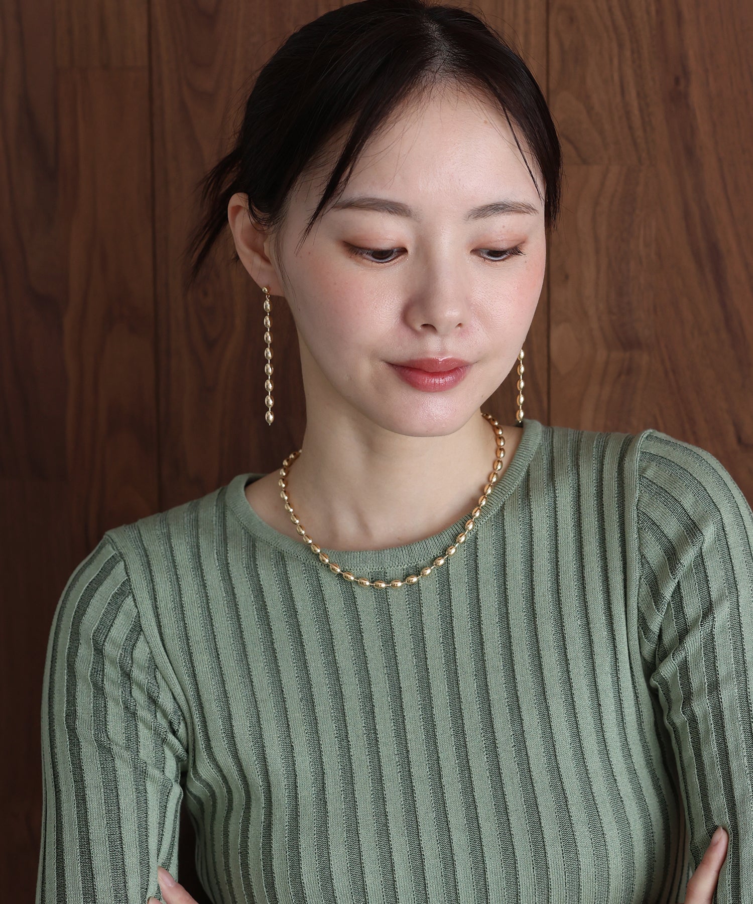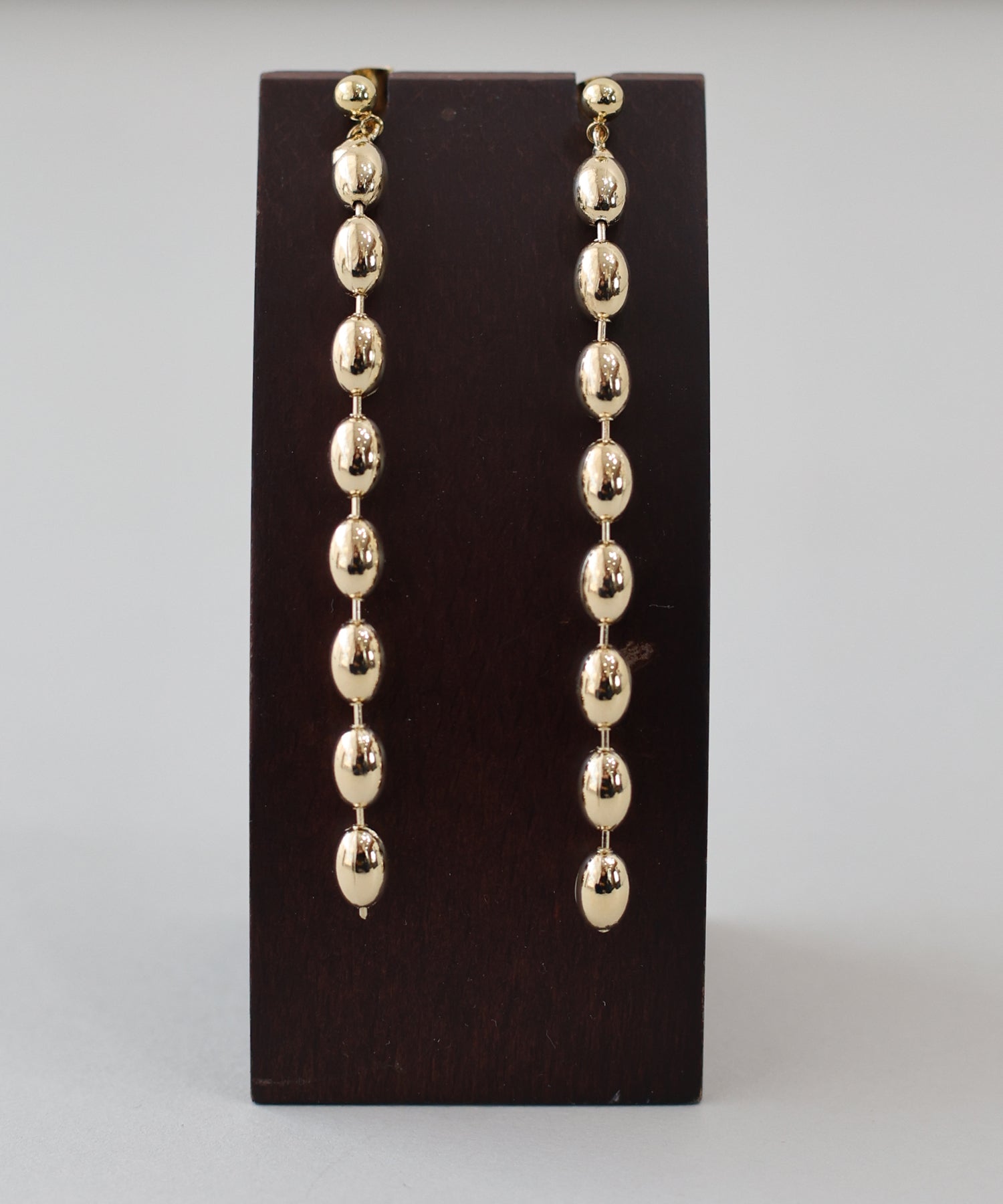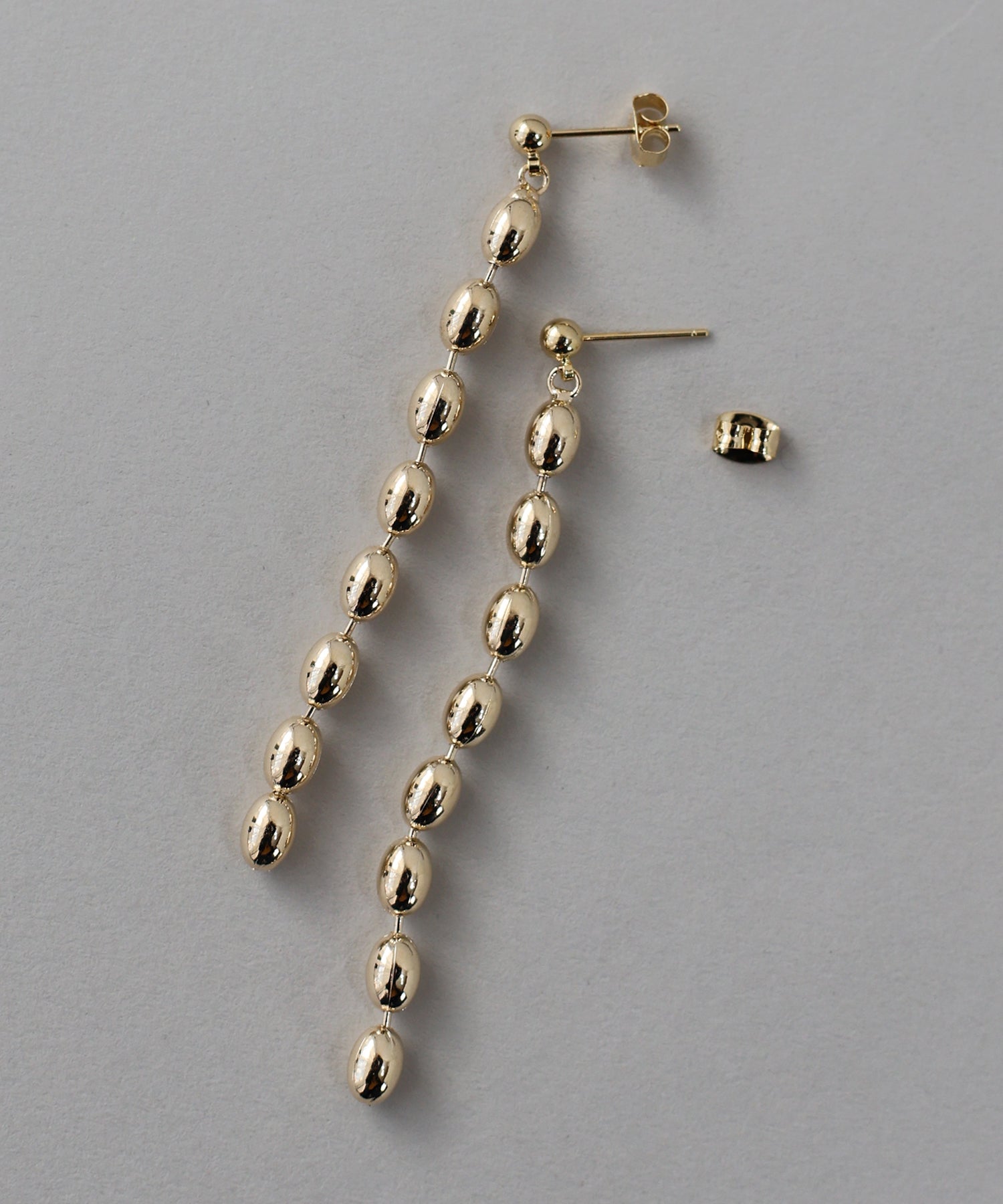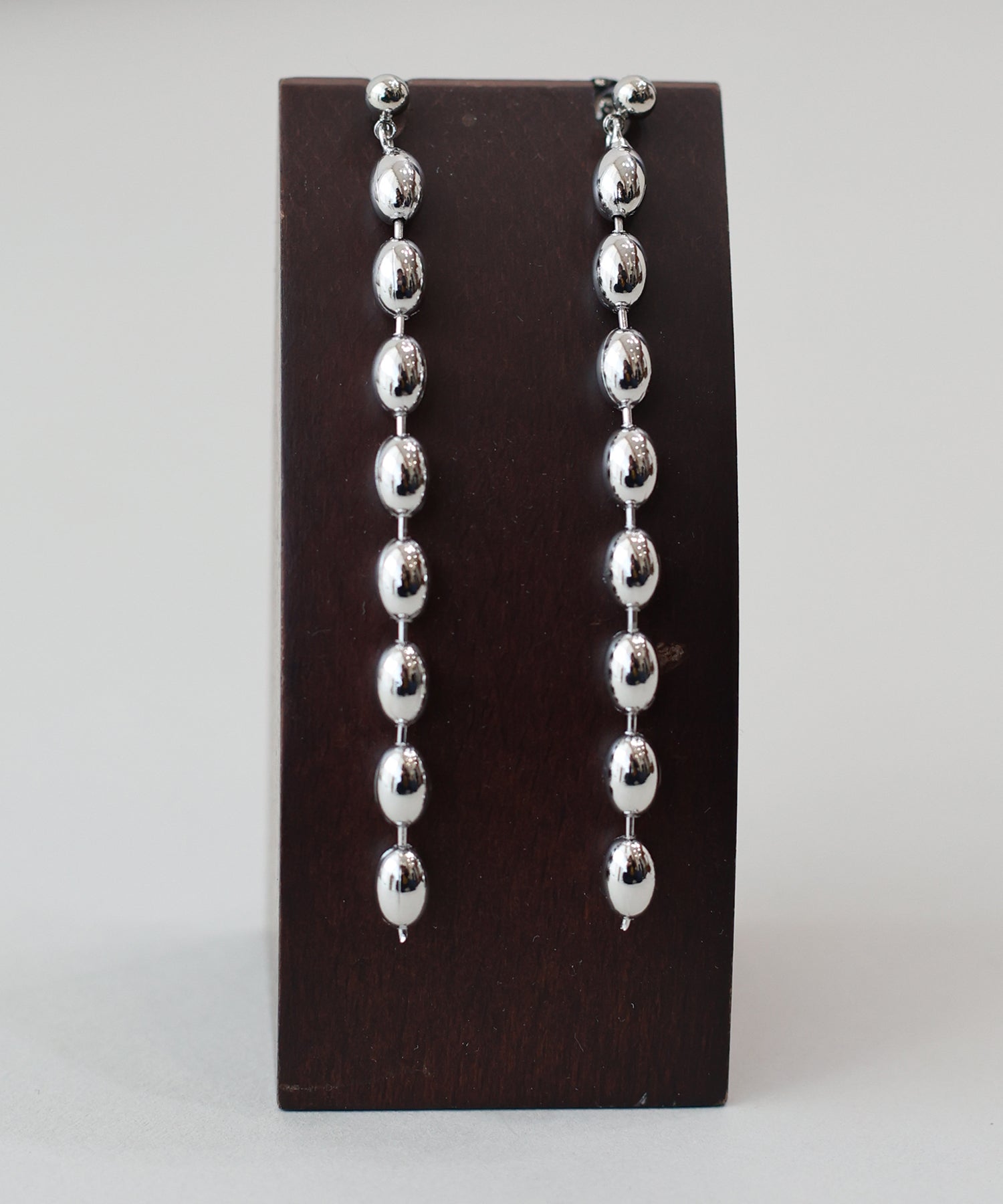 絶妙なフォルムのオーバル型パーツを連ねた、都会的なルックスのボールチェーンピアス。