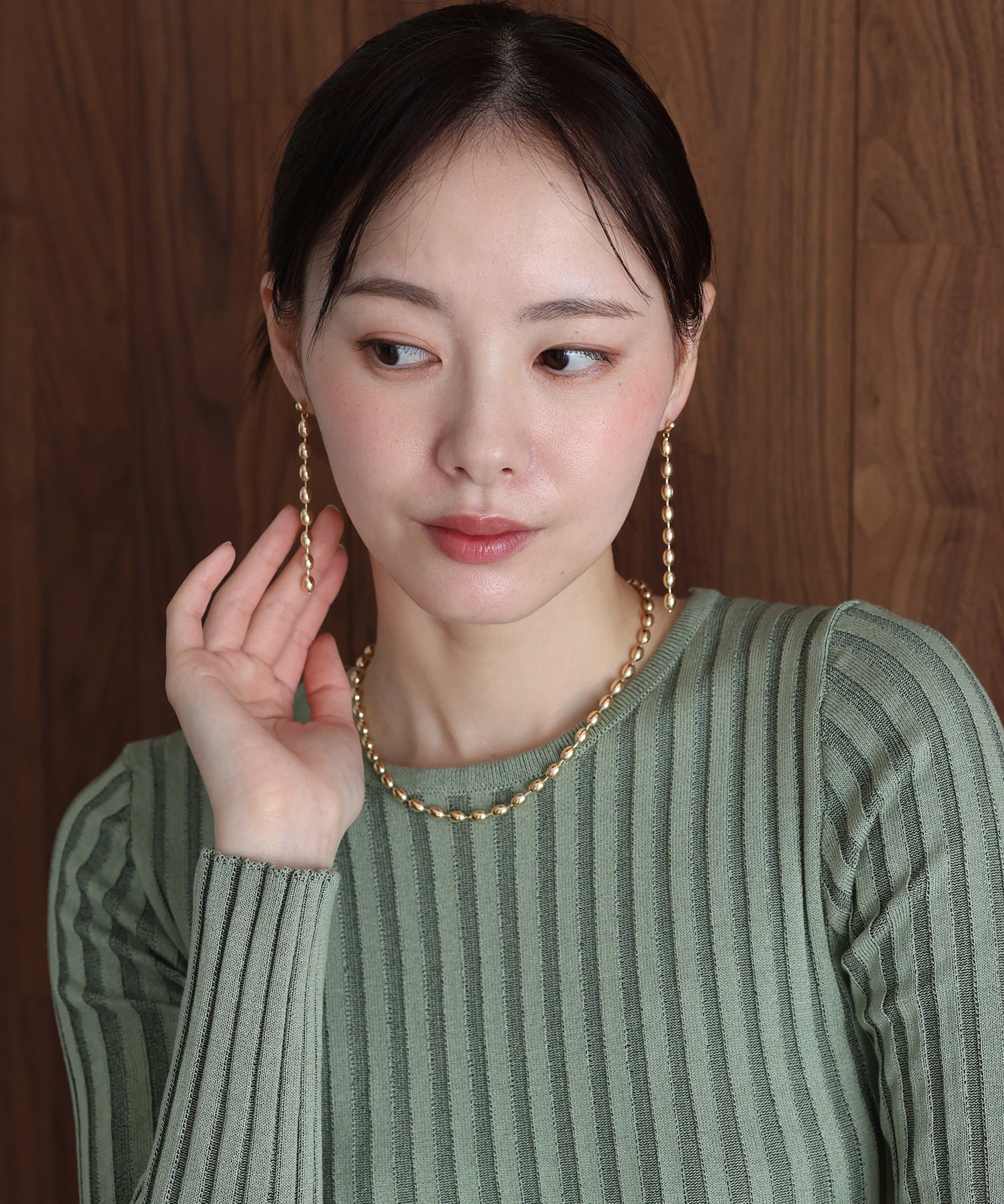 洗練された光沢を纏う。モダンな表情のオーバルボールチェーンピアス