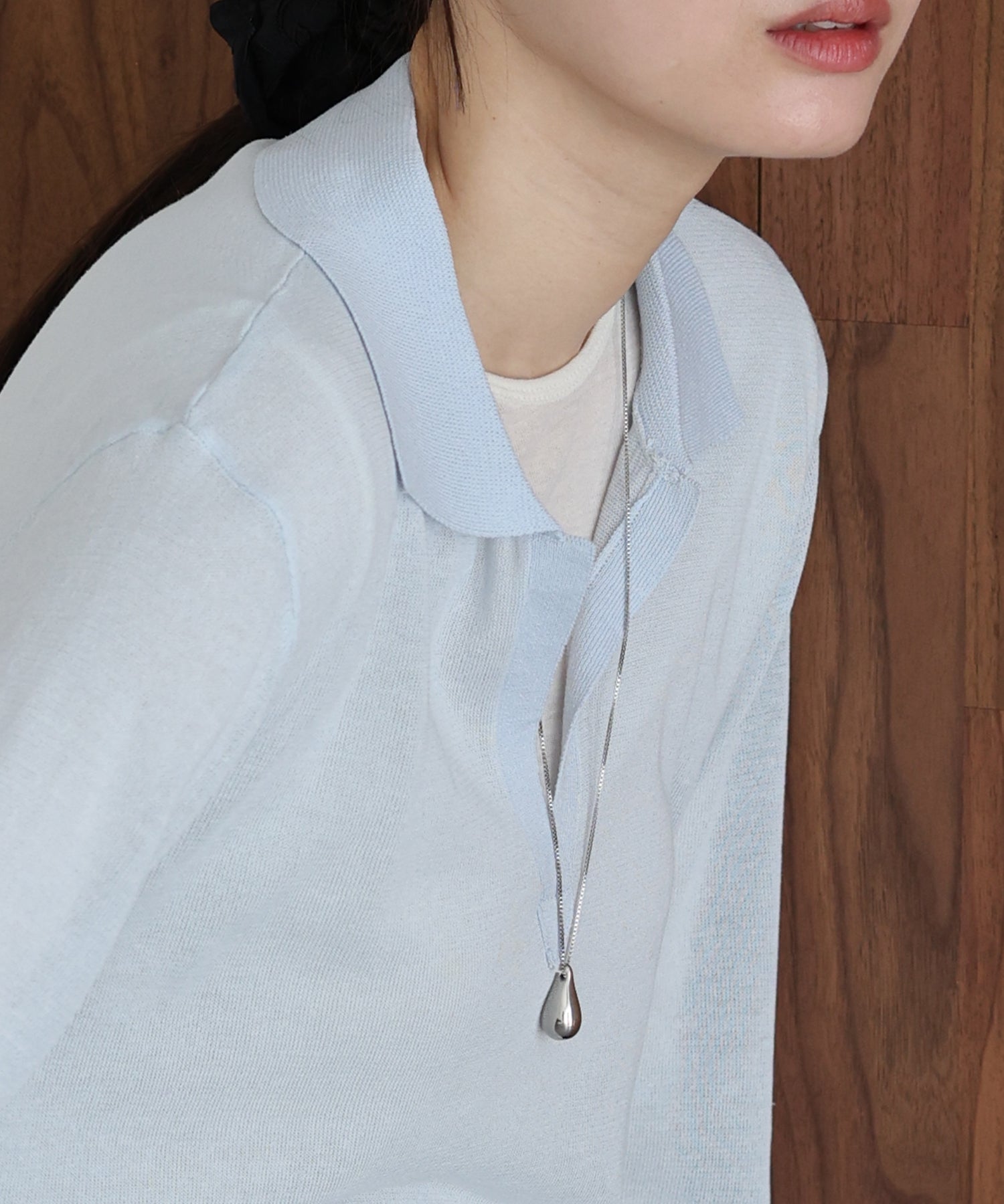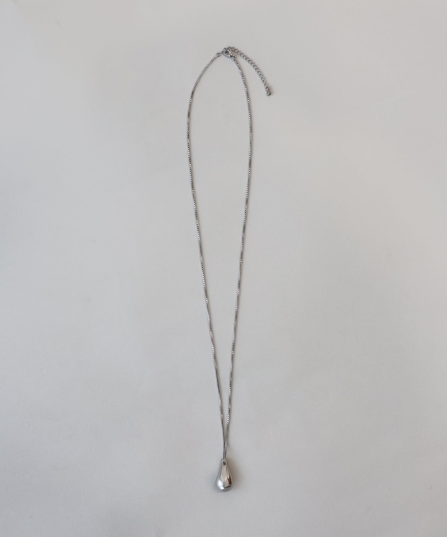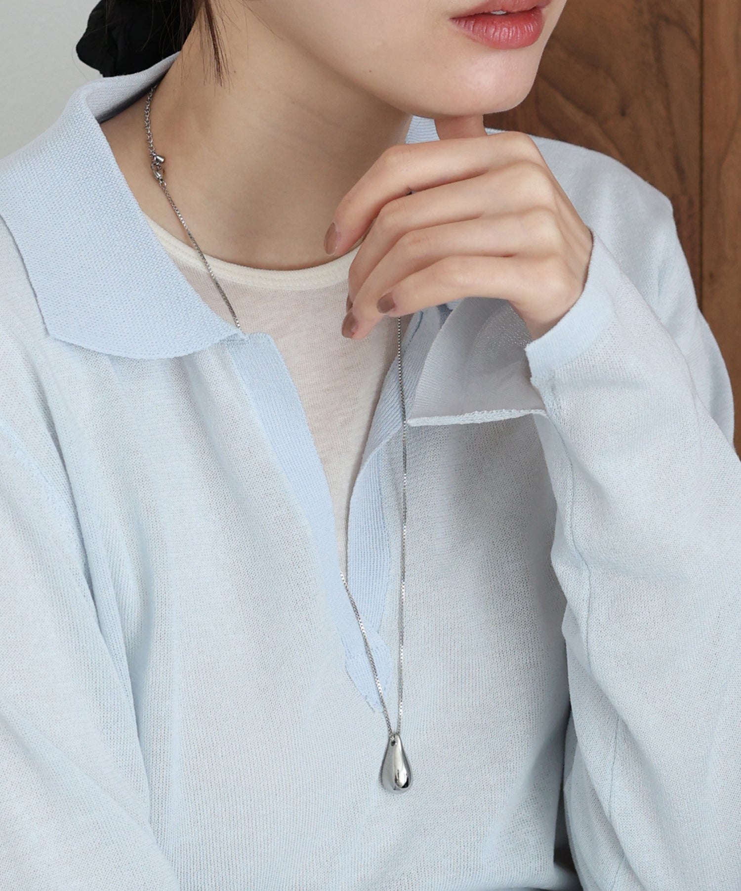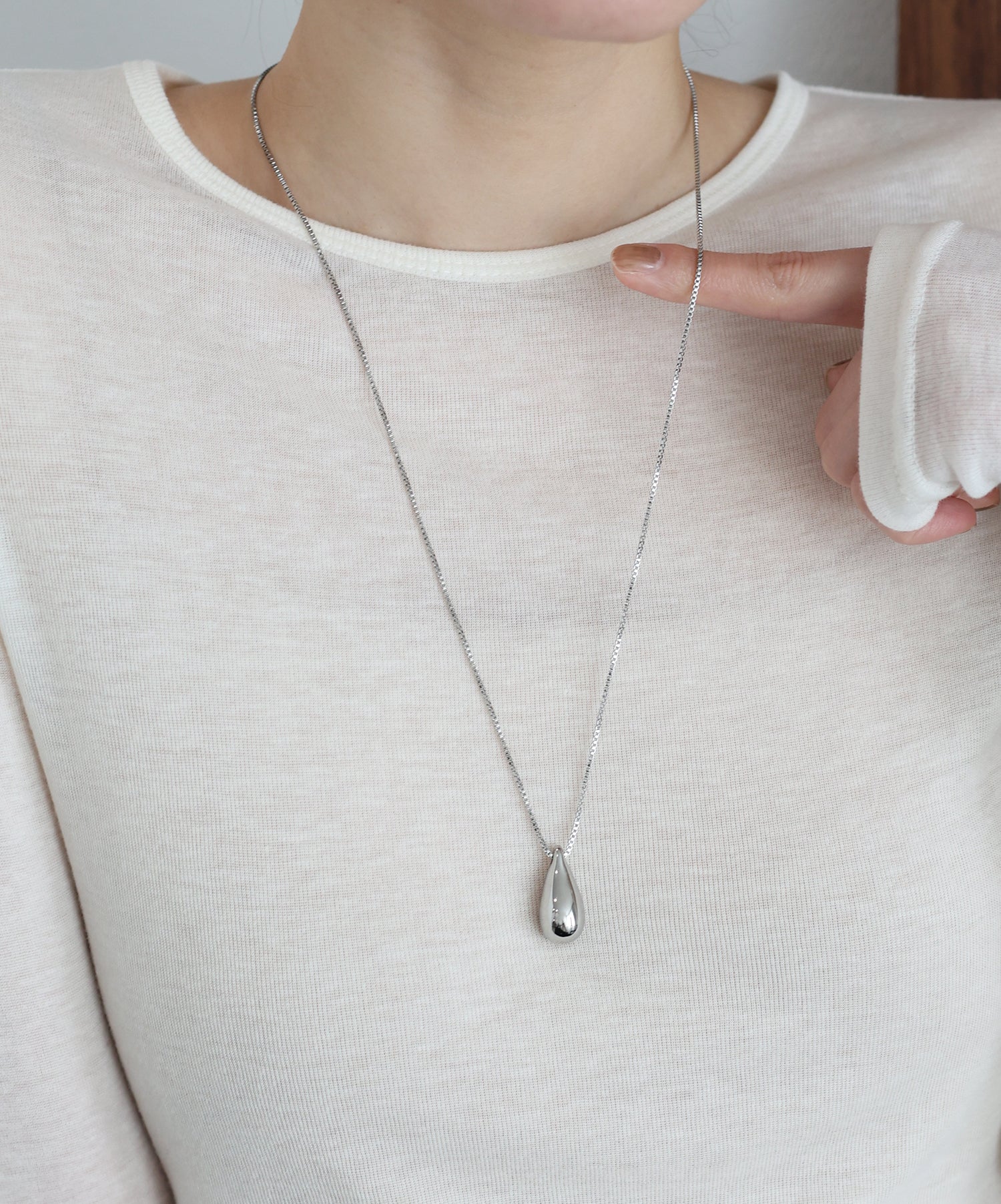 ぷっくりとした雫モチーフのペンダントトップが光を反射してキラキラと輝き、スタイリングのアクセントに。