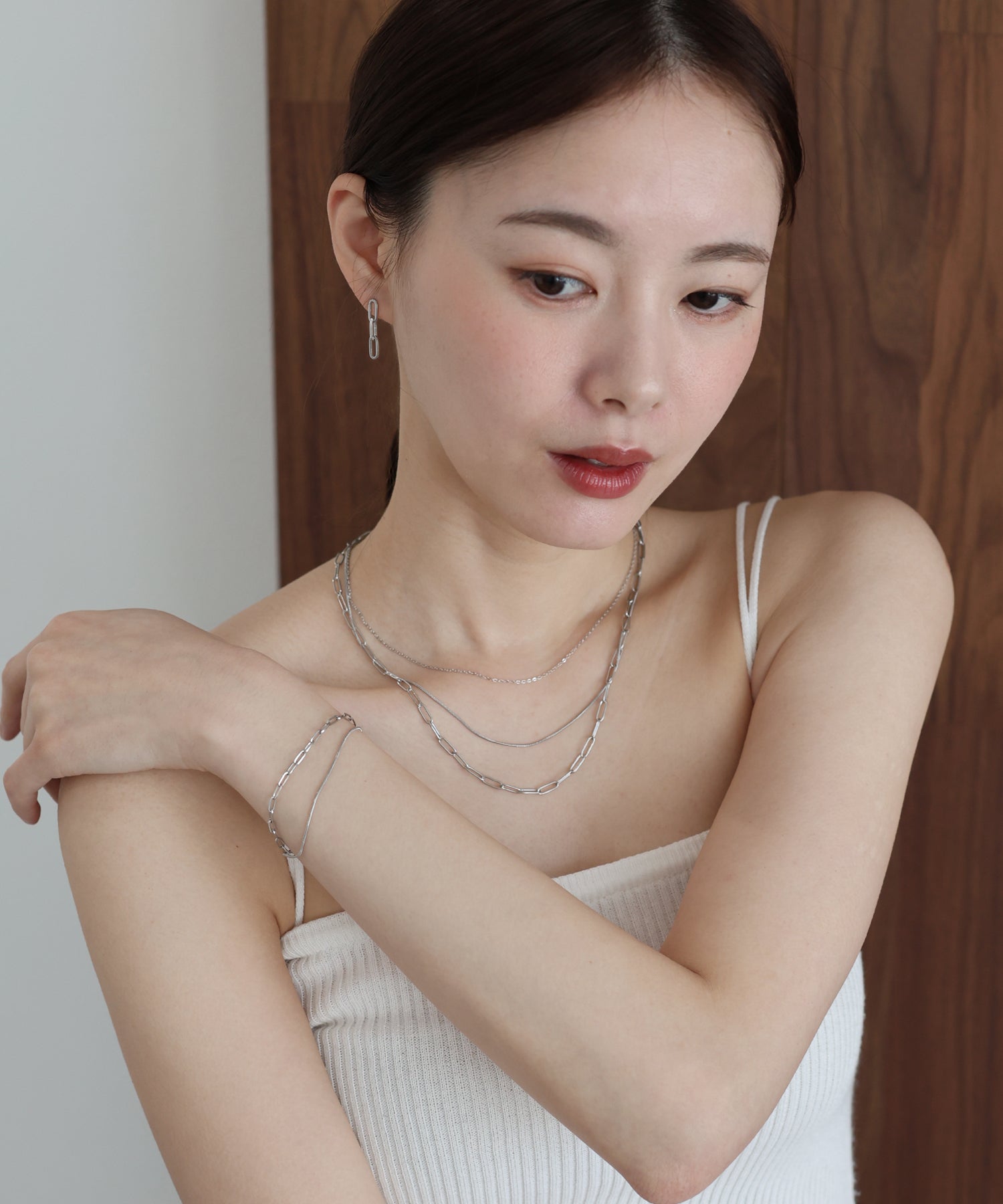 オーバル型の駒が連なったチェーンデザインが光を反射し、動くたびにキラキラと上品な煌めきを放ちます。
