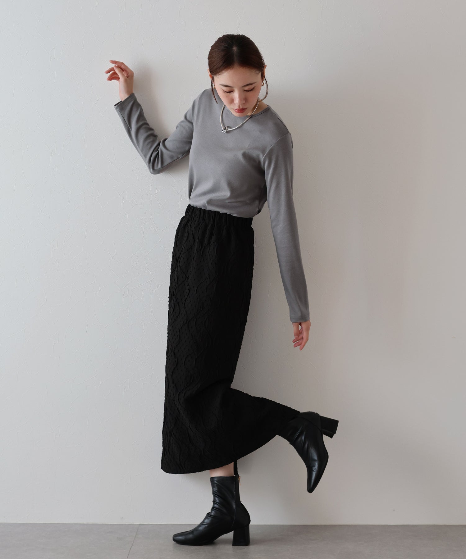 フレアスカートやワイドパンツ、スラックスなどボリュームのあるボトムと合わせると美しいバランスに仕上がります。