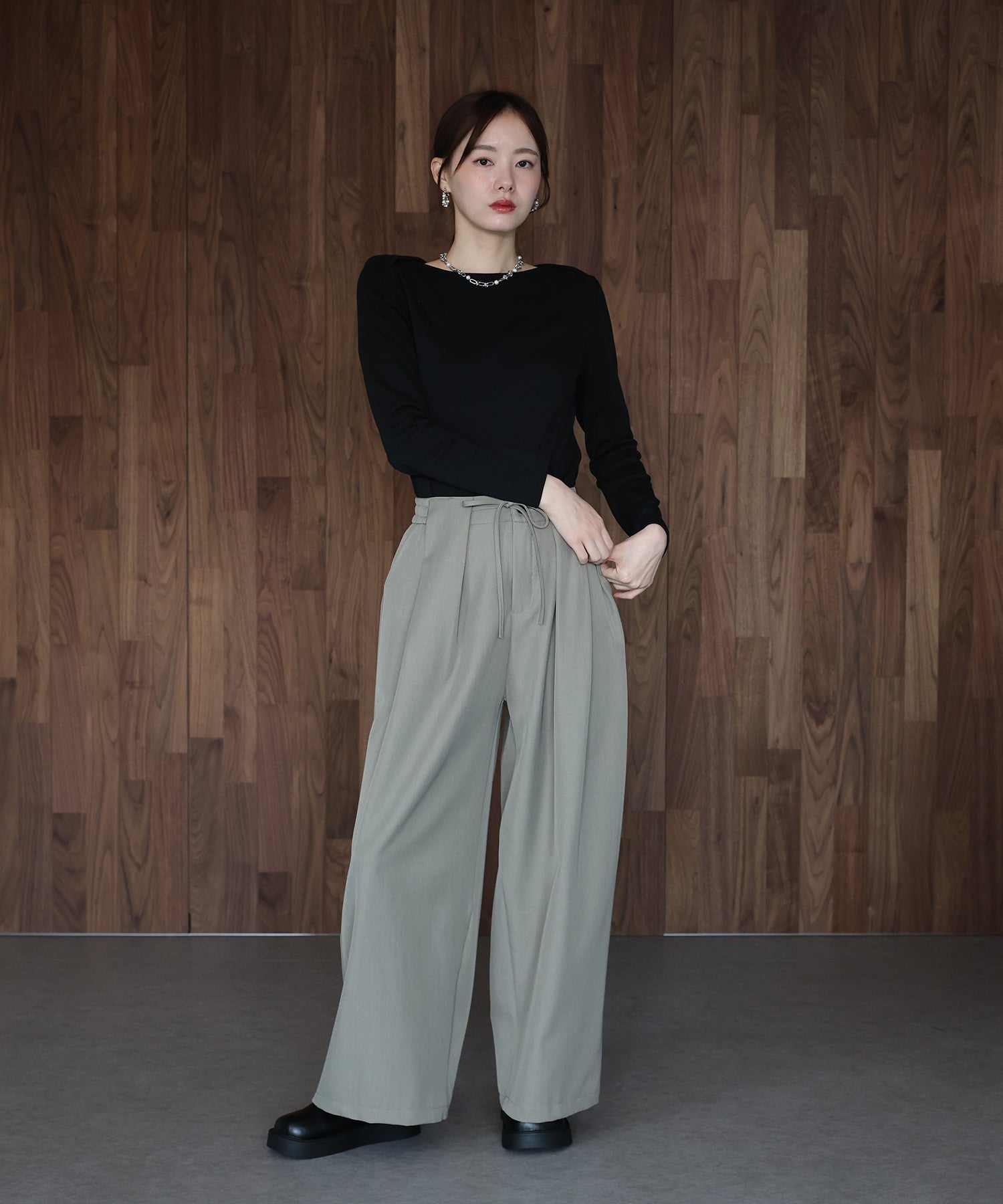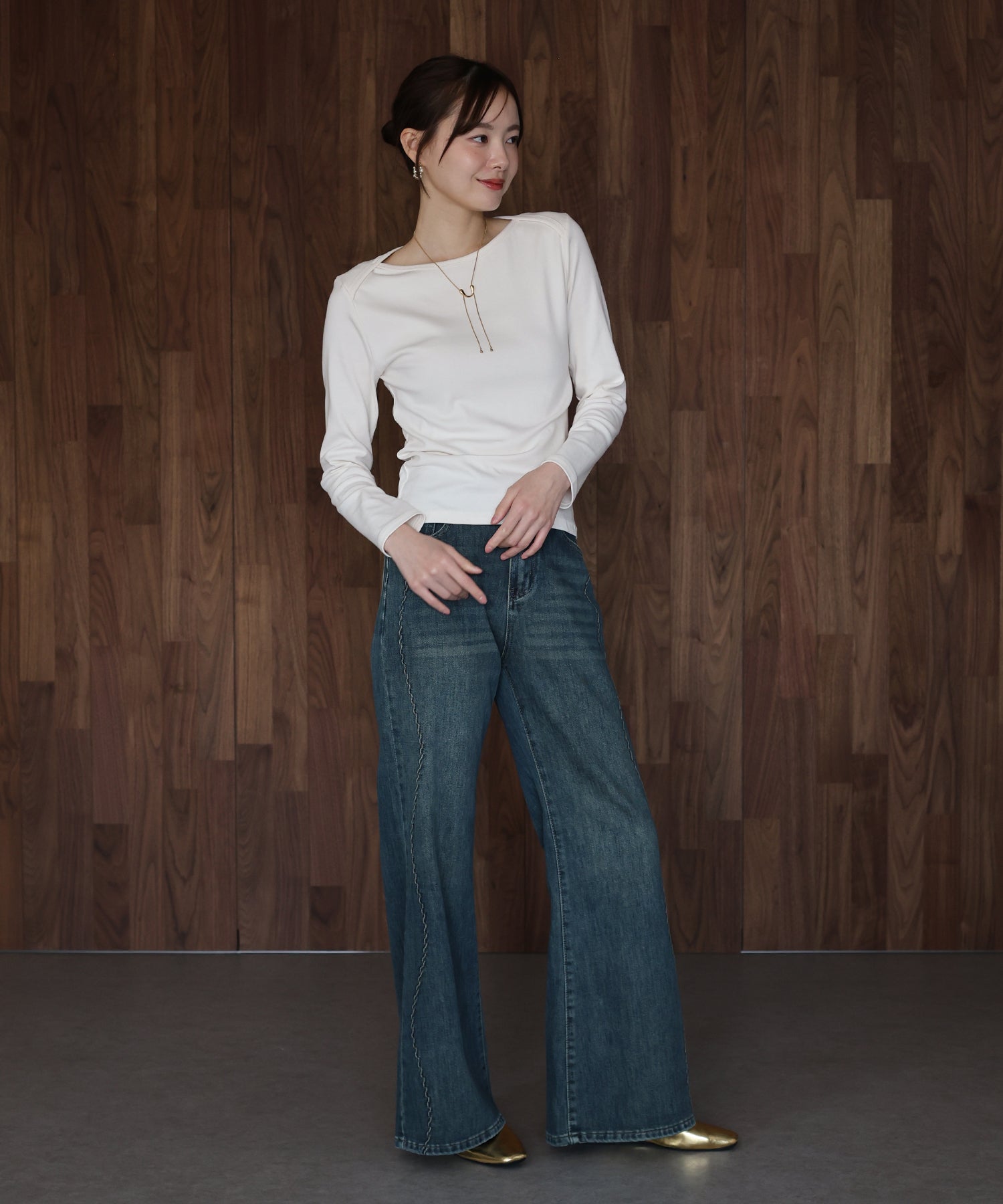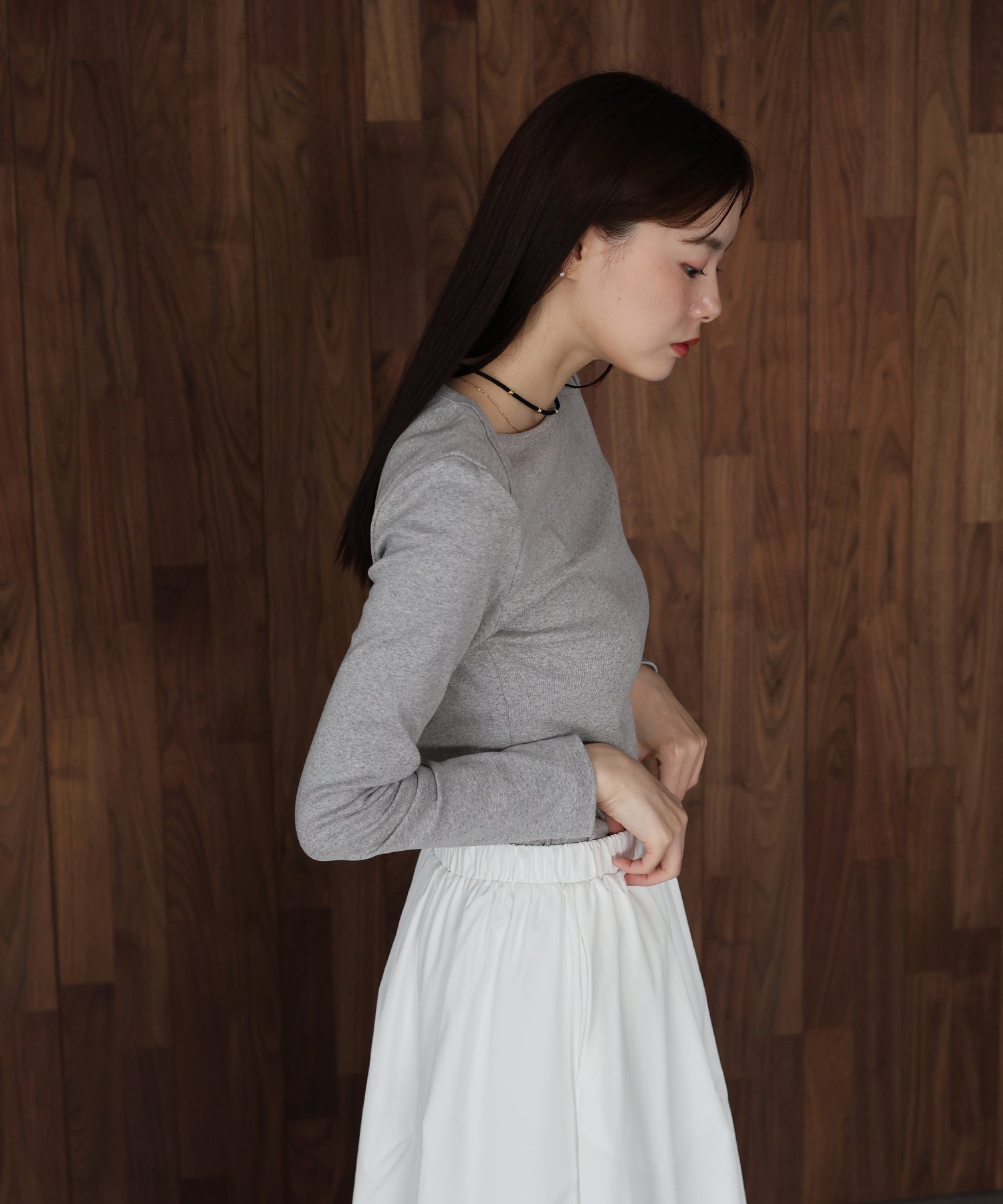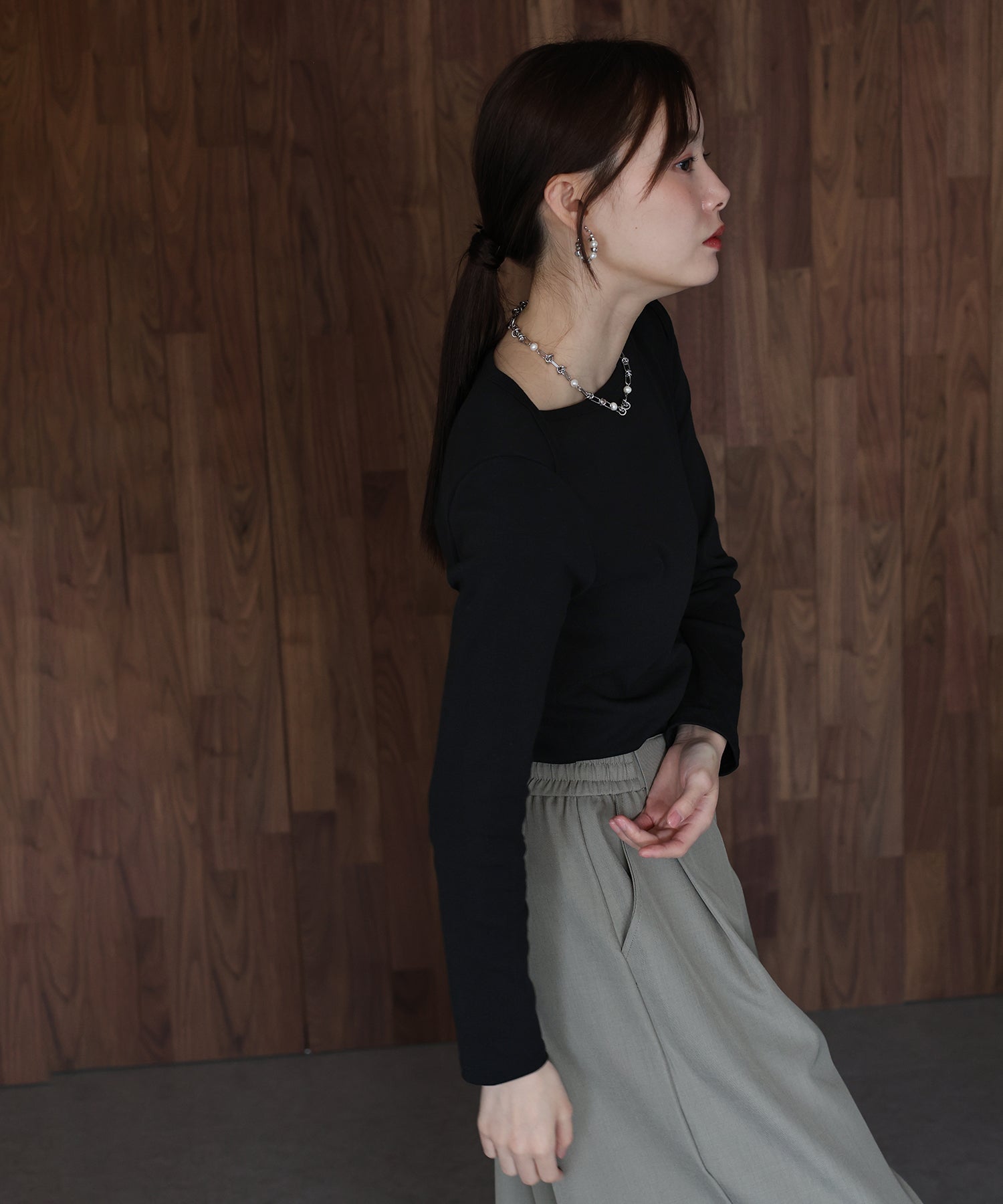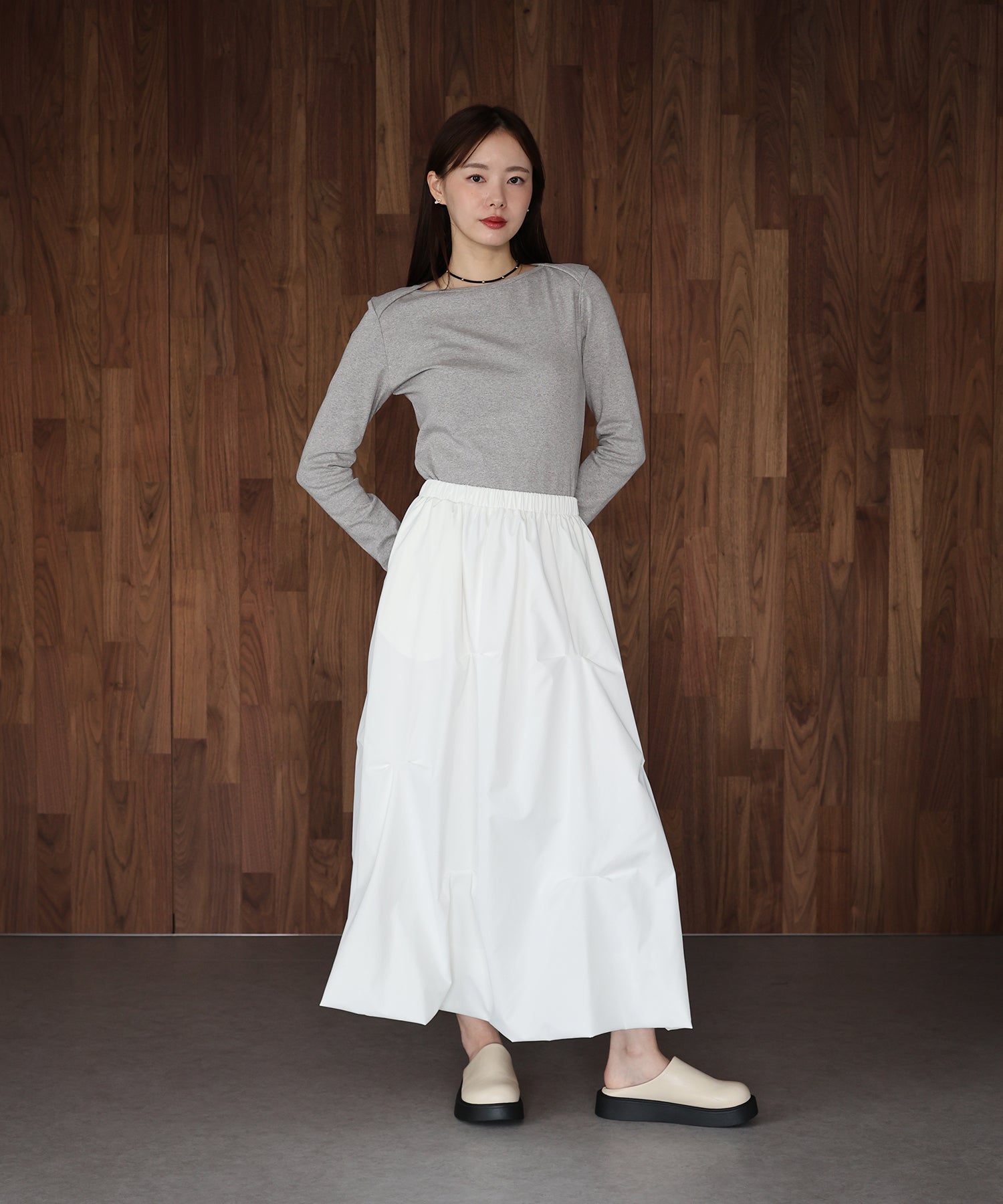 フレアスカートやワイドパンツ、スラックスなどボリュームのあるボトムと合わせると美しいバランスに仕上がります。