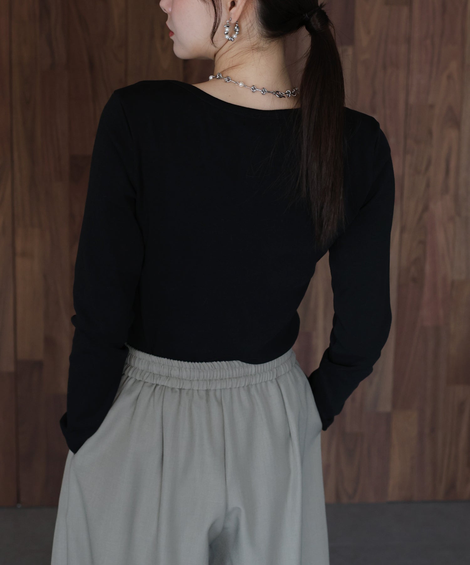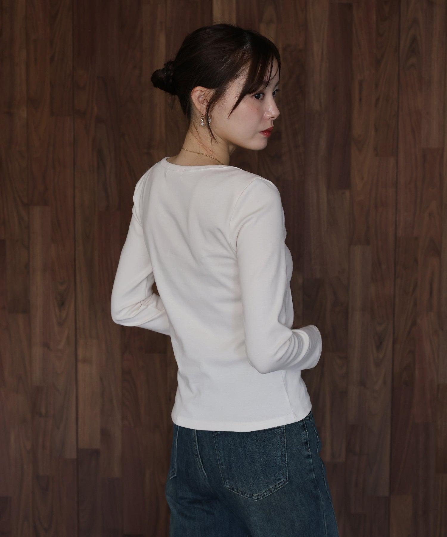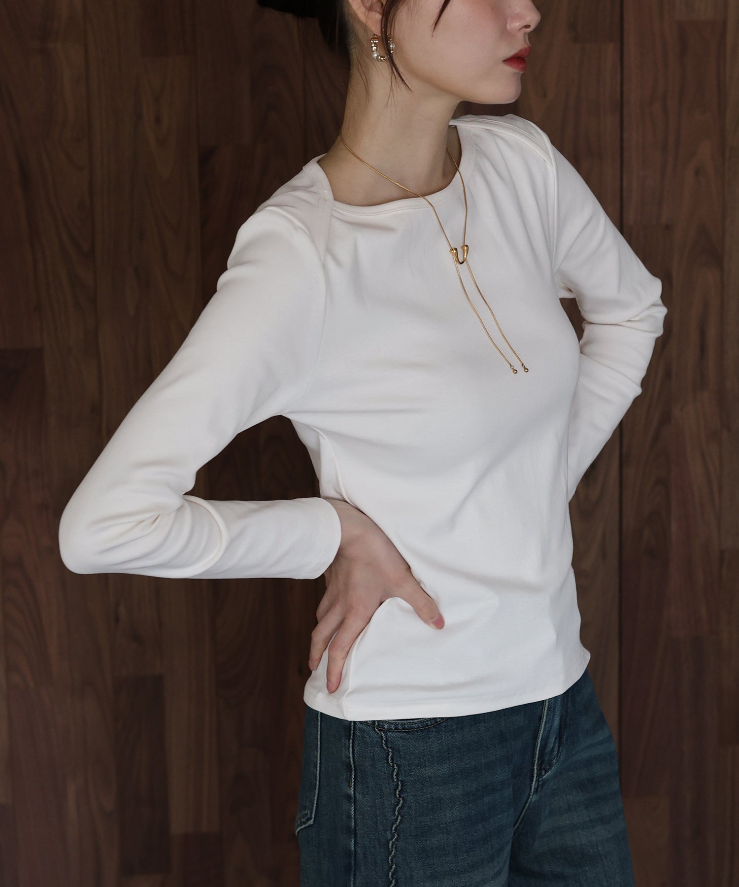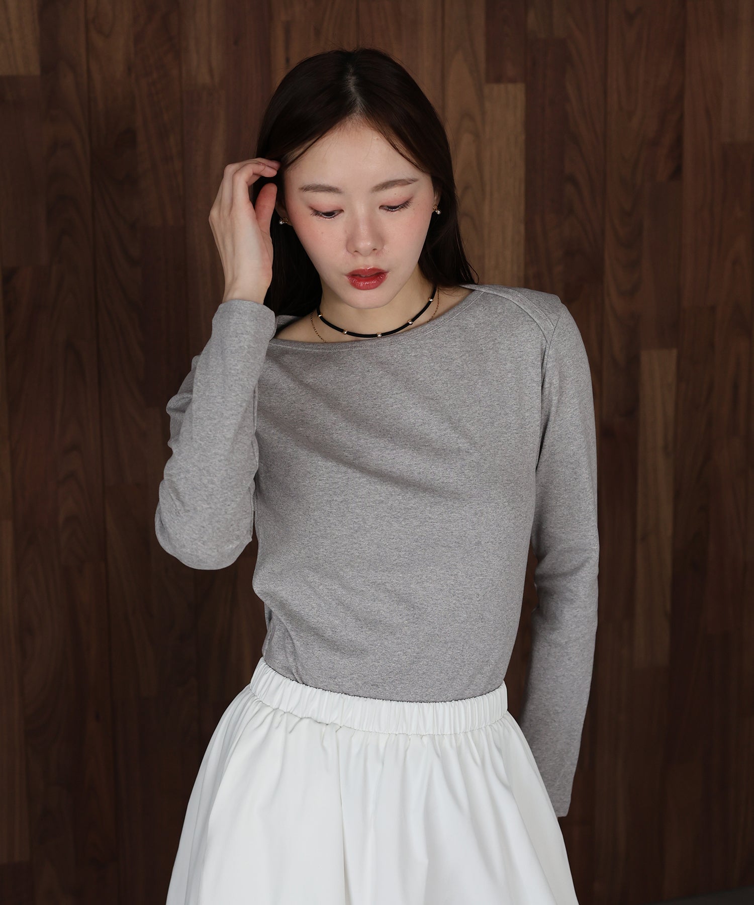 程よく開いたネックラインが上品で、顔周りをすっきりと見せてくれます。