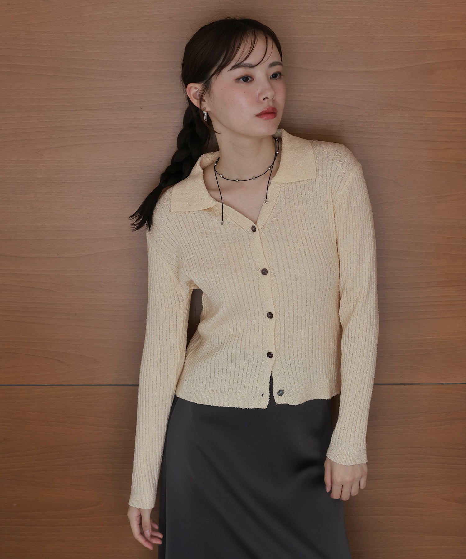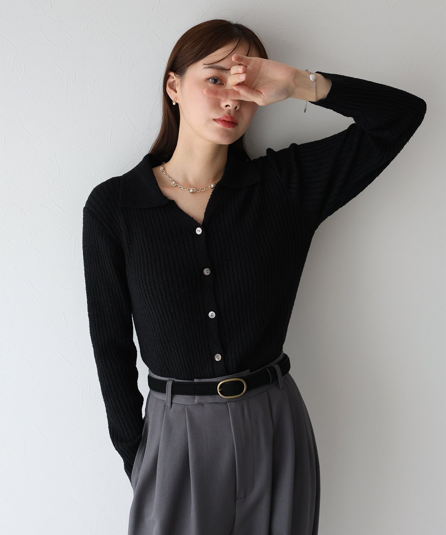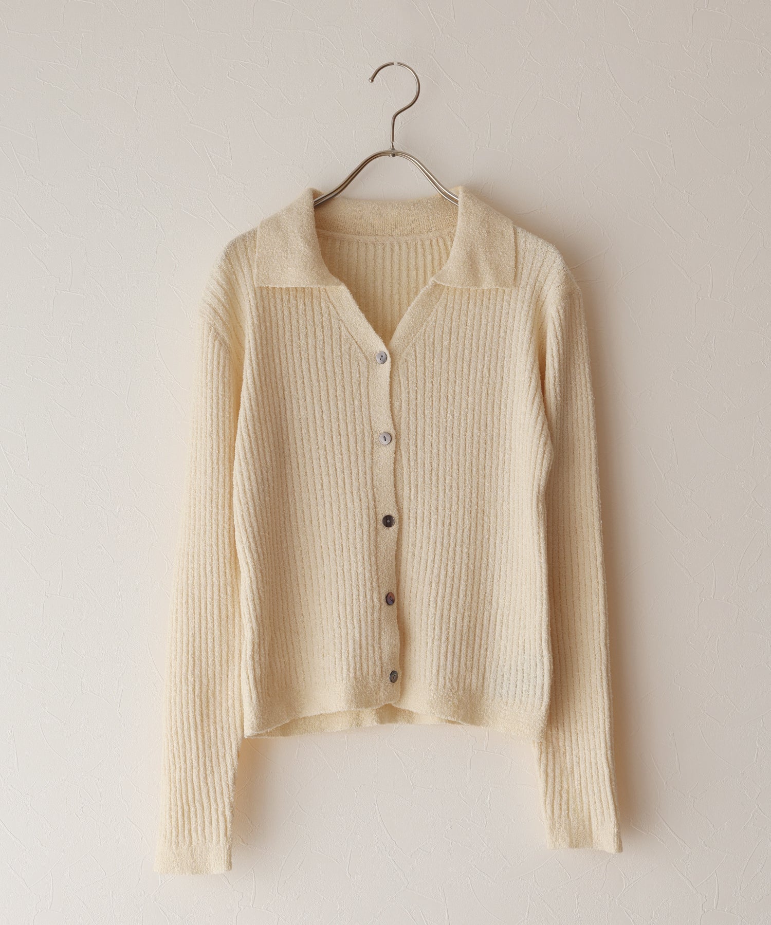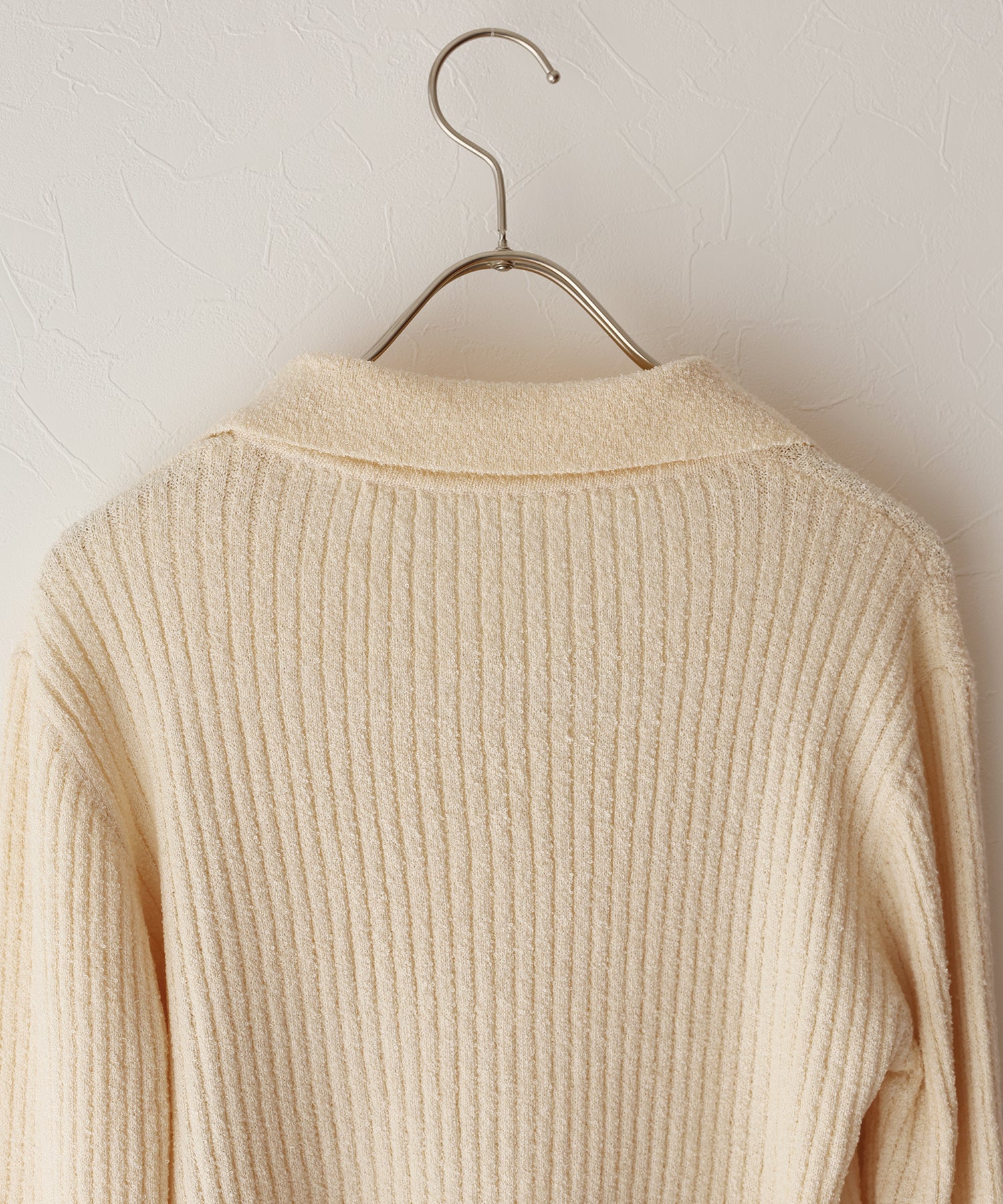 すっきりとしたスキッパー襟が魅力のシンプルニット。