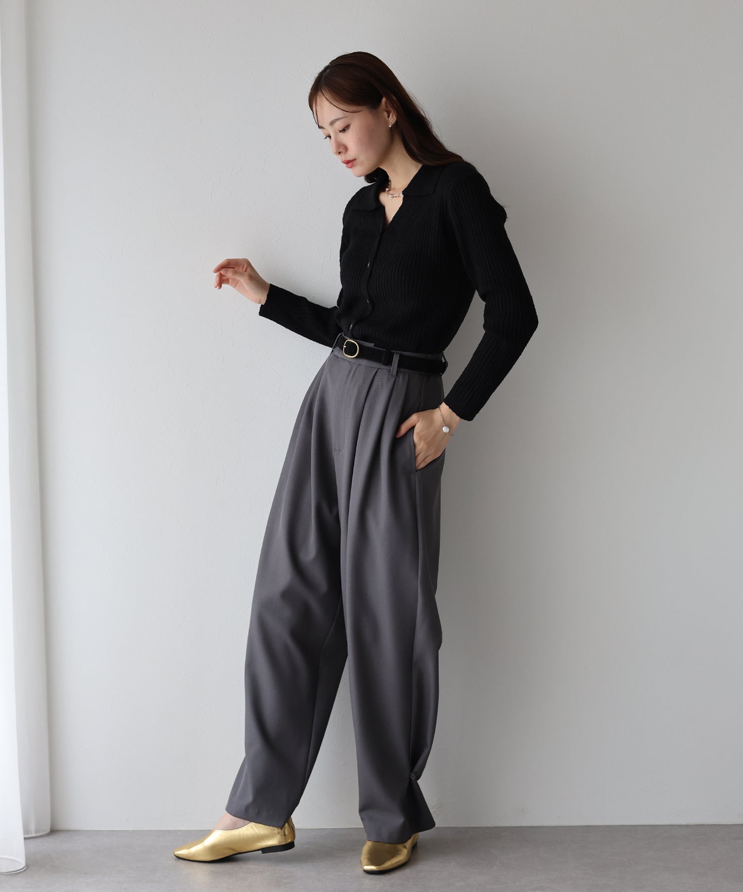 きちんと感のあるスラックスやタイトスカートと合わせれば、大人の上品スタイルに。