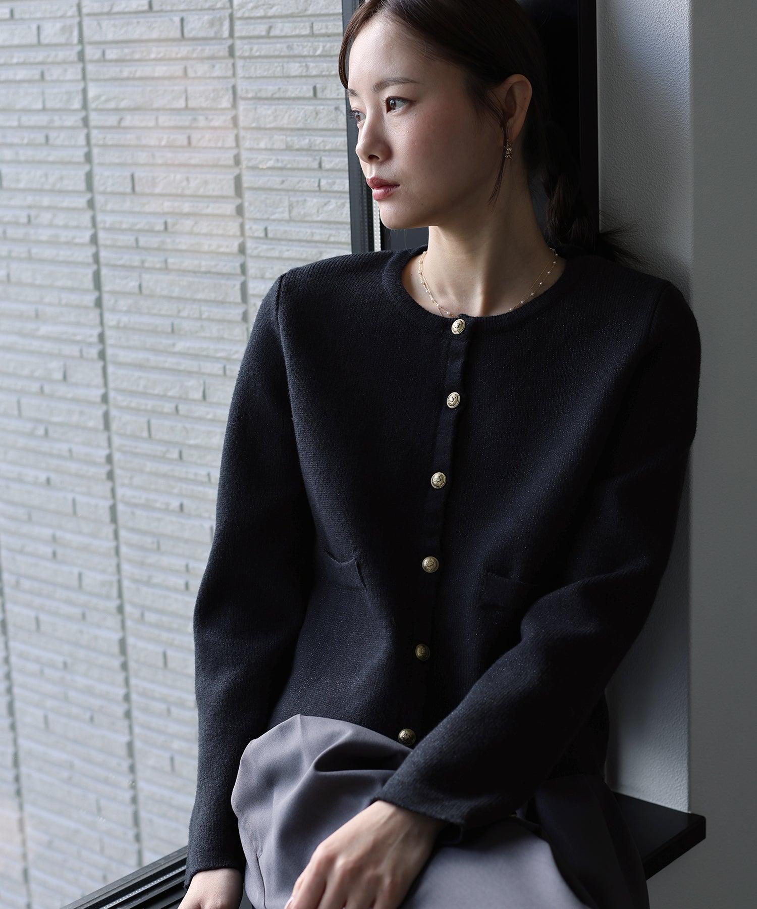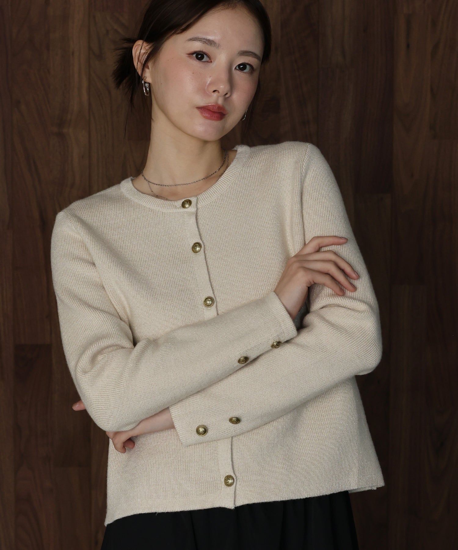 アンティーク調の金釦がアクセントになったニットカーディガン。