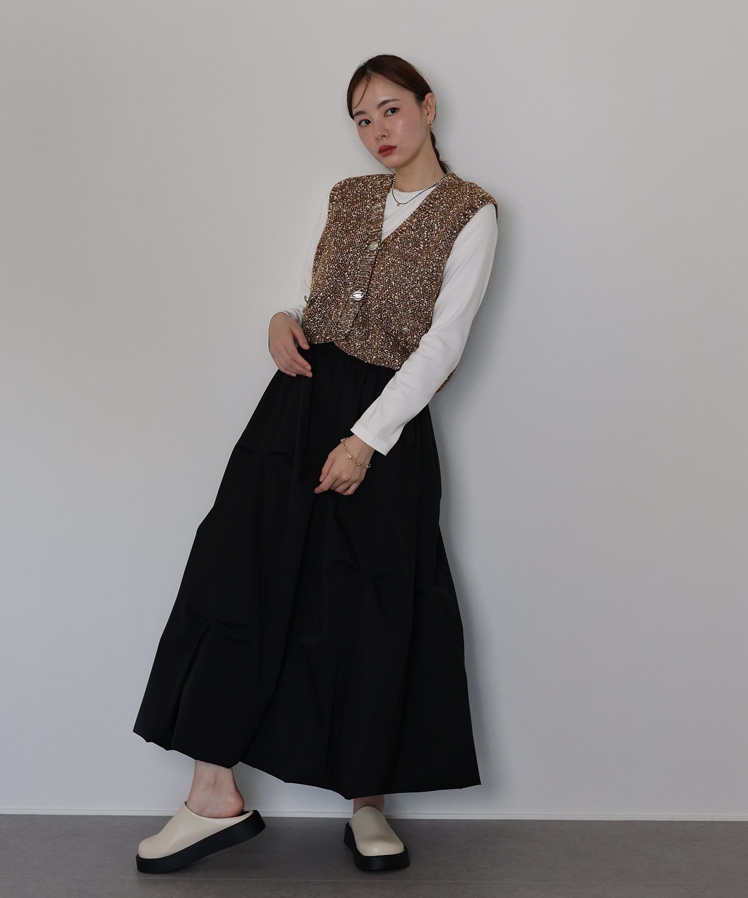 シャツやロンT、ワンピースなど様々なアイテムとのレイヤードが楽しめる万能アイテム。