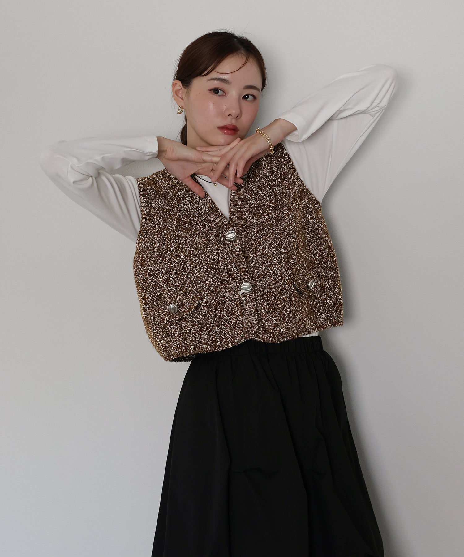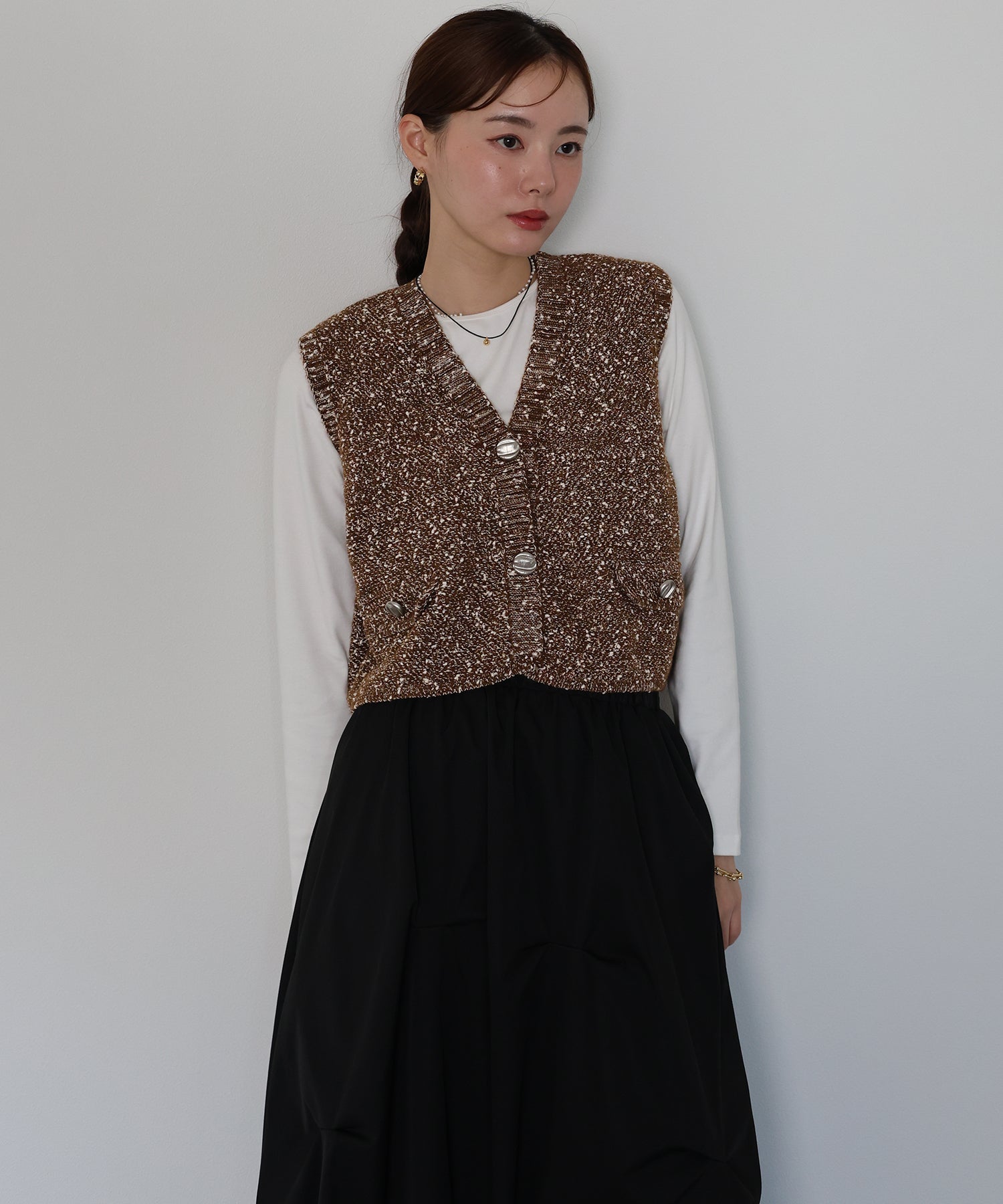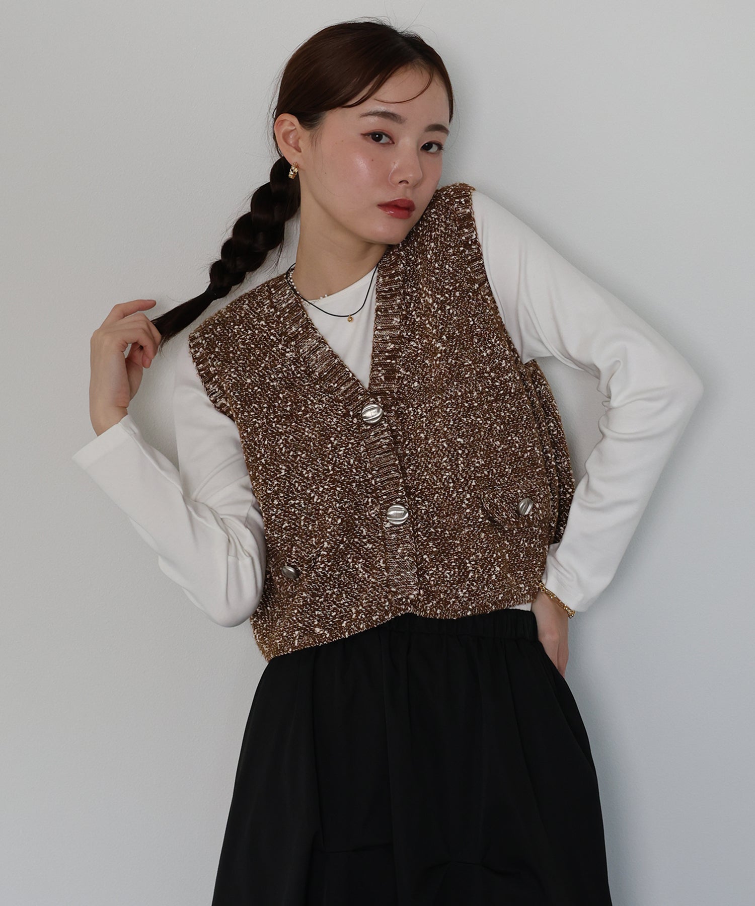 Vネックベストにニュアンスボタンをあしらったシンプルながらも印象的なデザインで、