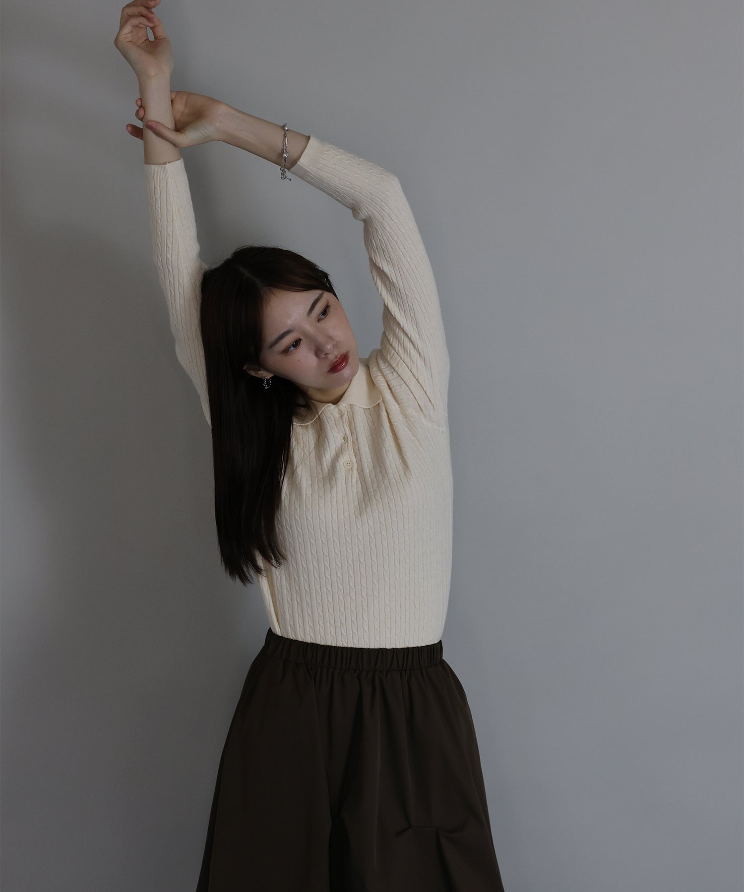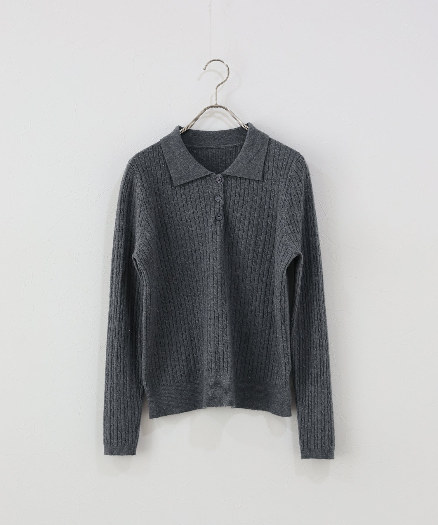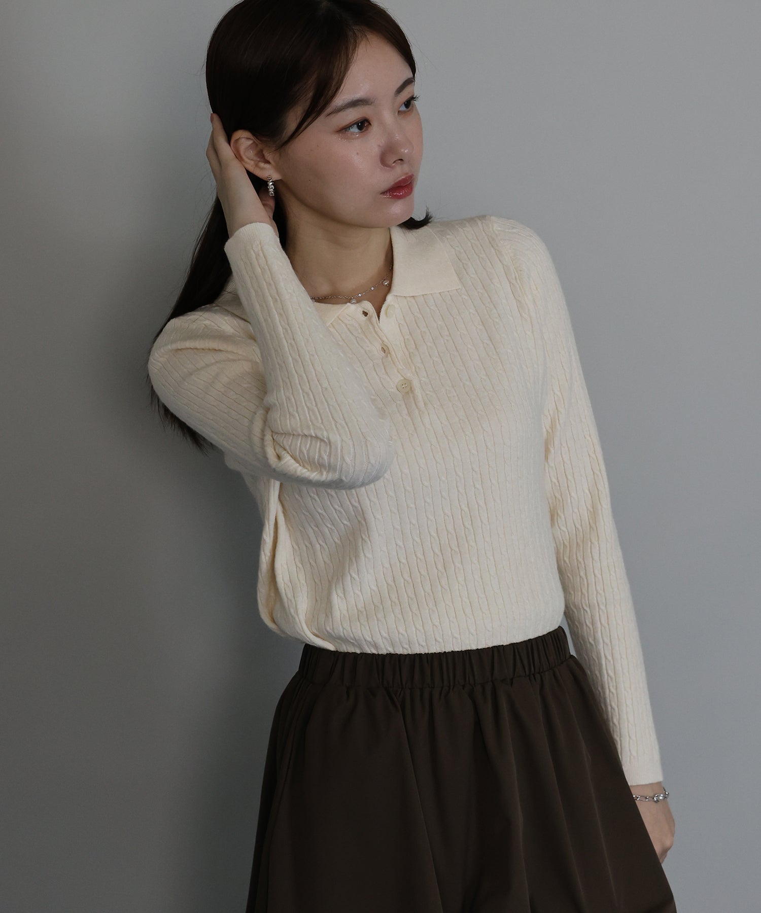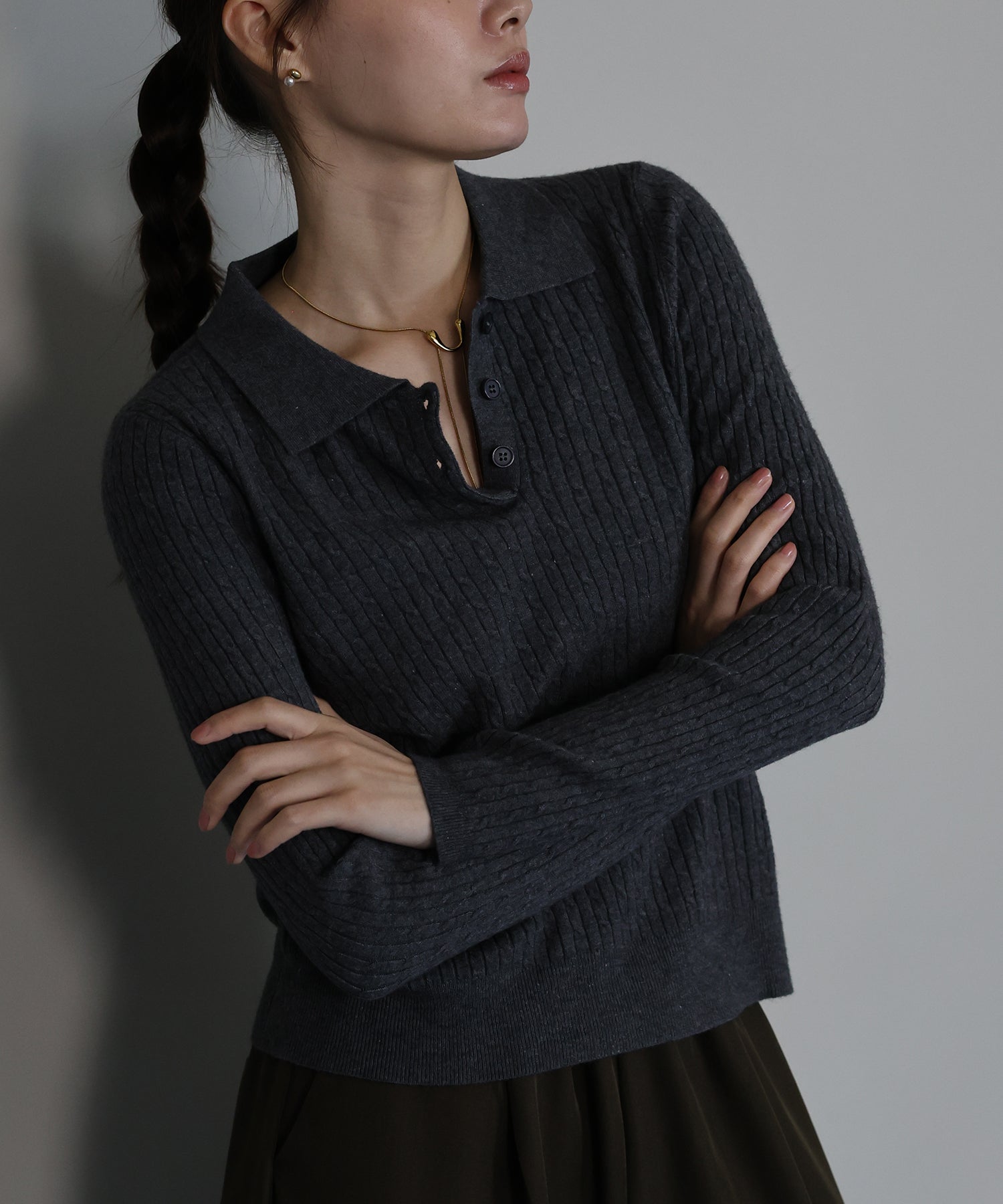 立体感のあるケーブル編みと、首元の3つのボタンがさりげないアクセントになったポロ襟ニット。