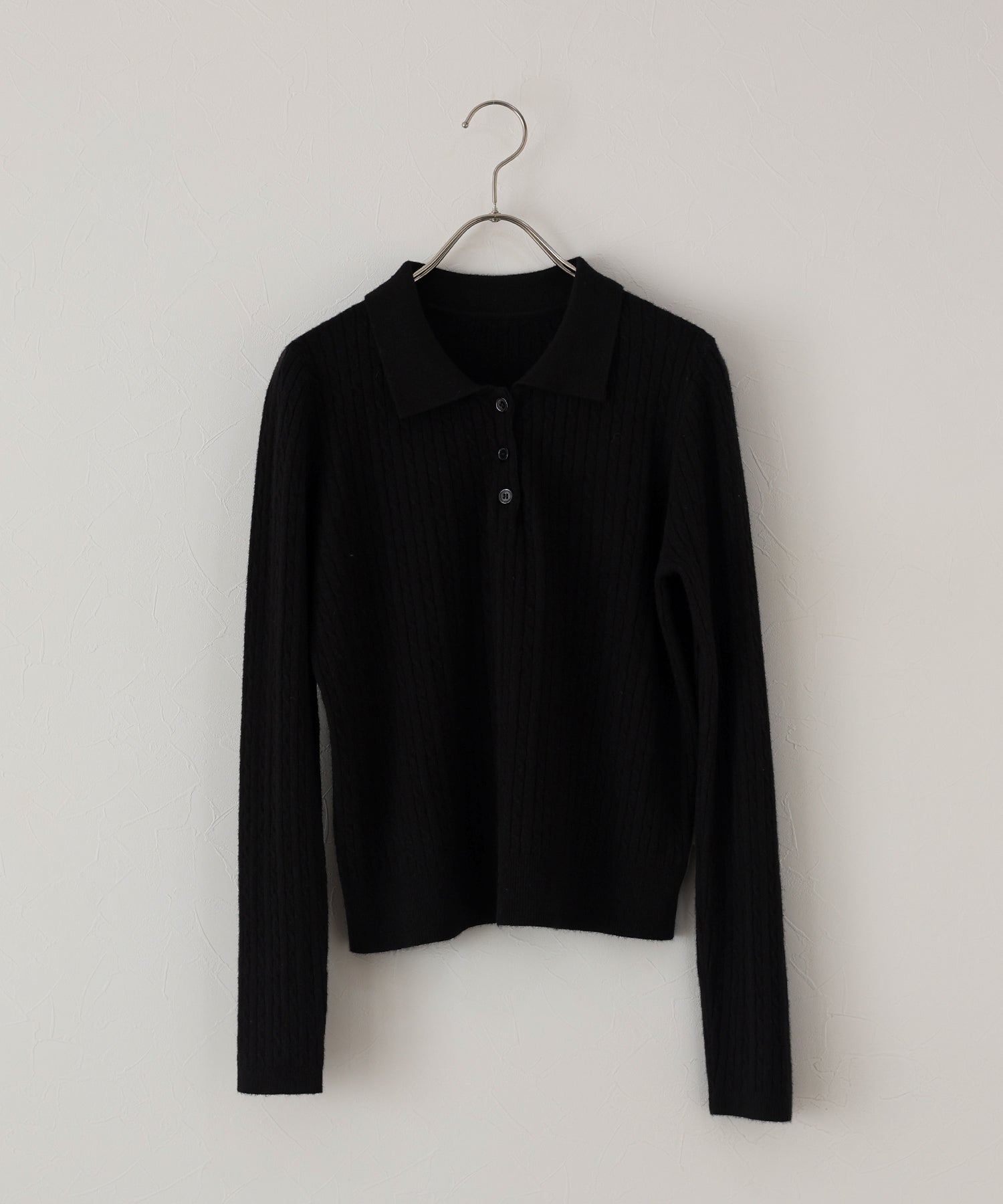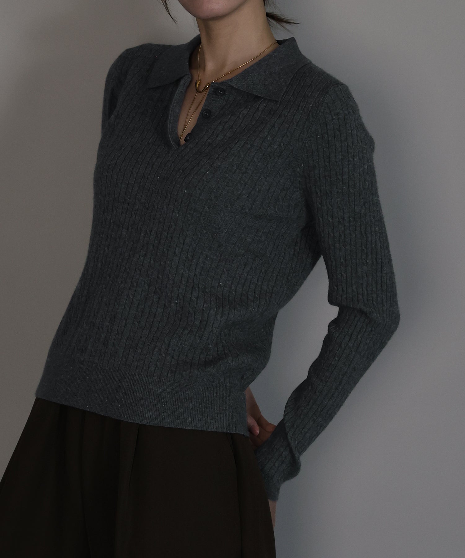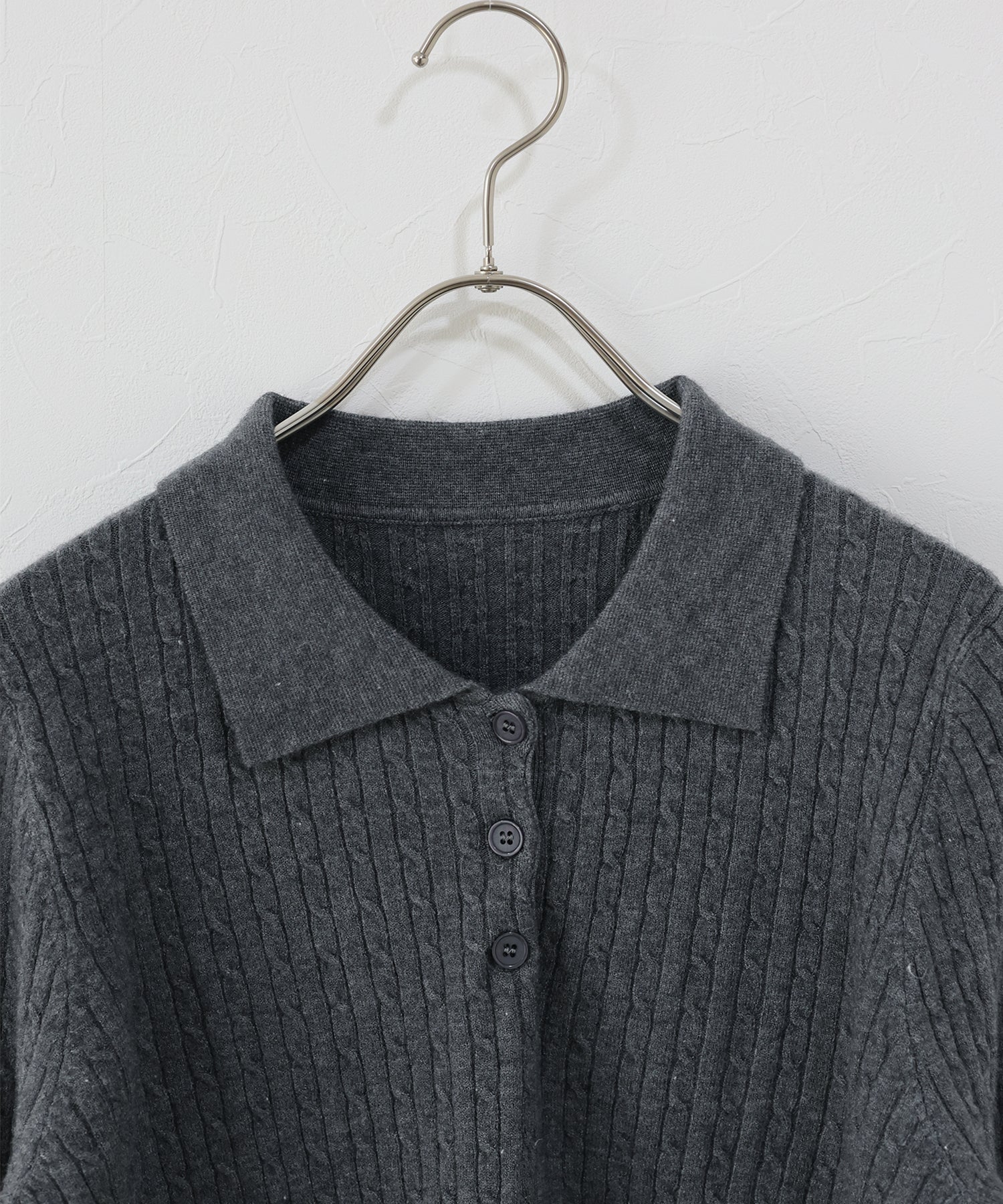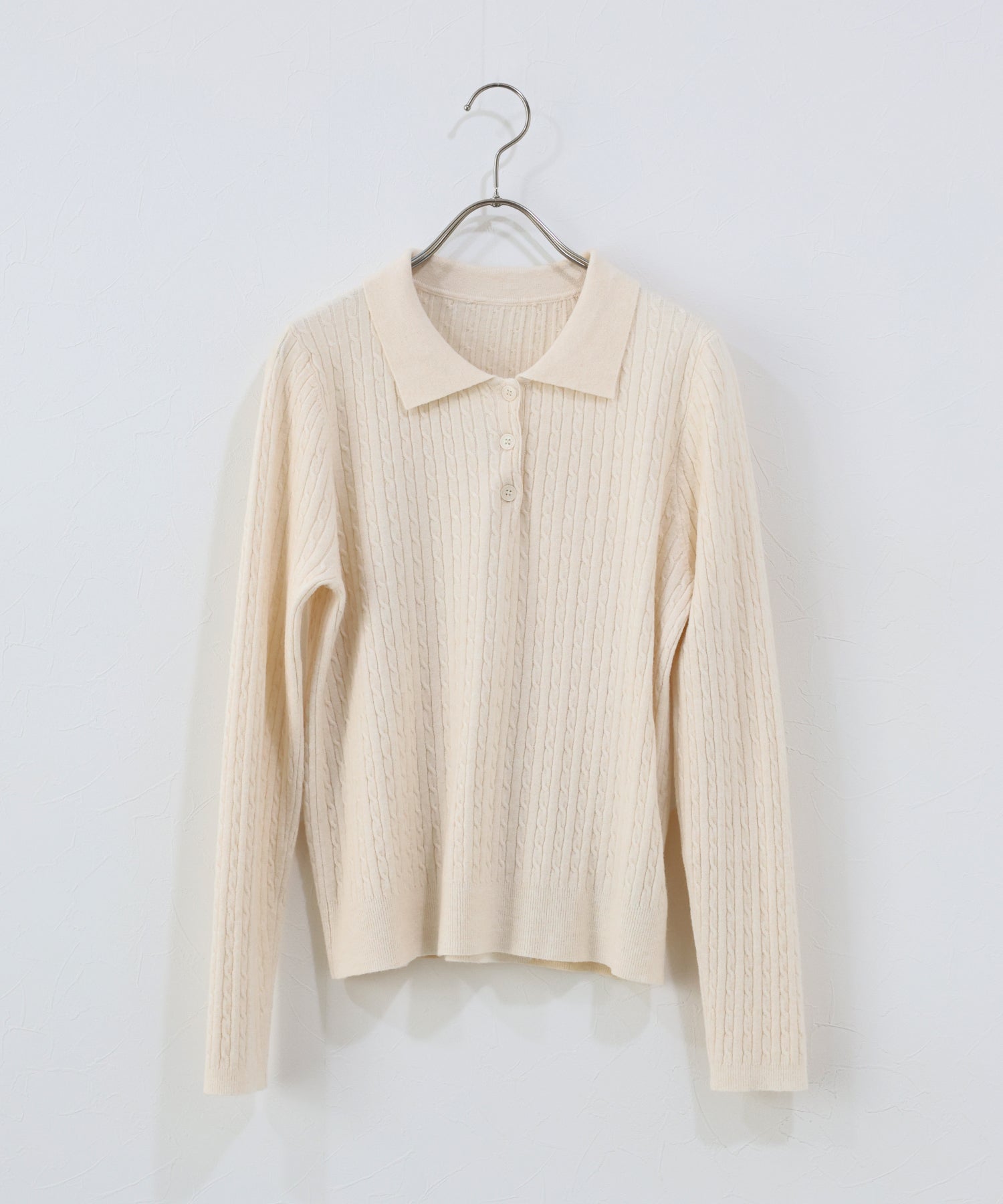 立体感のあるケーブル編みと、首元の3つのボタンがさりげないアクセントになったポロ襟ニット。
