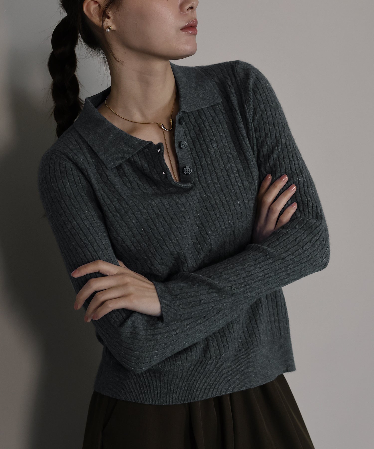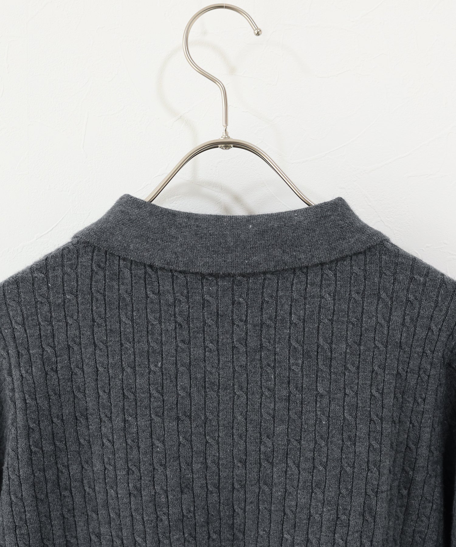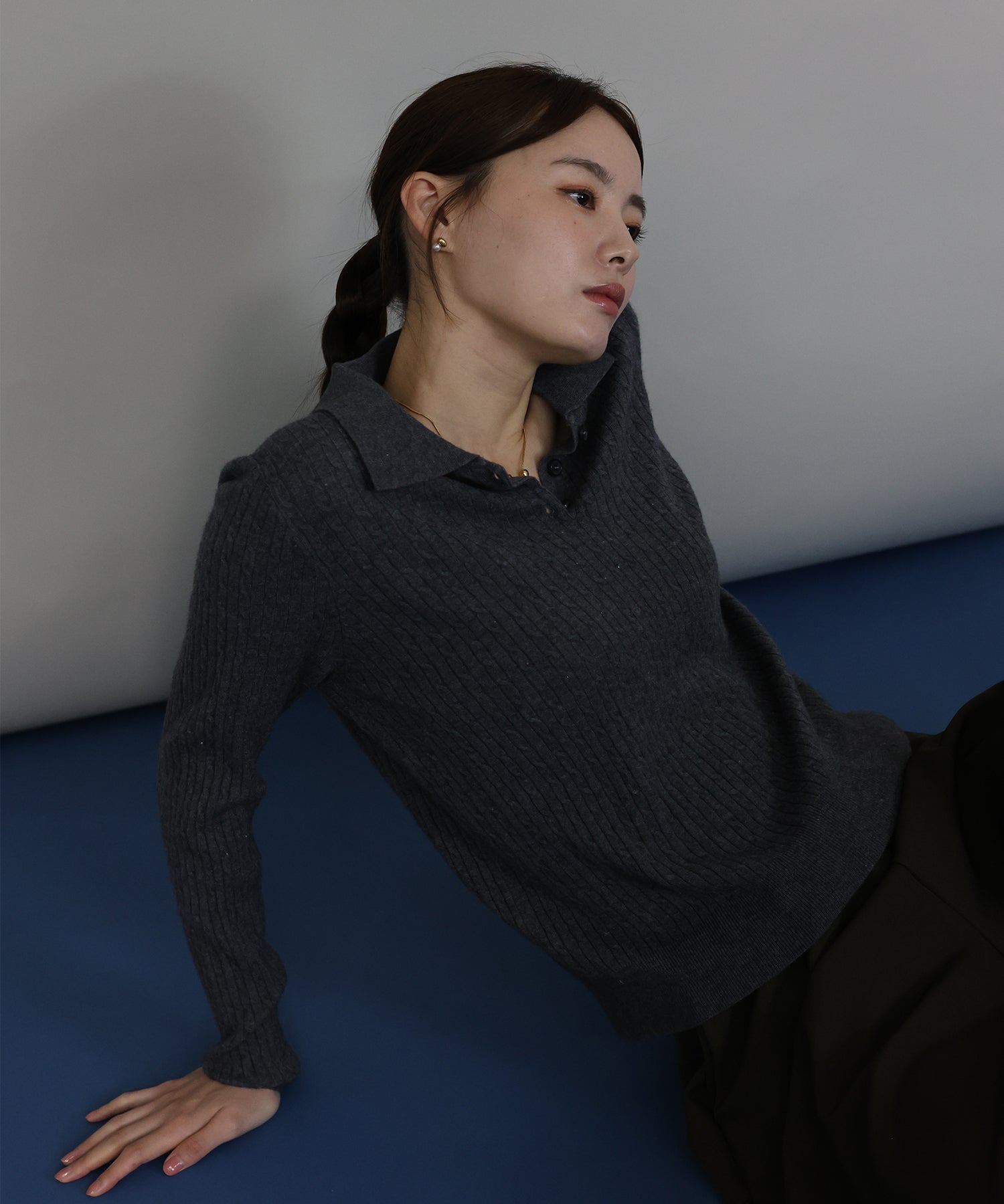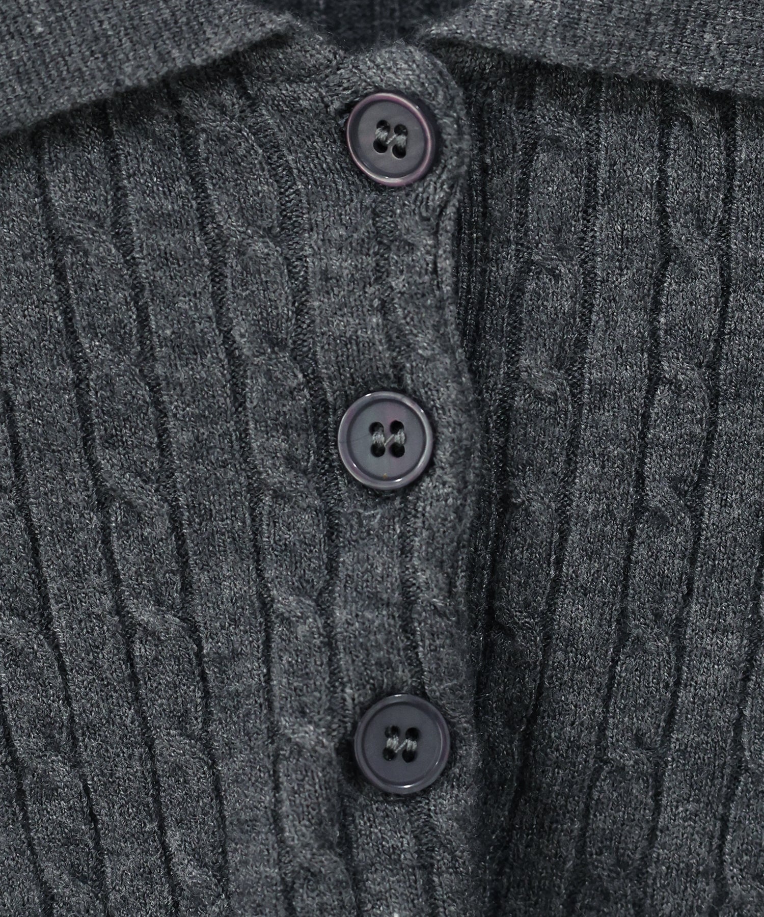 立体感のあるケーブル編みと、首元の3つのボタンがさりげないアクセントになったポロ襟ニット。