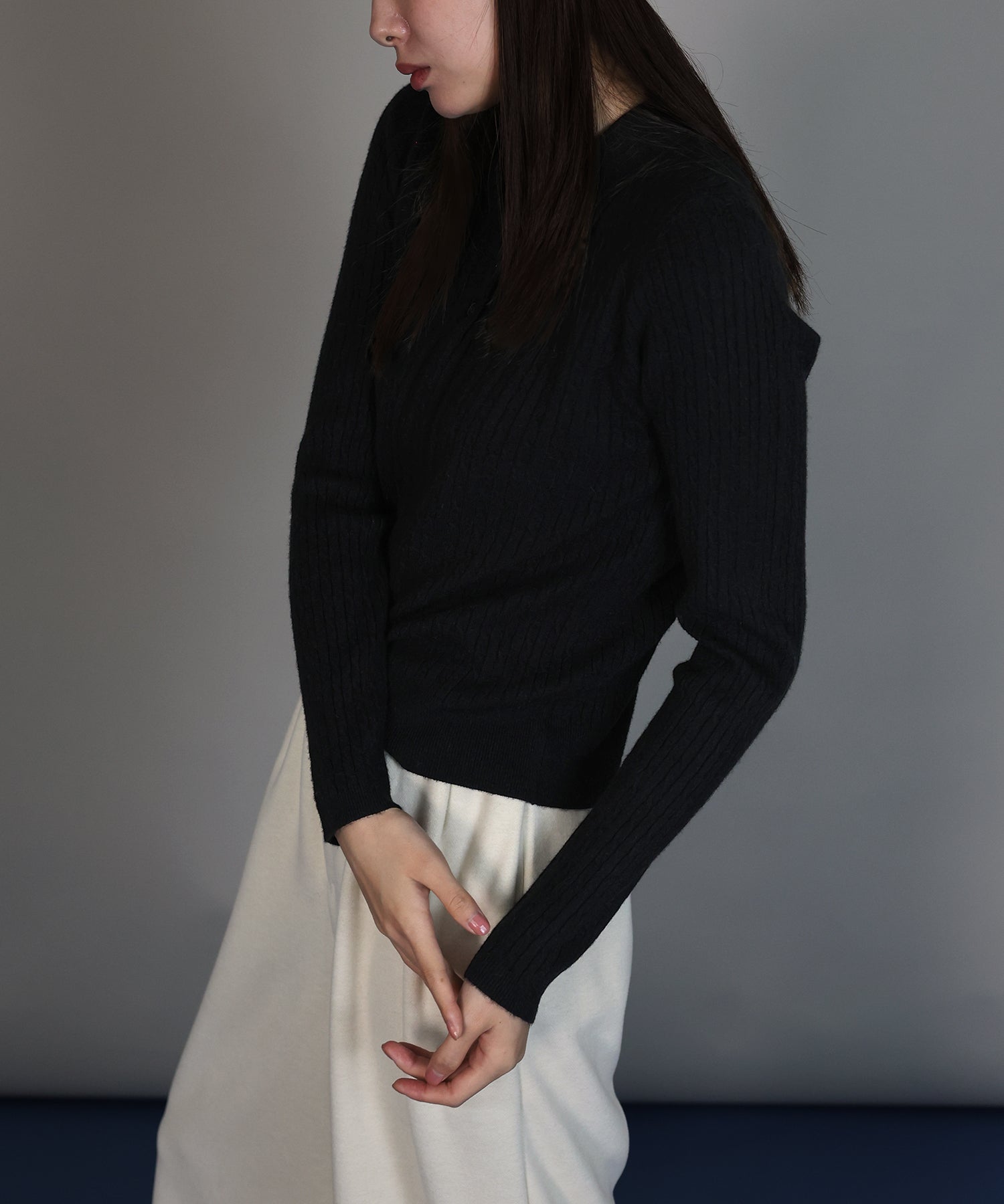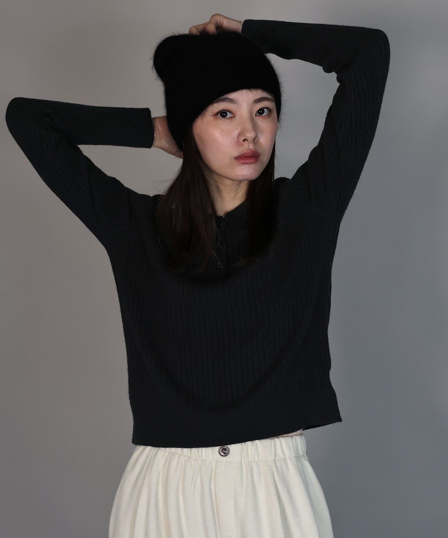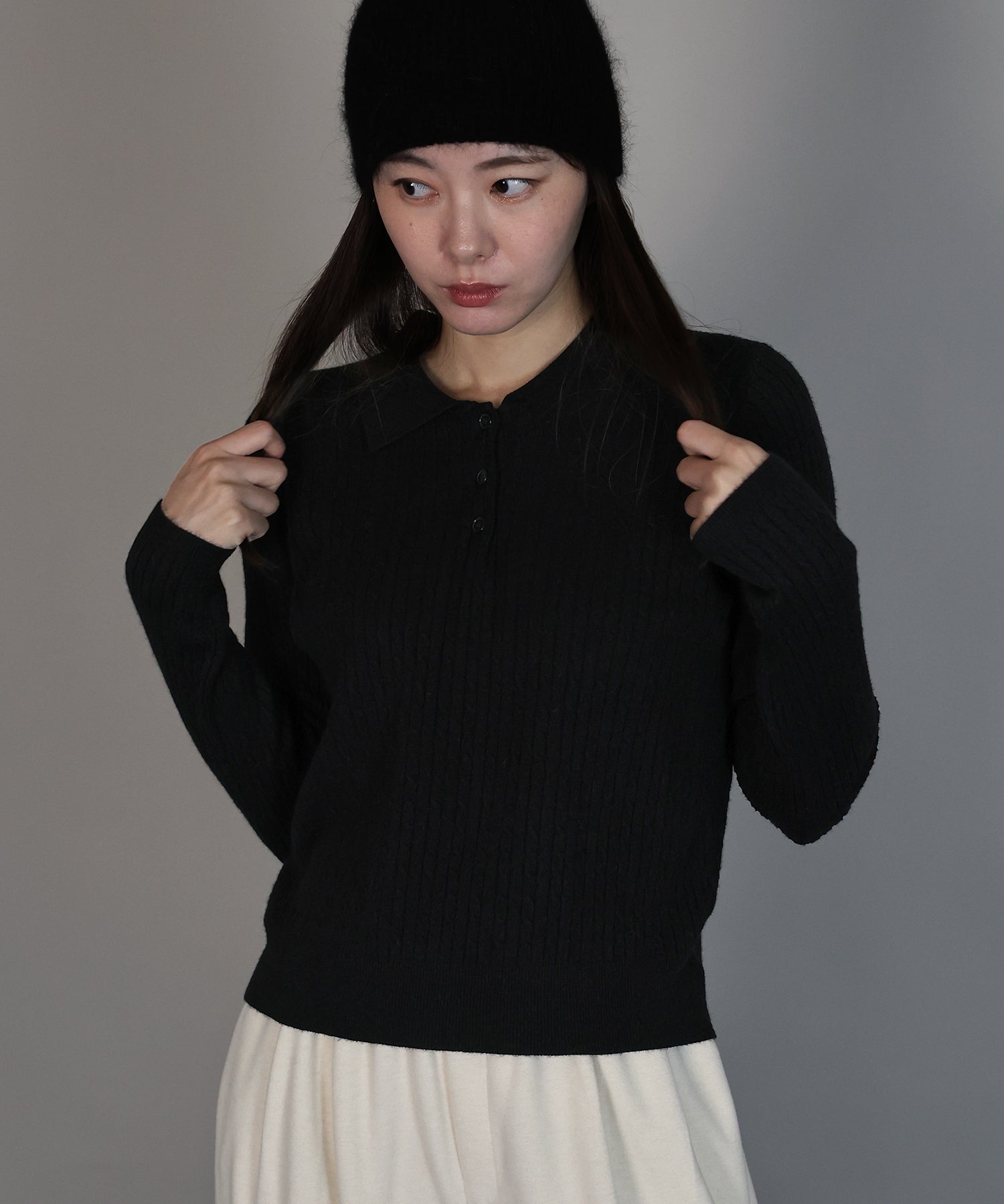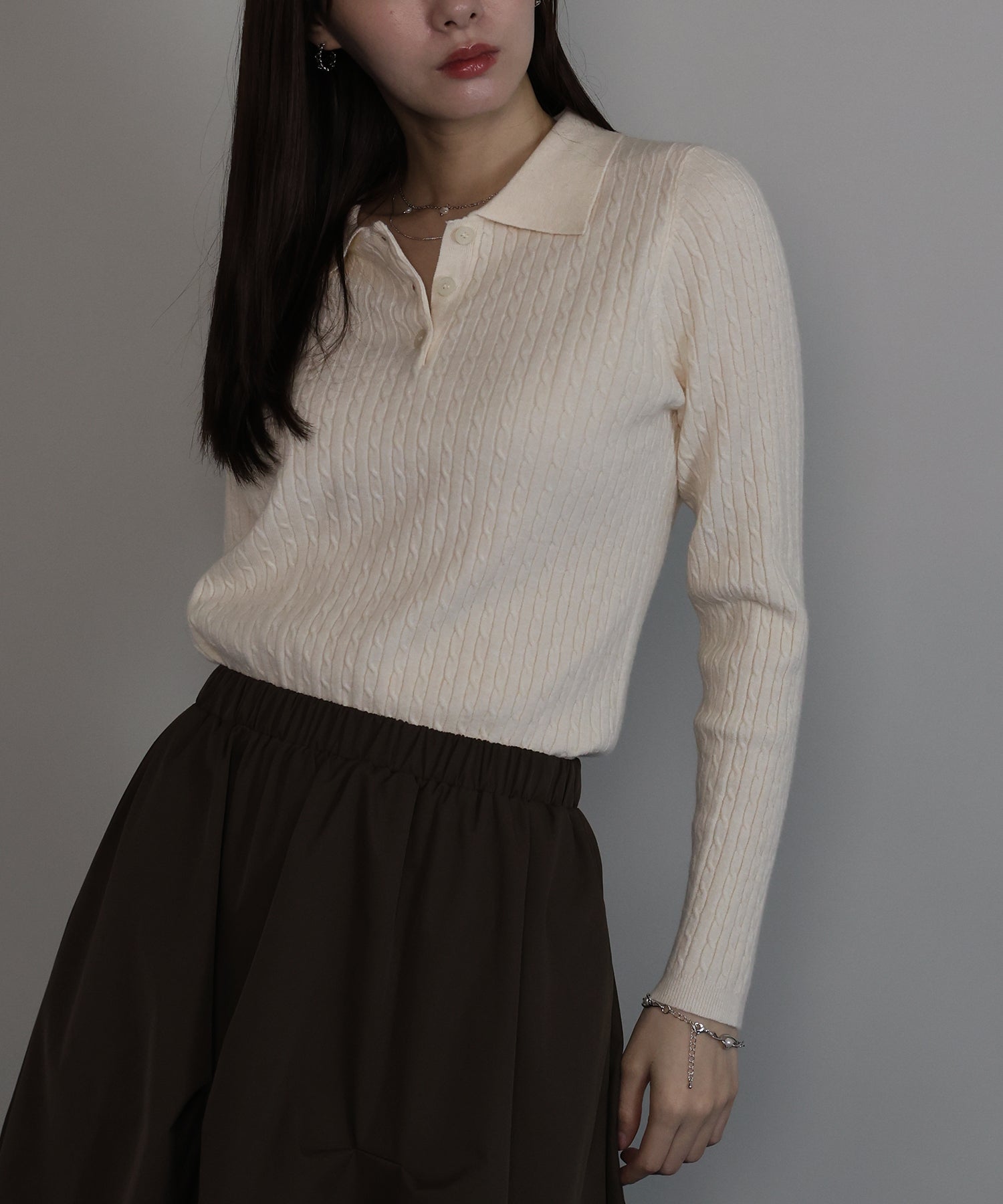 立体感のあるケーブル編みと、首元の3つのボタンがさりげないアクセントになったポロ襟ニット。