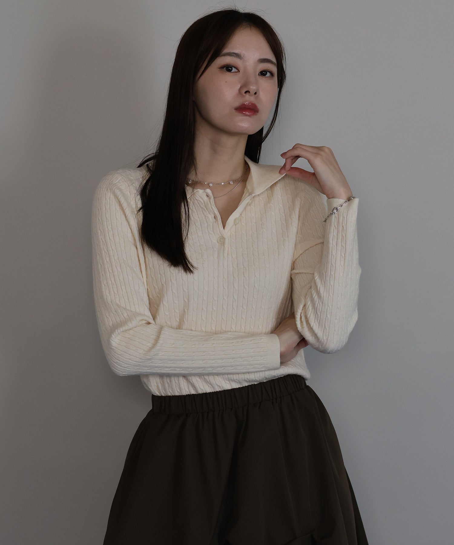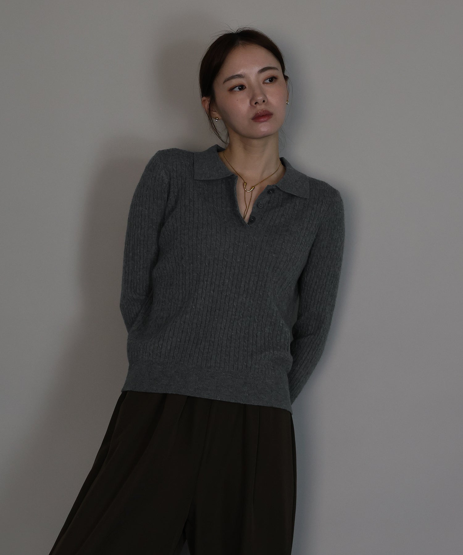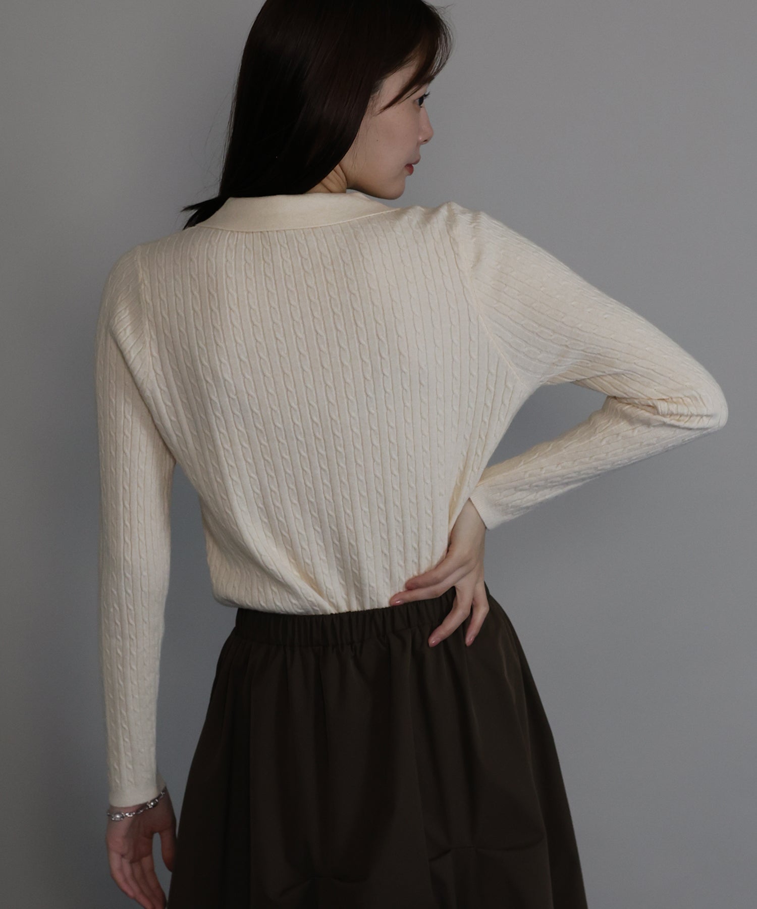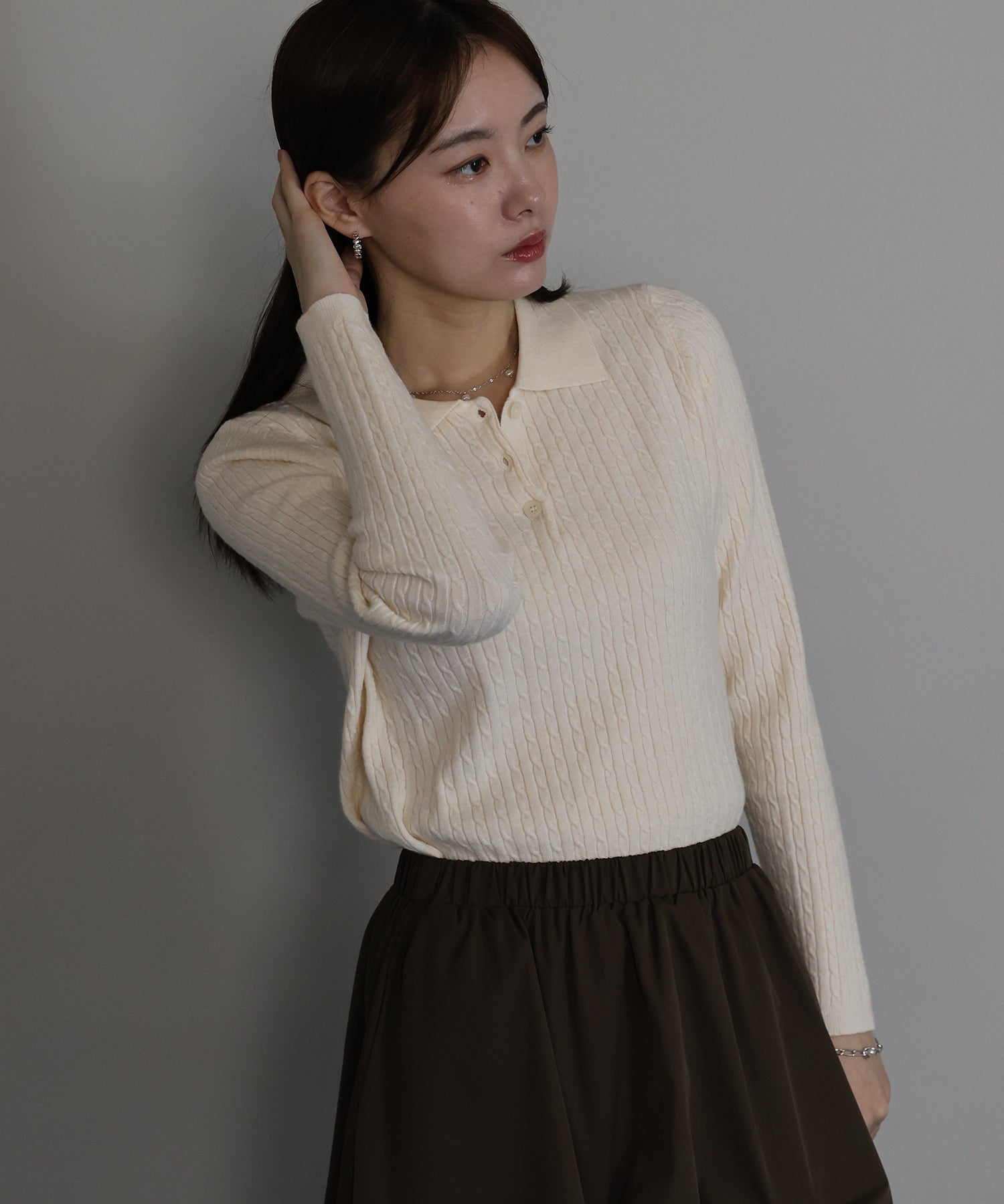 シンプルで着回し力抜群のケーブルポロ襟ニット