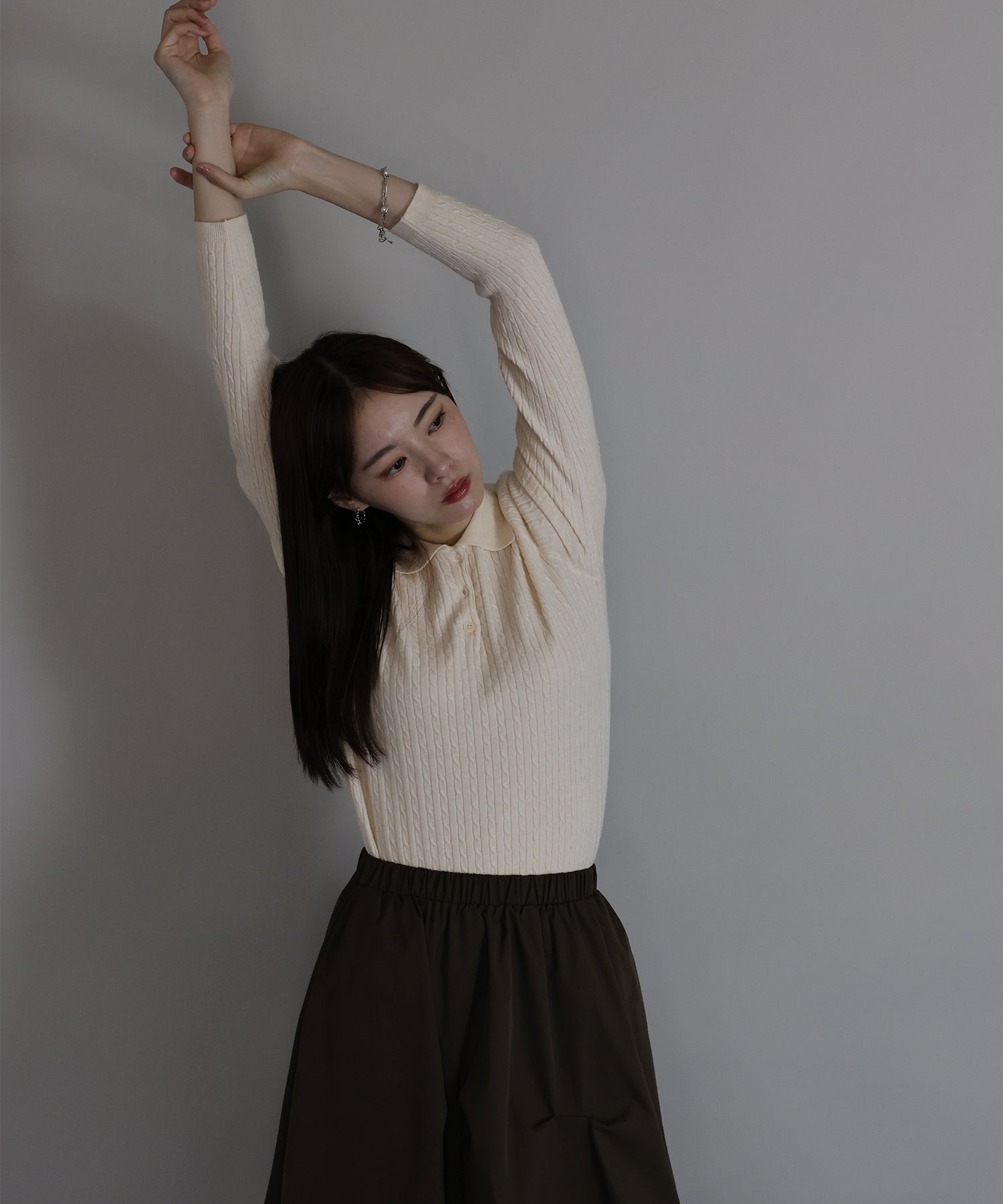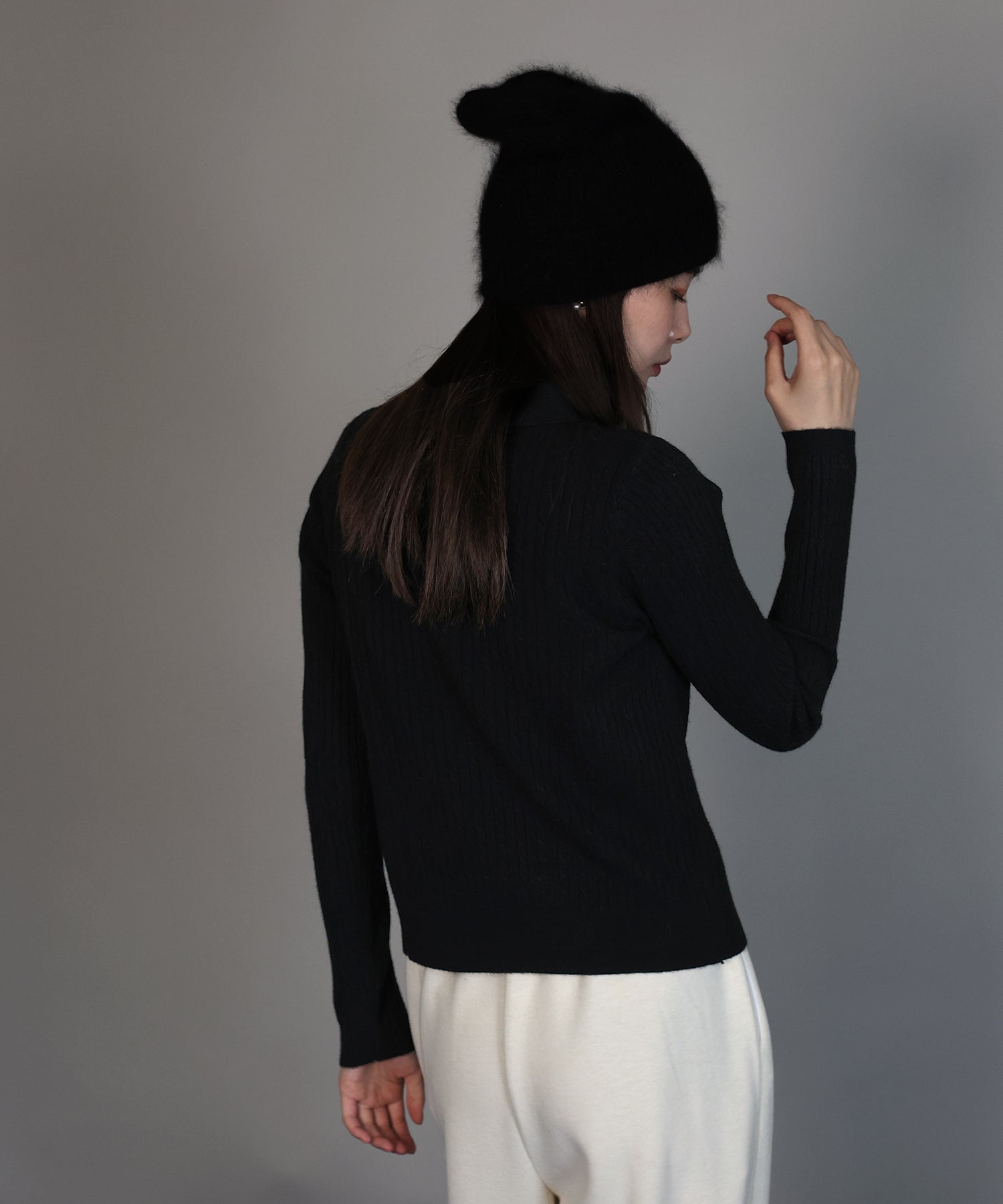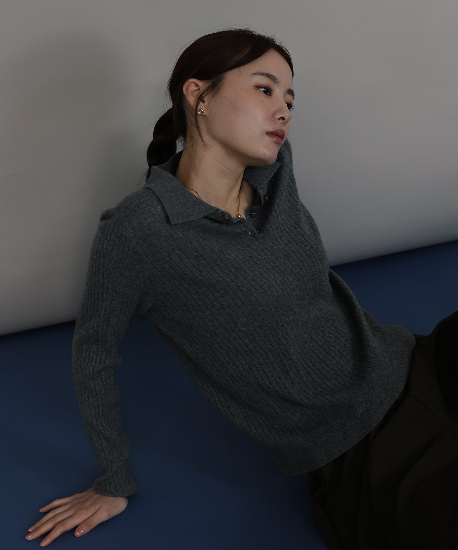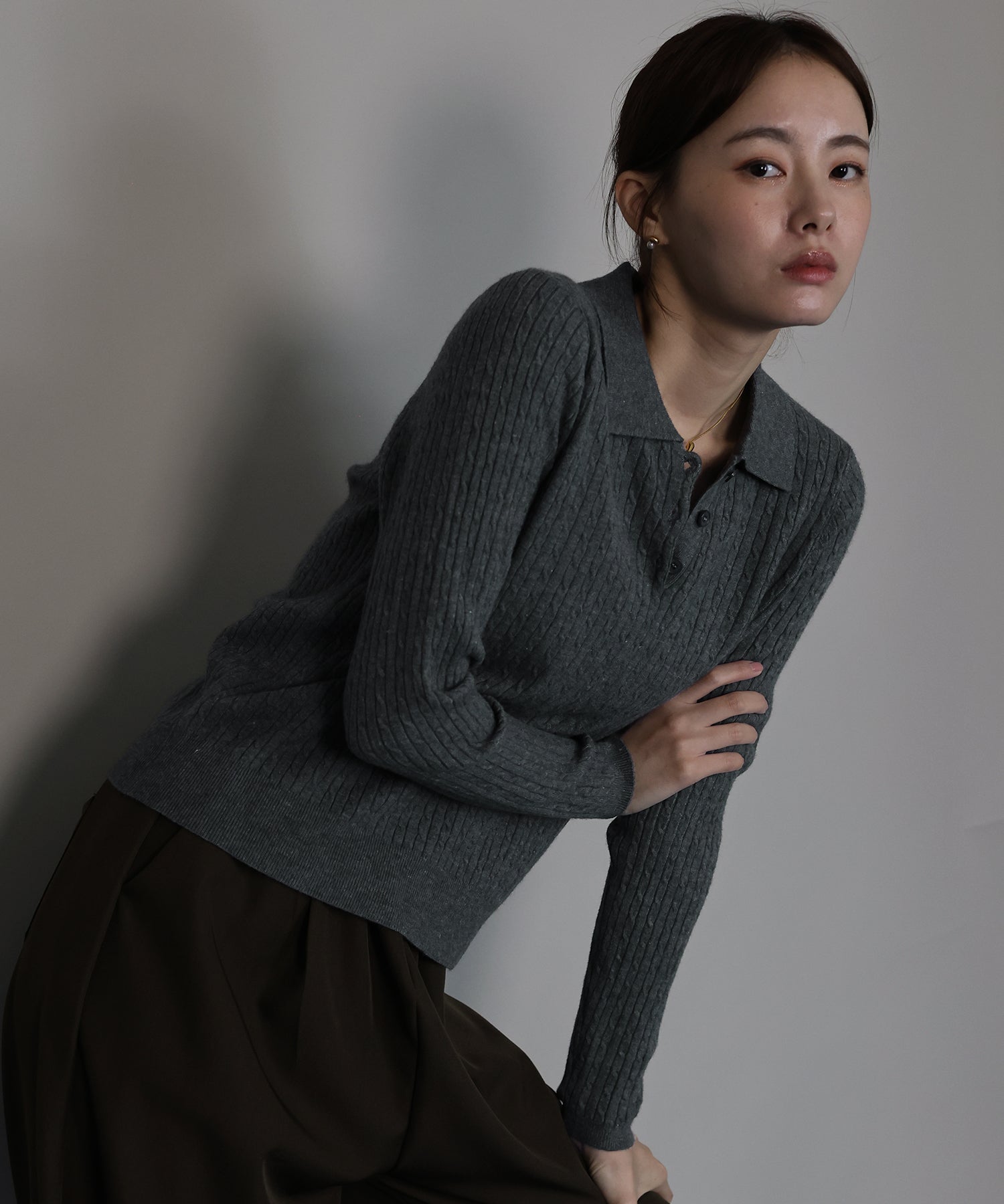シンプルで着回し力抜群のケーブルポロ襟ニット