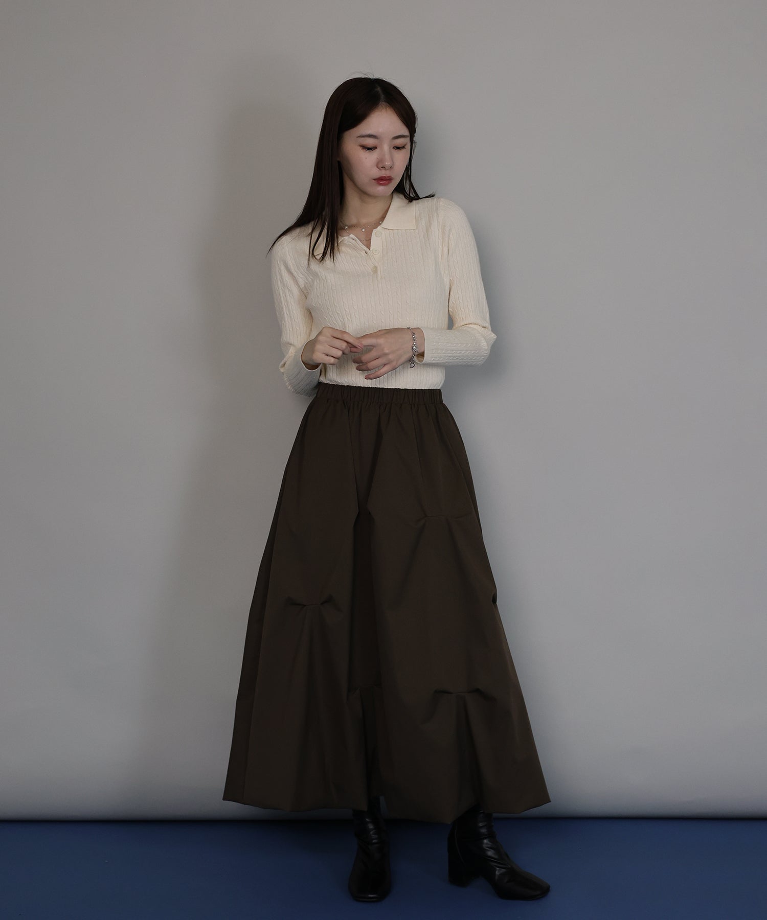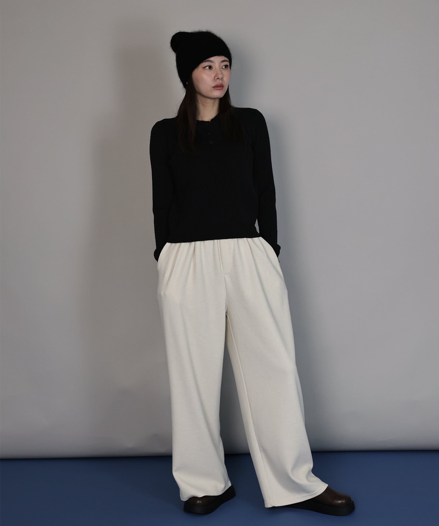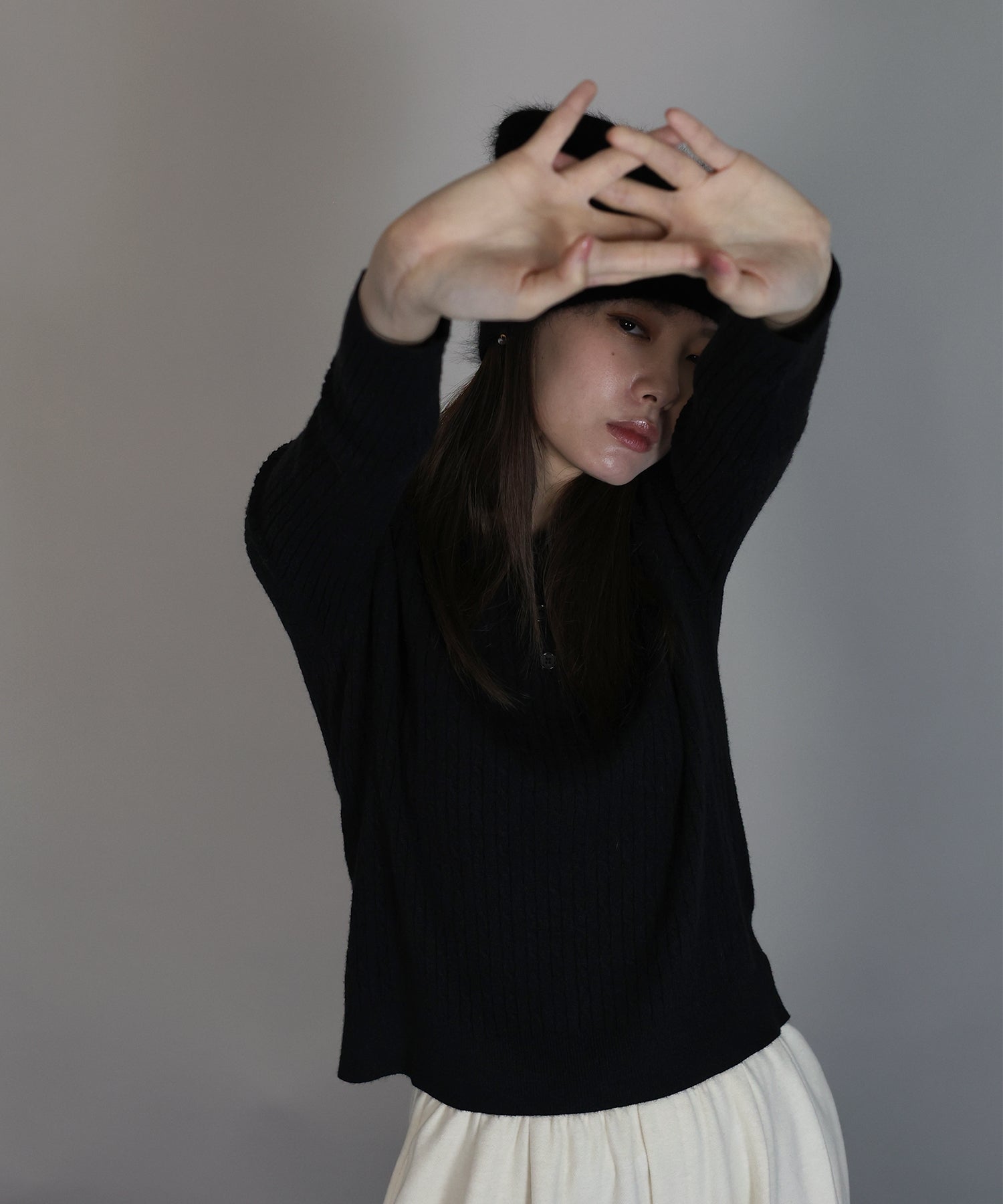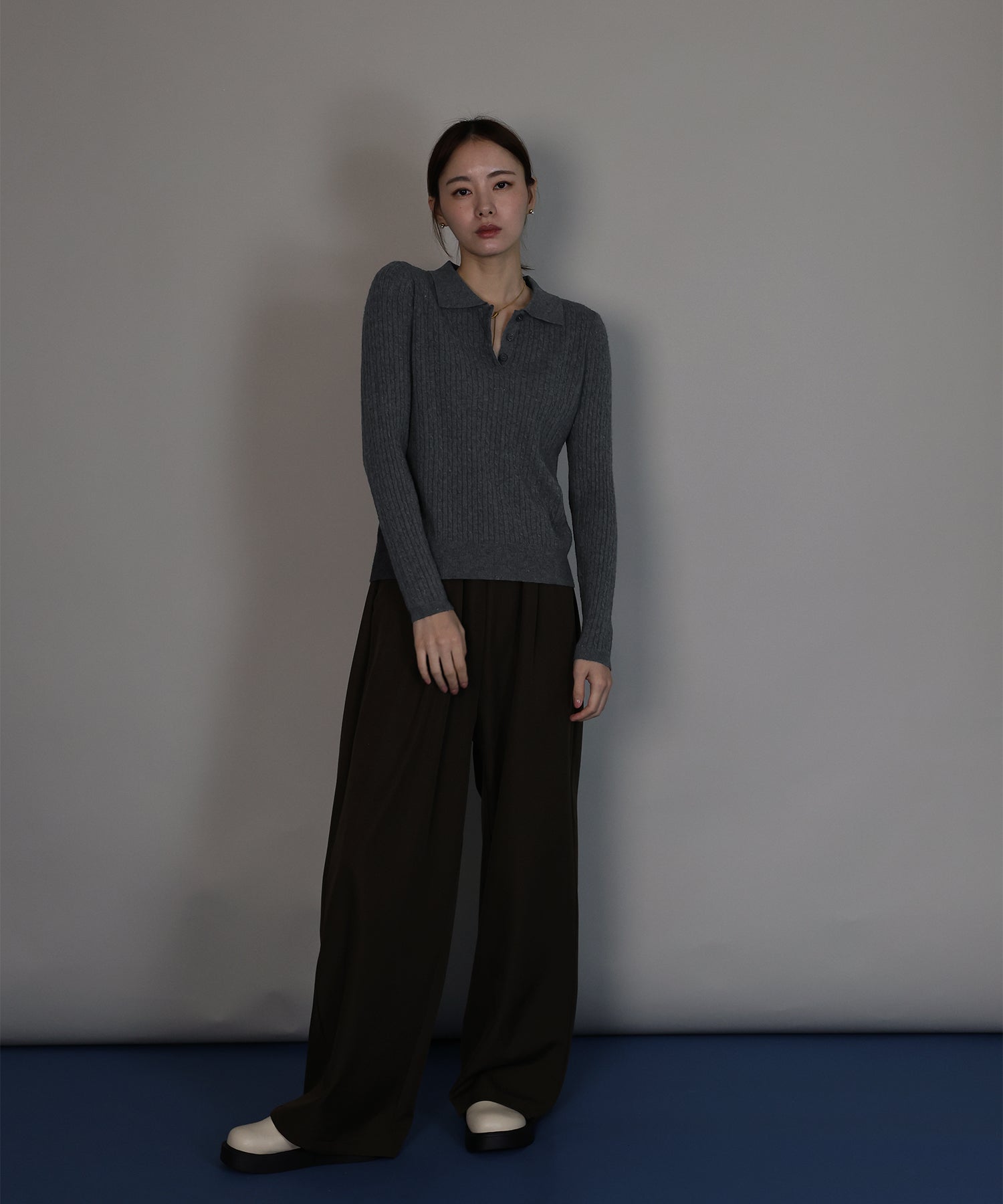 シンプルで着回し力抜群のケーブルポロ襟ニット