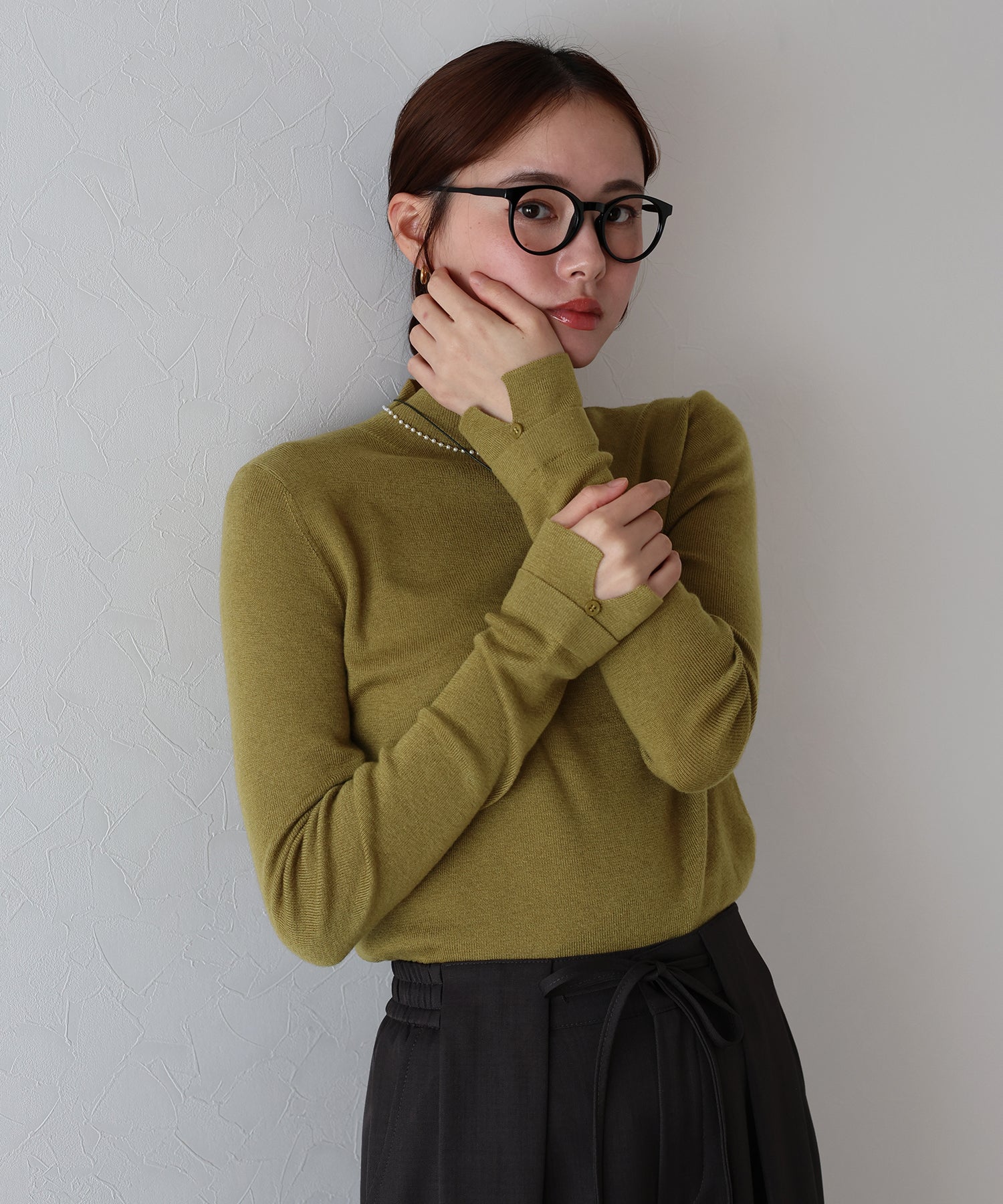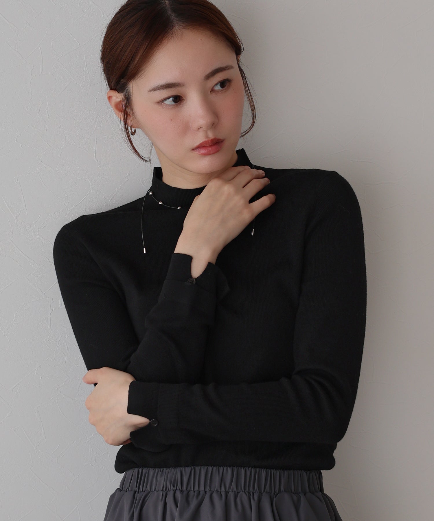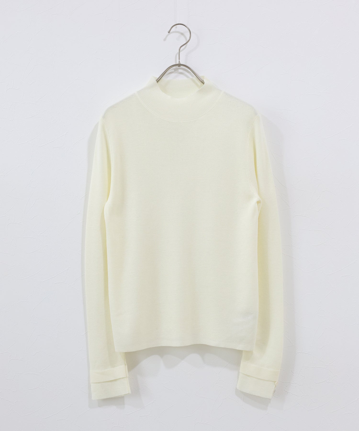 柔らかな印象のラウンドハイネックが上品さを引き立てるニットトップス。