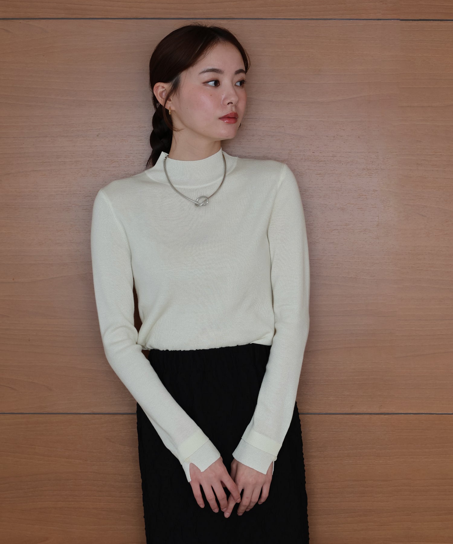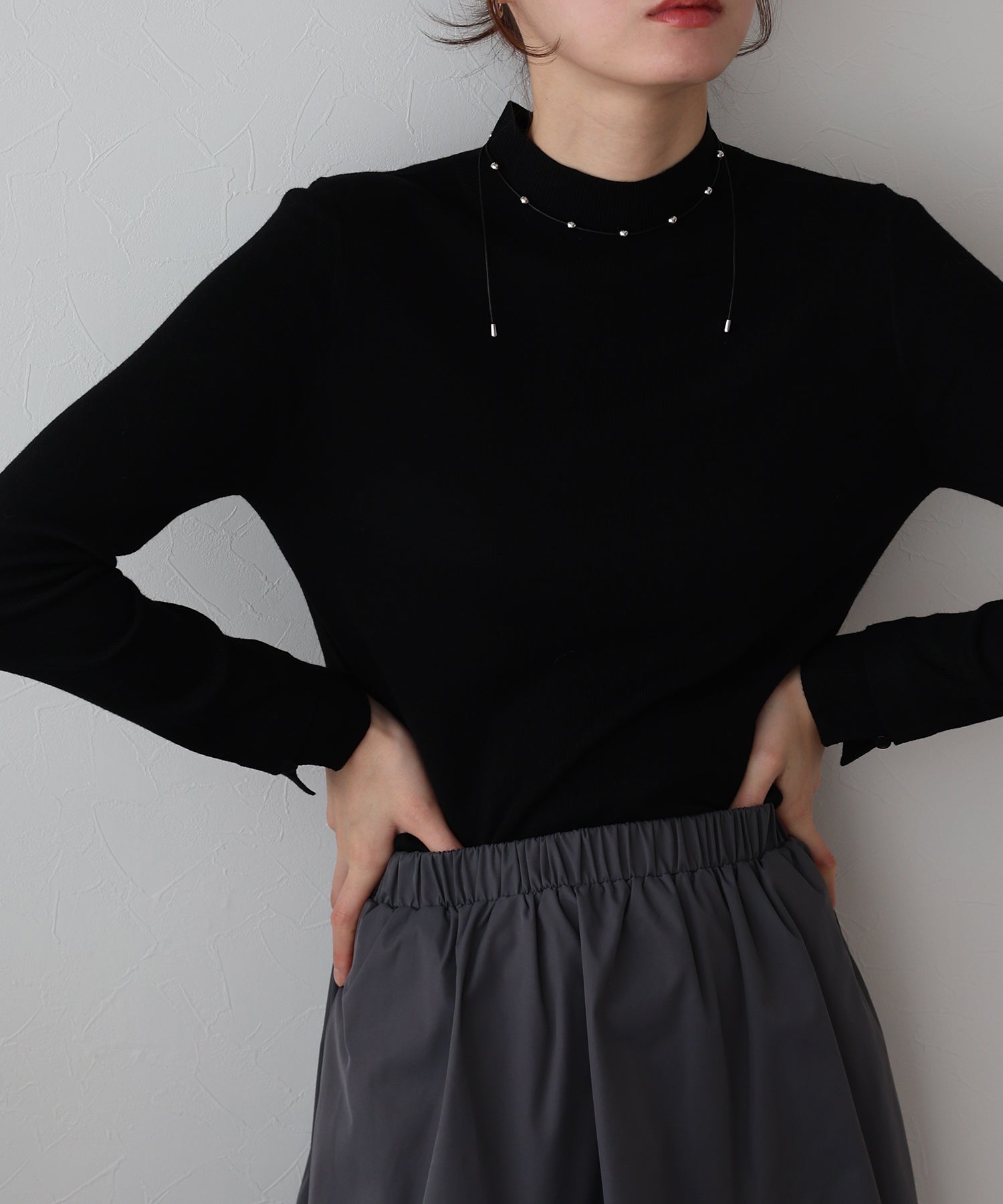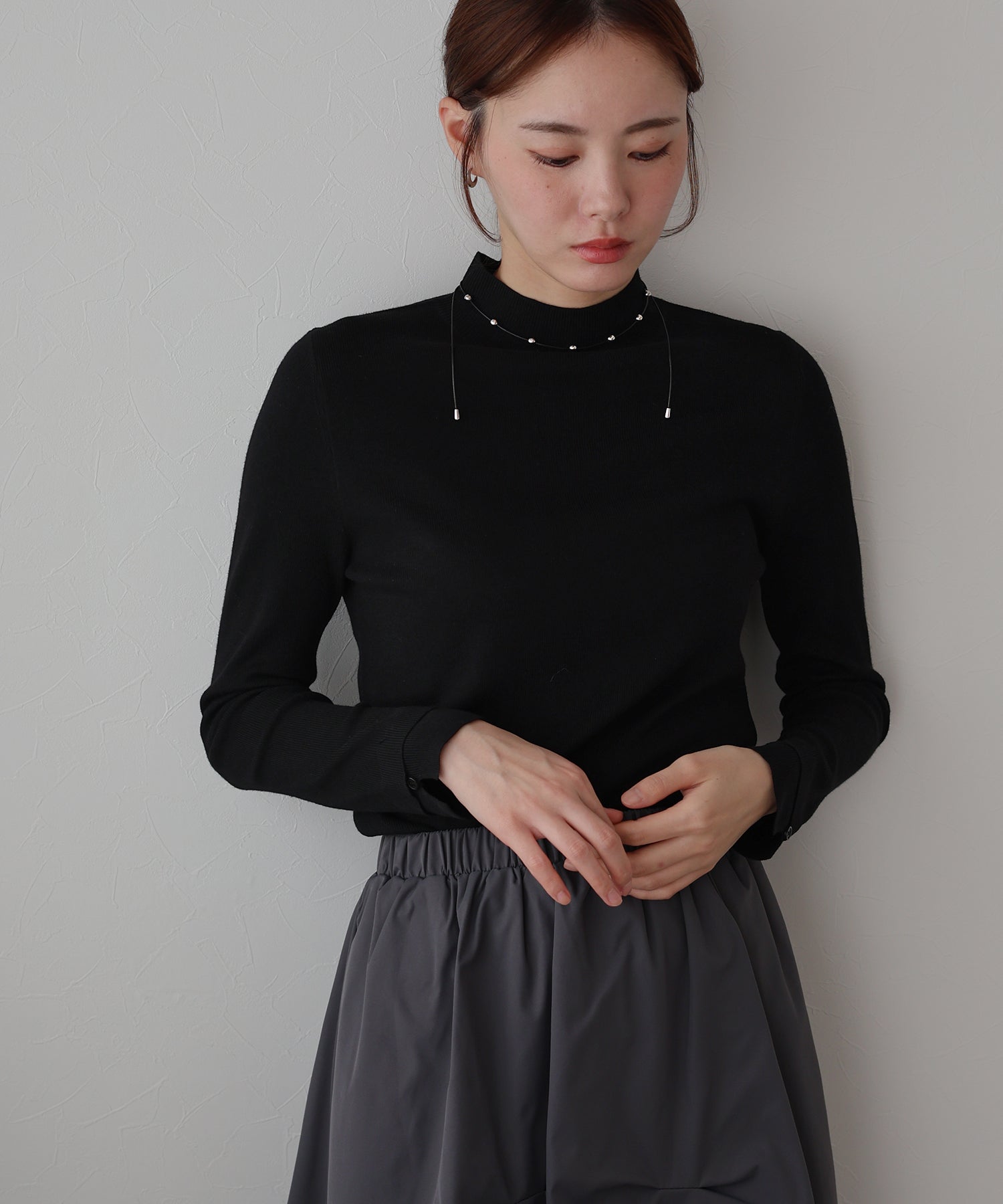 柔らかな印象のラウンドハイネックが上品さを引き立てるニットトップス。
