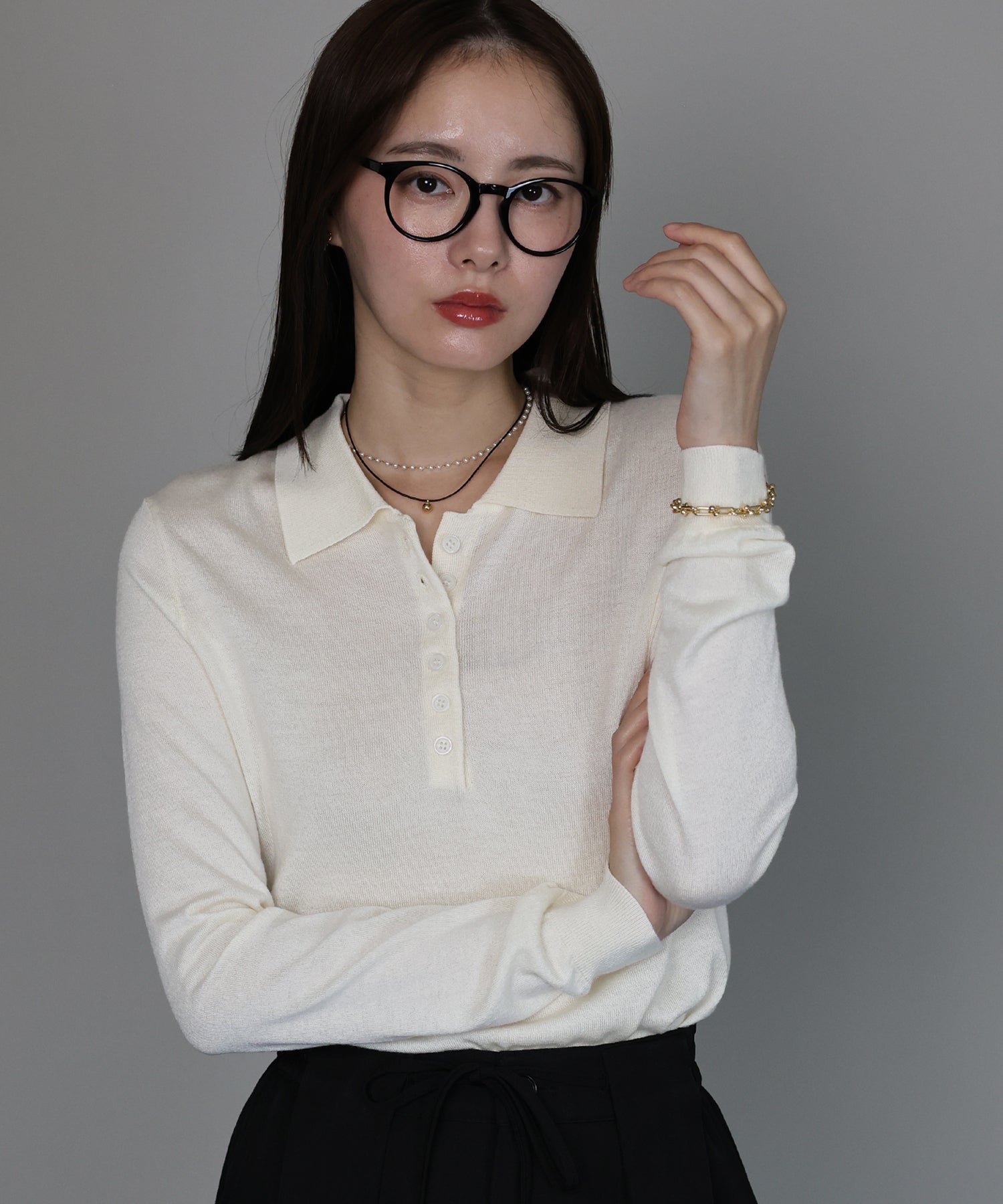 センタープレスパンツやタイトスカートを合わせれば、オフィスシーンにも対応できるきれいめスタイルに。