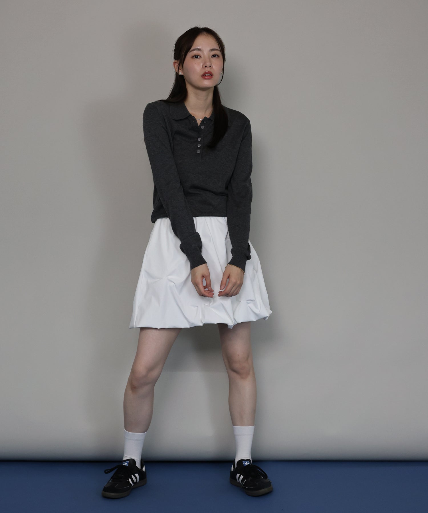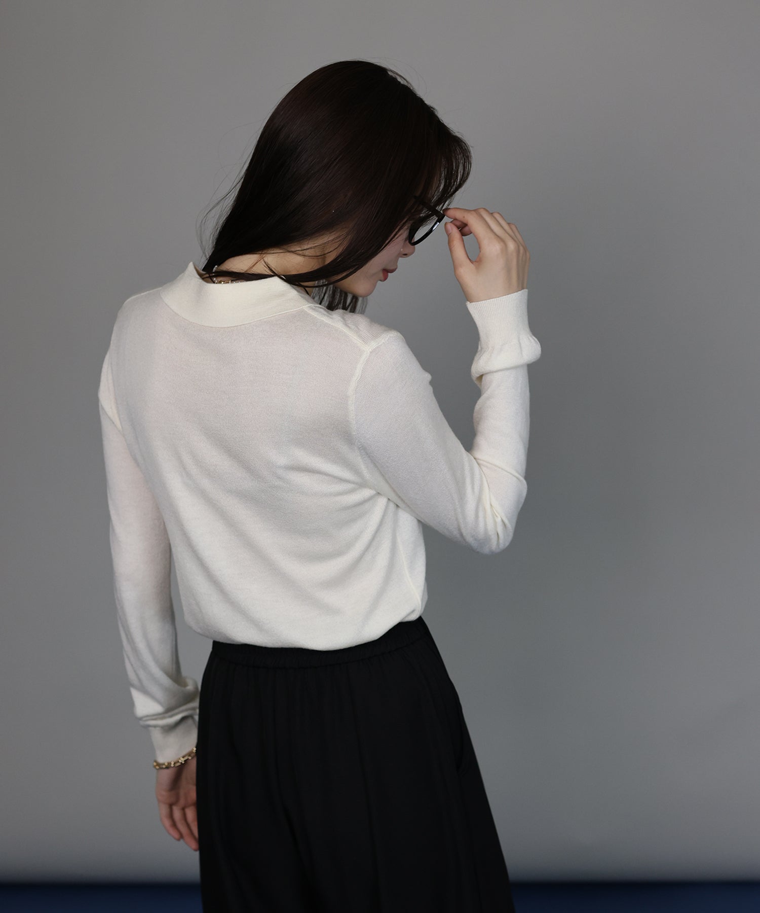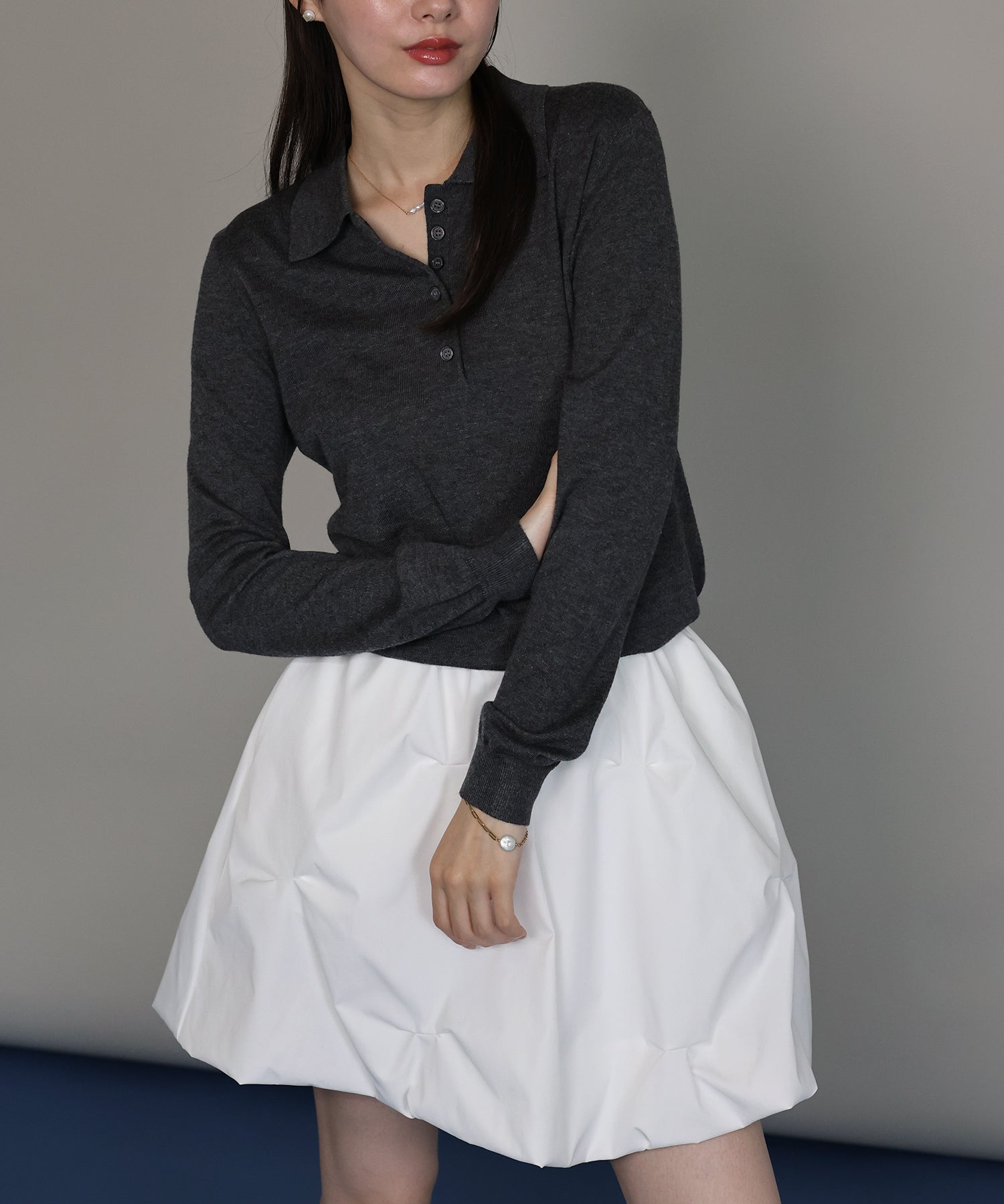 すっきりとしたシルエットで、長袖でも重たく見えずスマートな印象に。