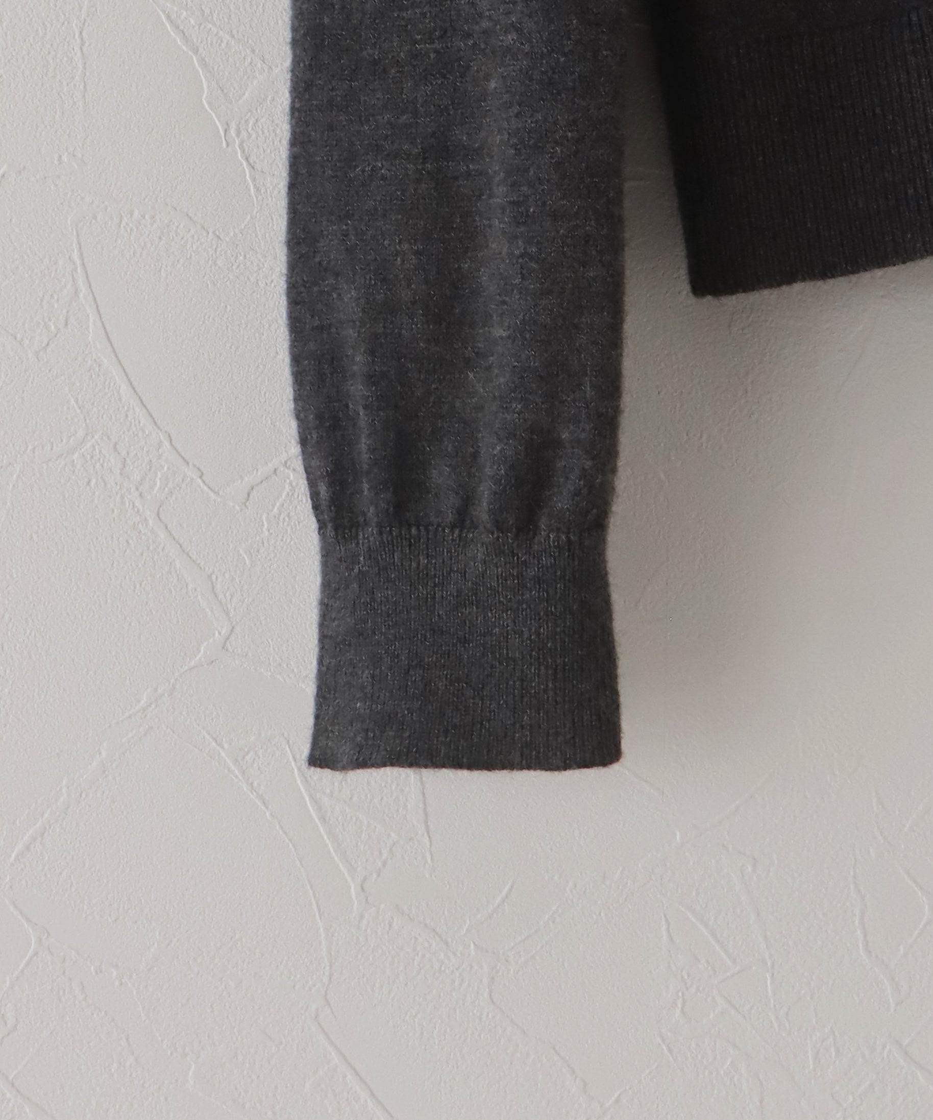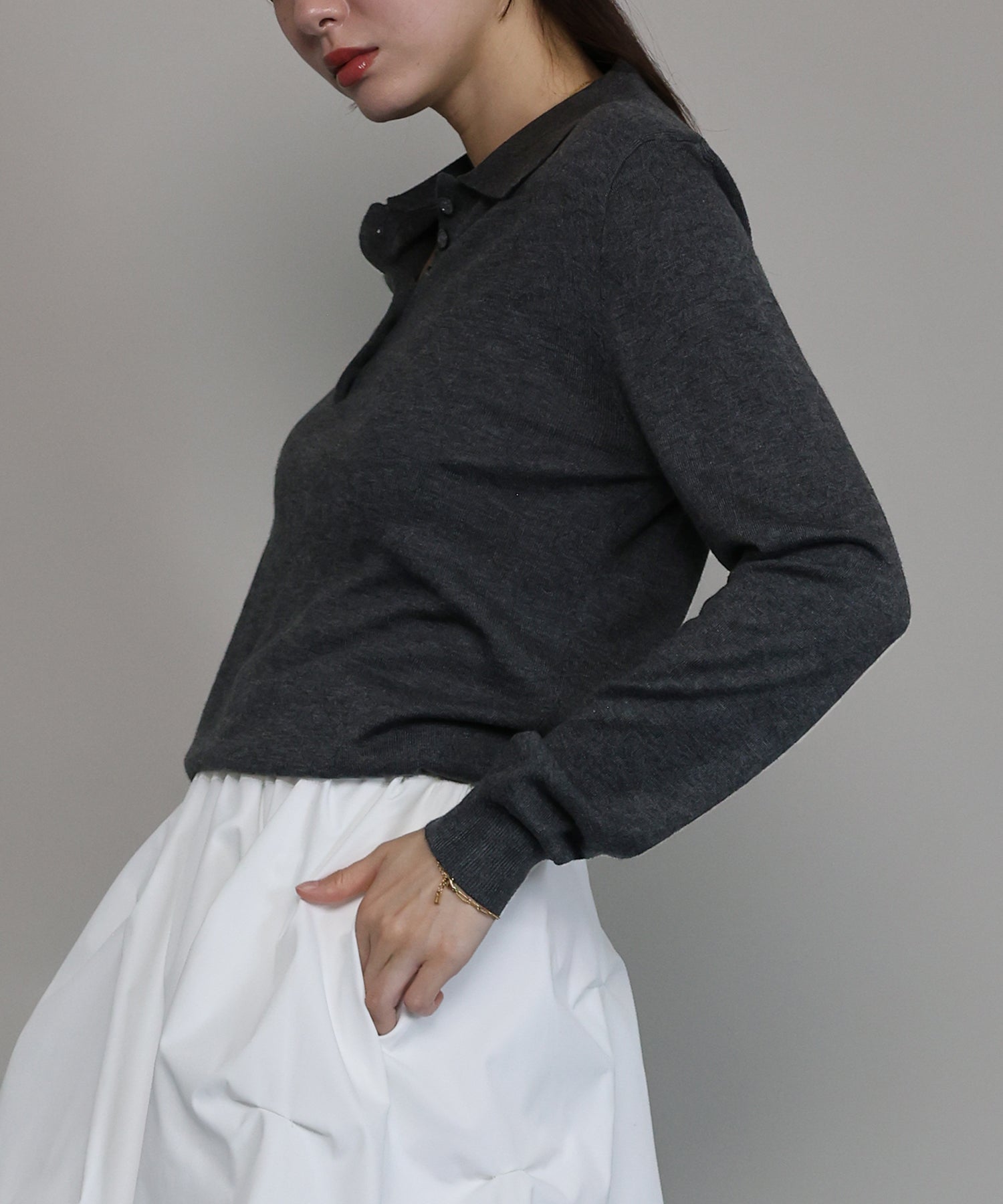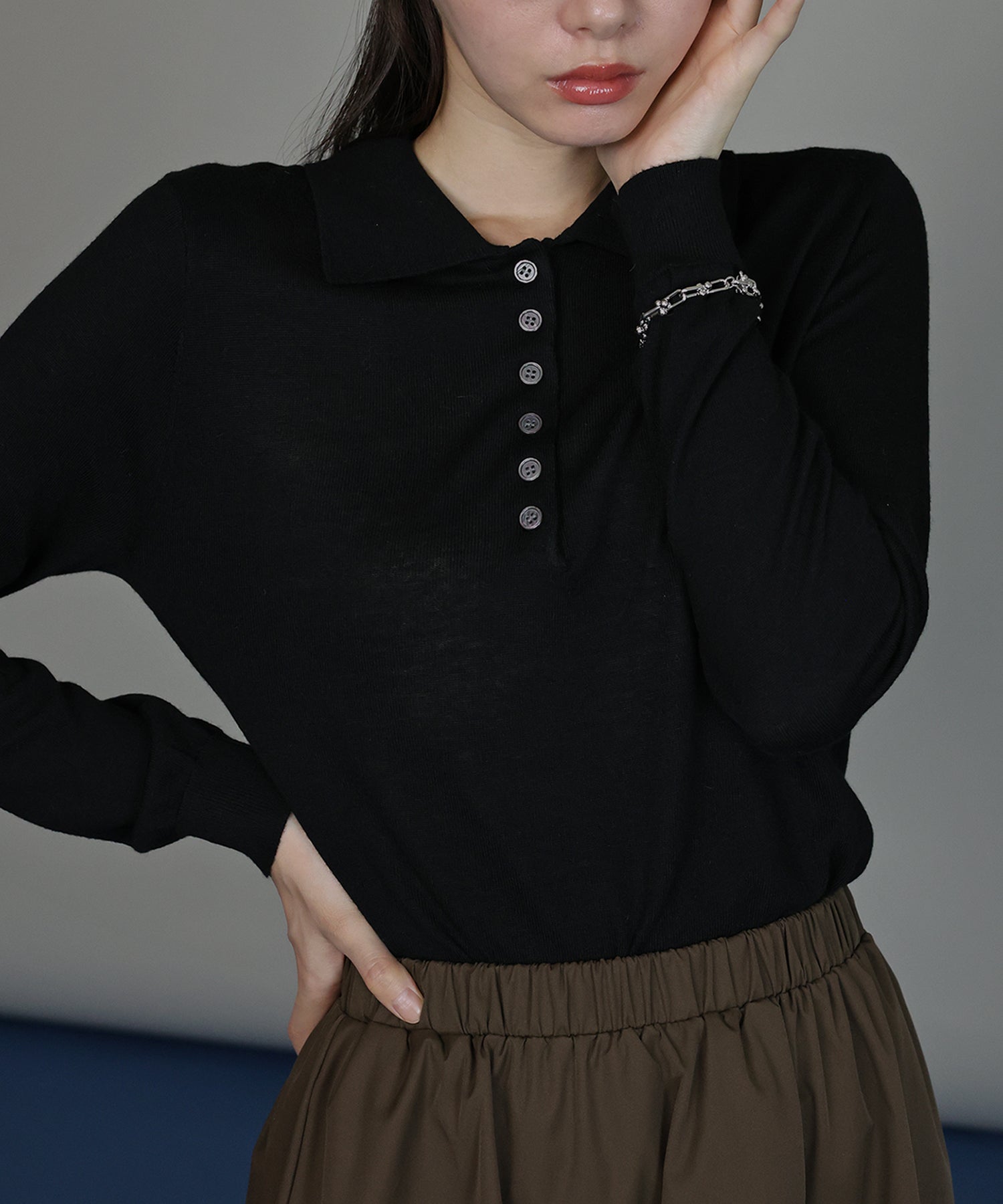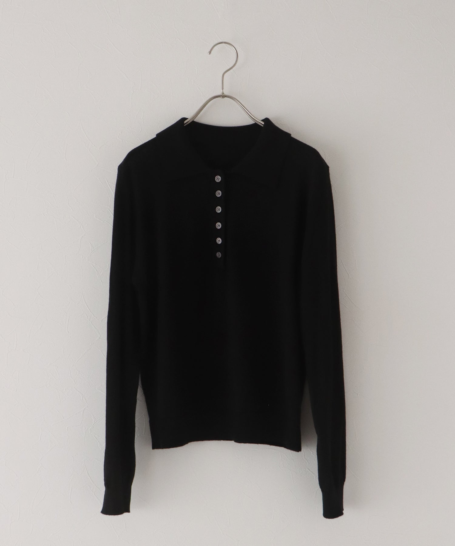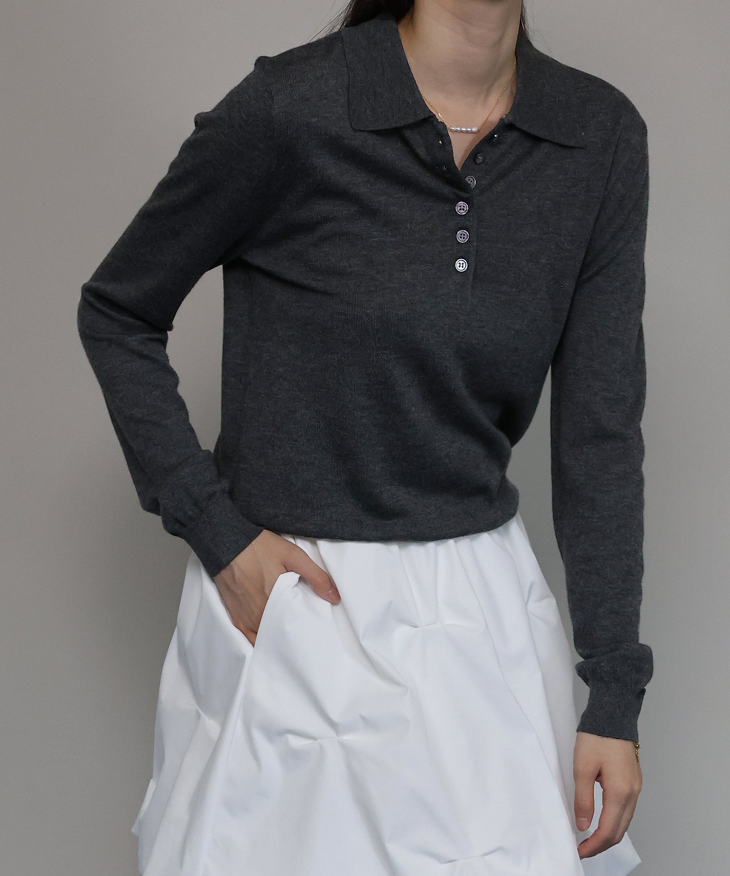 上質なウール混素材を使用し、薄手ながらも程よいあたたかみを感じられるポロニット。